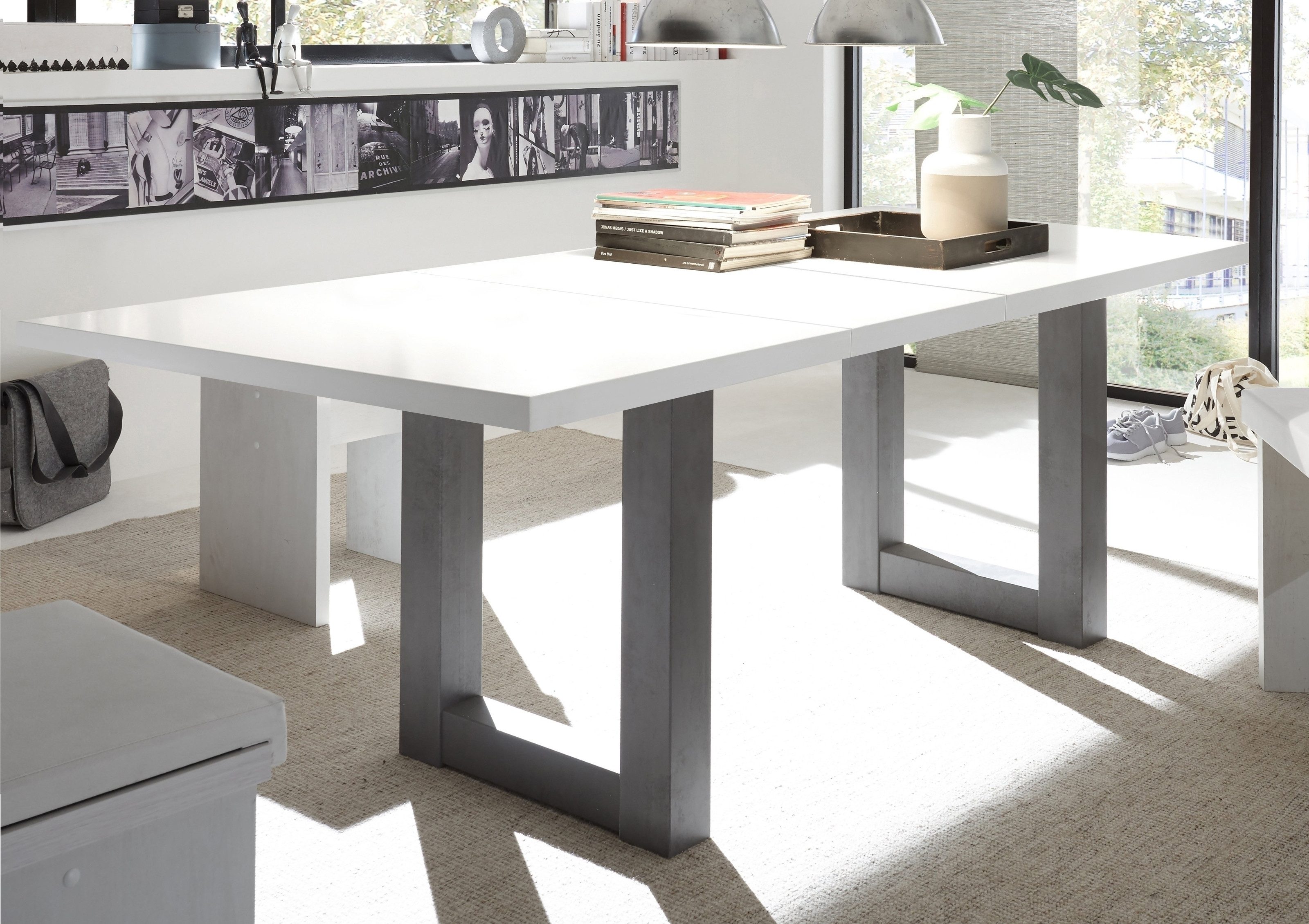 Modernes Design: Der Esstisch Big System besticht durch seine zeitgemäße Ästhetik mit einem U-förmigen Gestell und einer eleganten Tischplatte in mattem Weiß.