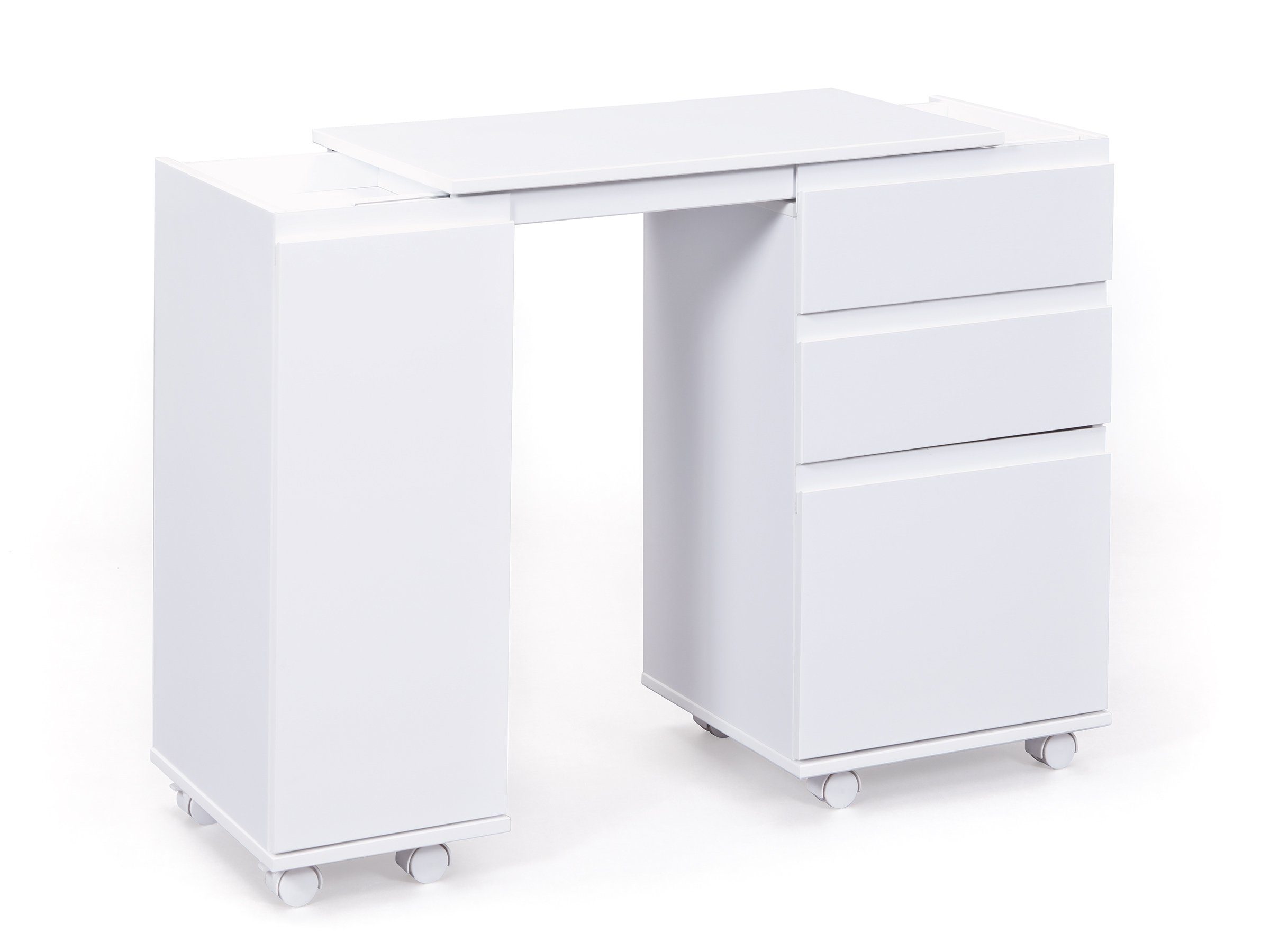 Funktionelles LAPTOP-OFFICE aus MDF. Weiß lackiert. Arbeitsbereich erweiterbar durch Auseinanderschieben der Container. Mit 8 Rollen. Container rechts mit drei leicht laufenden Schubladen, Container links mit großer Tür. Viel Platz für Notebook, Tablet PC und Untensilien!