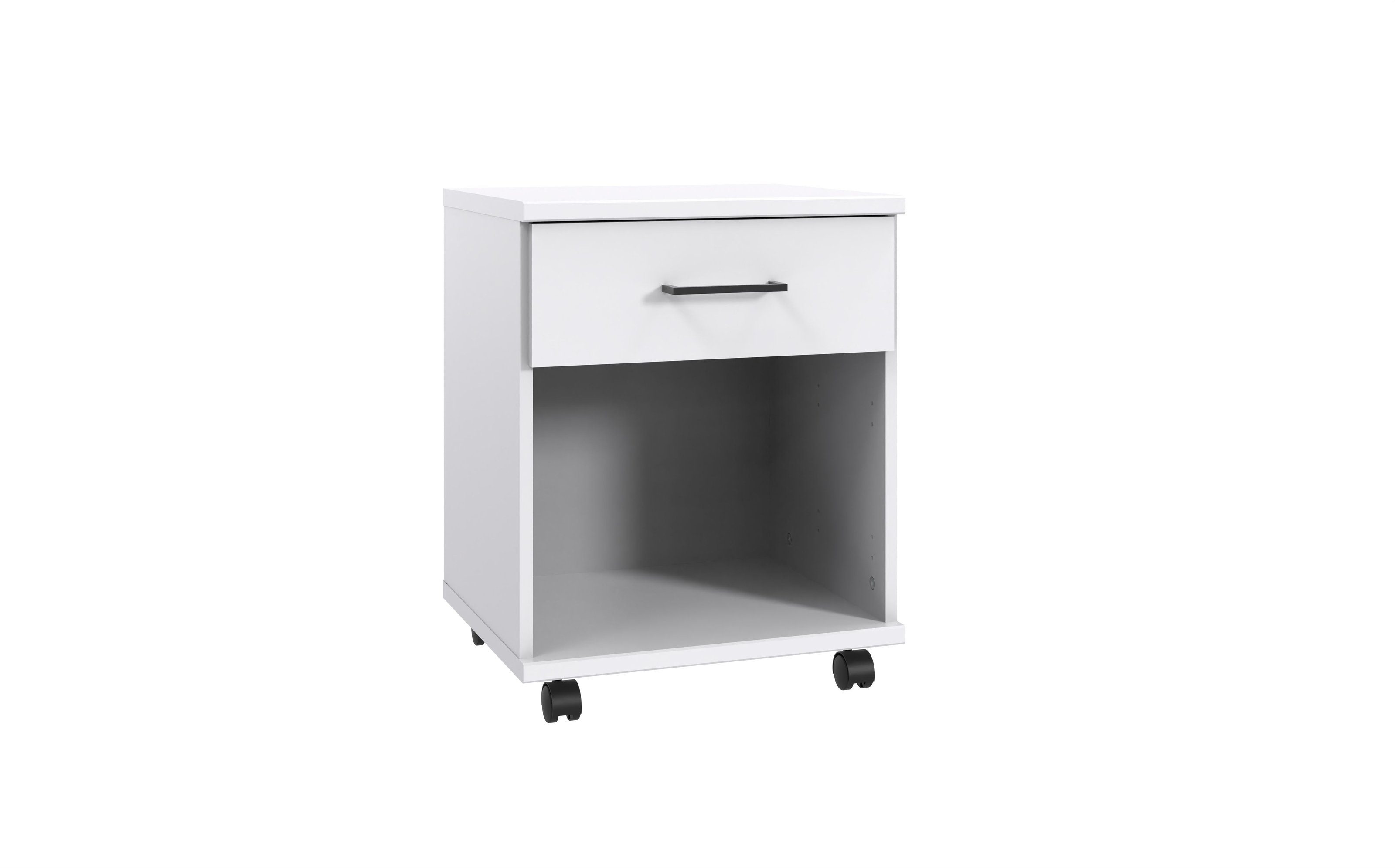 Hergestellt aus hochwertiger Spanplatte E05 und ausgestattet mit einem modernen weißen Korpus, fügt sich der Rollcontainer nahtlos in jedes Raumkonzept ein und bietet gleichzeitig