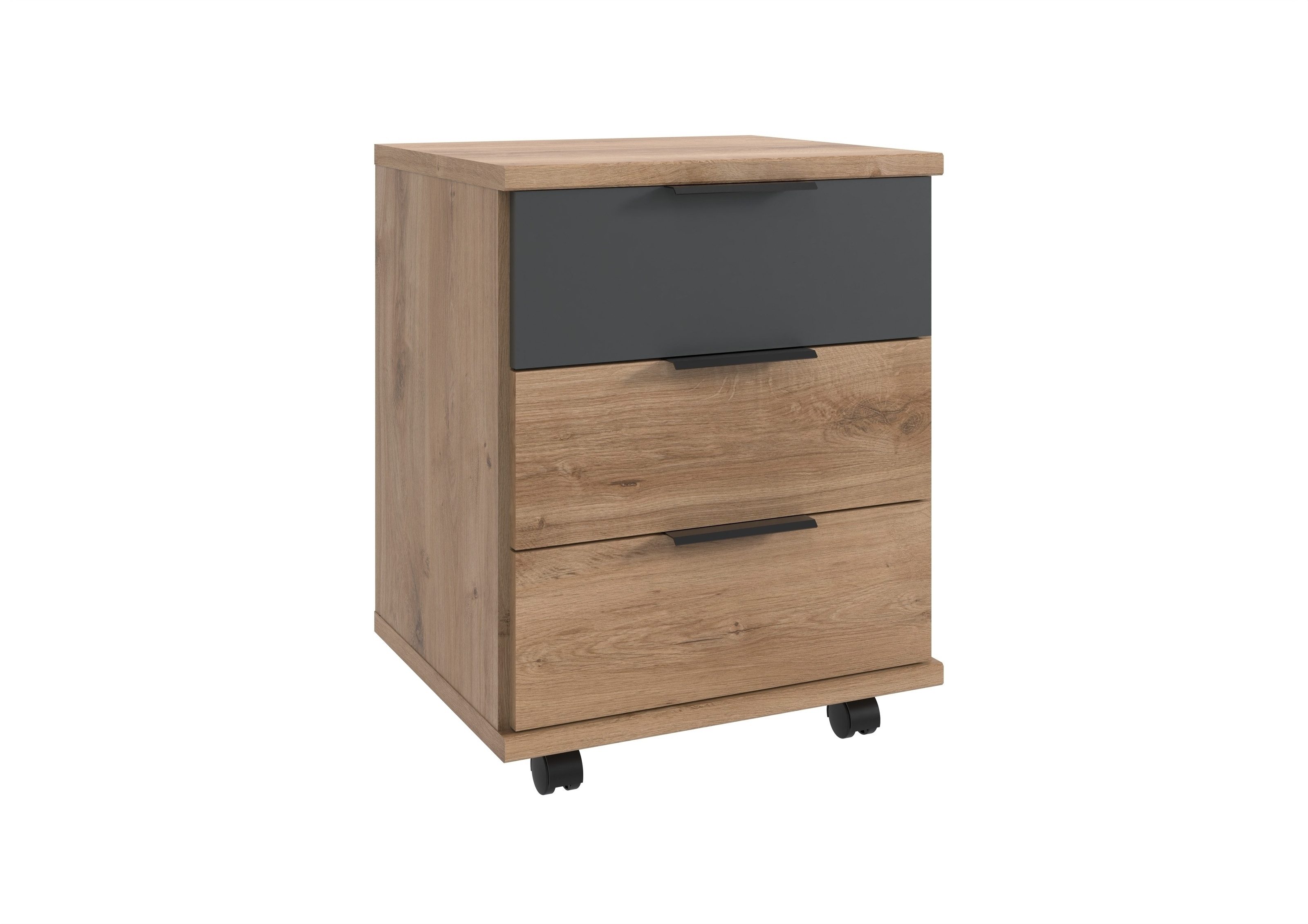 Die moderne Kommode TEXEL überzeugt mit einem stilvollen Design und funktionalem Stauraum – ideal für Kinder- und Jugendzimmer. Mit ihren kompakten Maßen von B/H/T: 46/58/40 cm passt sie perfekt auch in kleinere Räume und sorgt dennoch für Ordnung. Die Kommode verfügt über drei praktische Schubladen, die ausreichend Platz für Spielzeug oder Schulutensilien bieten. Der Korpus ist in Plankeneiche Nachbildung gehalten und harmoniert perfekt mit den Fronten in Plankeneiche NB und Graphit. Die moderne Farbkombination verleiht dem Möbelstück eine zeitlose Optik und lässt sich hervorragend mit anderen Einrichtungselementen kombinieren. Gefertigt ist die Kommode aus pflegeleichter Spanplatte, die besonders langlebig und stabil ist. Die Holzoptik in hochwertiger Nachbildung sorgt für eine natürliche Ausstrahlung bei gleichzeitig leichter Pflege. TEXEL wird im zerlegten Zustand geliefert und lässt sich dank beiliegender Montageanleitung schnell und unkompliziert aufbauen. Der Artikel wird in einem Paket geliefert und wiegt ca. 17 kg. Ein weiteres Qualitätsmerkmal: Diese Kommode ist Made in Germany – sie erfüllt somit hohe Standards in Material und Verarbeitung. Bitte beachten Sie: Die Lieferung erfolgt ohne Dekoration und Inhalt. Die dargestellten Farben können je nach Monitoreinstellung leicht vom Original abweichen. Все Maße sind ca.-Angaben. Für eine lange Lebensdauer beachten Sie bitte die beiliegenden Pflegehinweise. Mit TEXEL erhalten Sie ein funktionales und stilvolles Möbelstück, das modernes Design mit praktischer Alltagstauglichkeit verbindet.
