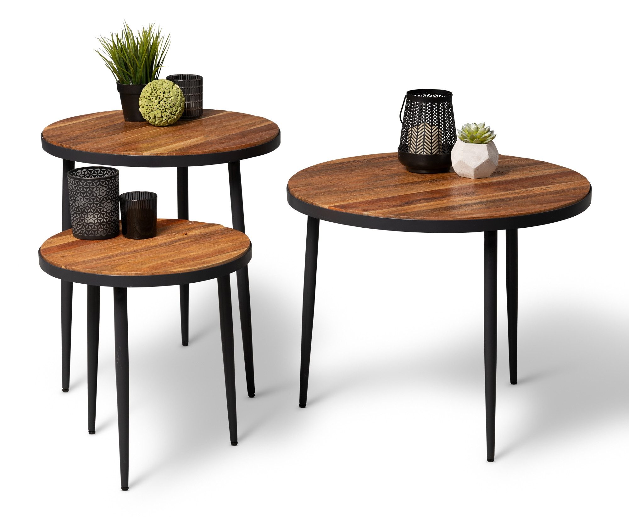 Drei unterschiedlich große Tische ermöglichen flexible Nutzungsmöglichkeiten, ideal als Beistelltische oder Dekorationselemente im Wohnbereich.