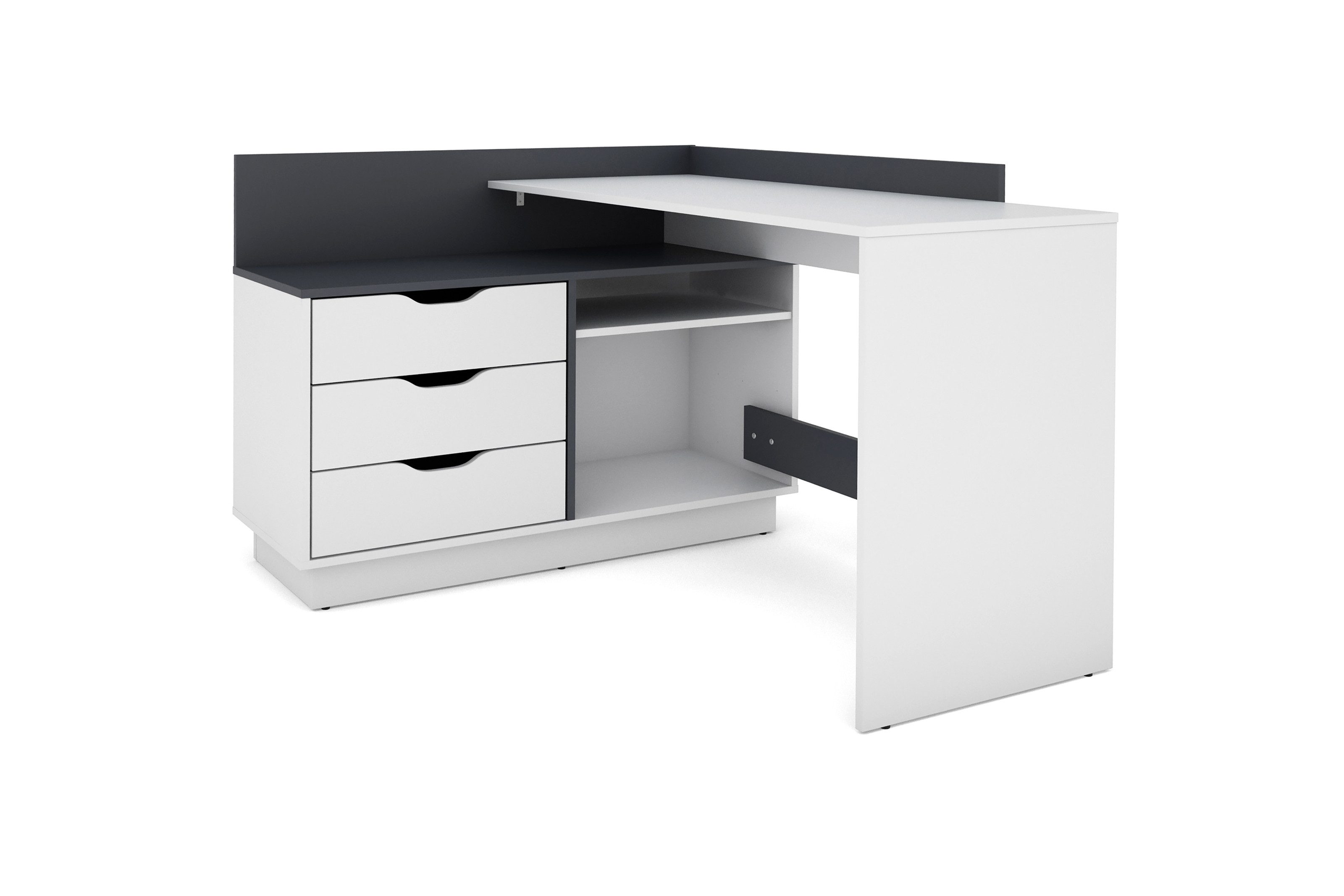 Ein moderner Winkelschreibtisch mit viel Stauraum in offenen Fächern und 3 Schubkästen