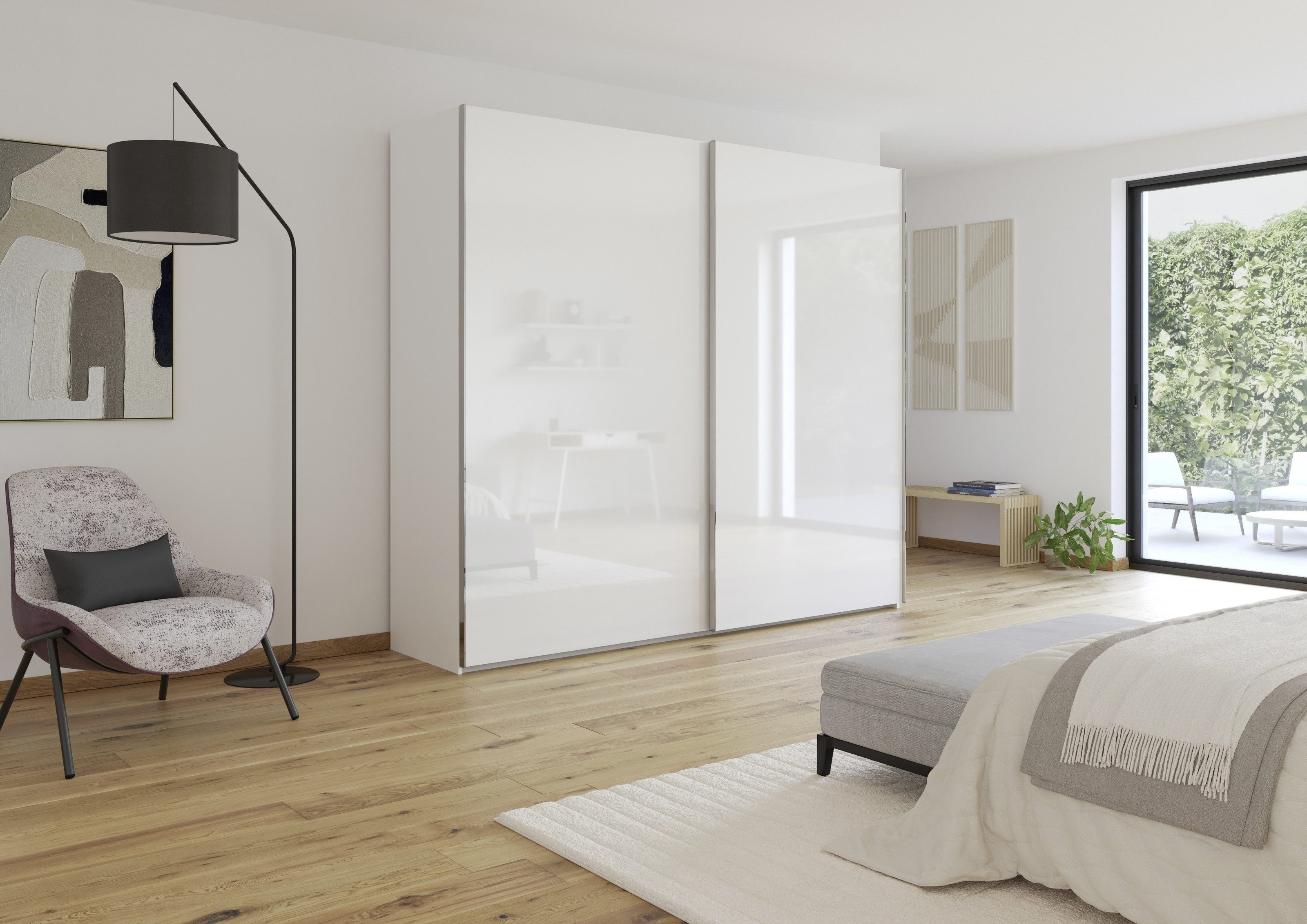 Der 2-türige weiße Schwebetürenschrank »Fifty« mit weißen Hochglanzfronten besticht durch seinen modernen, monochromen Look und bietet dir dank 3 serienmäßig enthaltenen Fachböden sowie 3 Kleiderstangen vielseitige Möglichkeiten zur Aufbewahrung. Die handlichen chromfarbenen Griffleisten des Kleiderschranks runden das einheitliche Design perfekt ab. Die 2 praktischen Schwebetüren sorgen dafür, dass der Schrank auch in kleineren Räumen ideal genutzt werden kann. Dank den Abmessungen von B/H/T: 251/223/66 cm wird die Organisation und das Auffinden von Kleidung erheblich erleichtert. Hinter den großflächigen Schwebetüren bieten dir höhenverstellbare Kleiderstangen und Fachböden die Möglichkeit, deine Kleidung ordentlich aufzubewahren und den Stauraum optimal zu nutzen. Der Schwebetürenschrank »Fifty« von rauch überzeugt nicht nur durch Flexibilität und moderne Optik, sondern auch durch Auszeichnungen wie dem Blauen Engel, dem Goldenen M und seiner nachhaltigen Produktion in Deutschland.