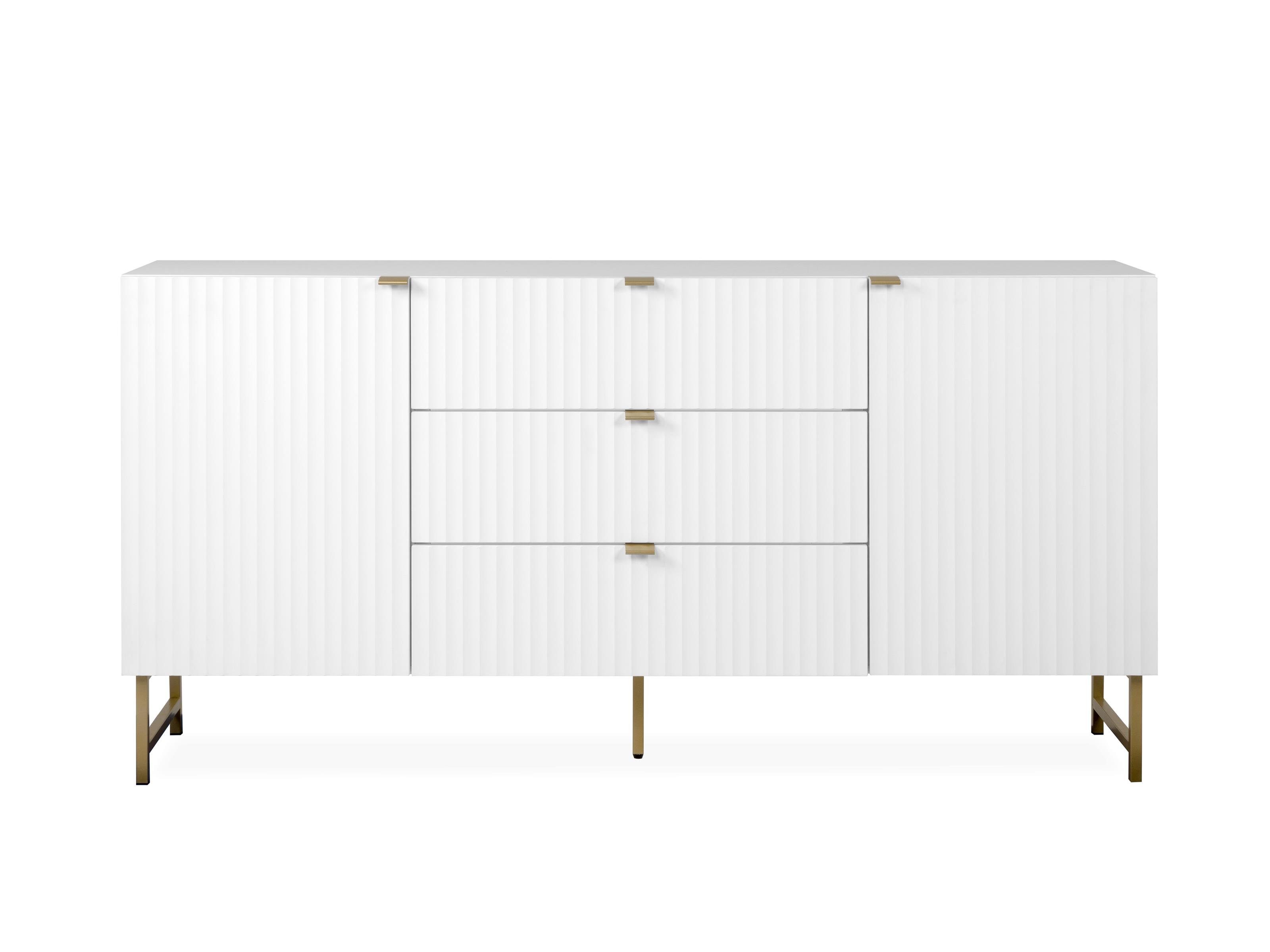 Das Sideboard "Elwood I" ist in mattem Weiß erhältlich, welches stilvoll mit einer 3D-Front kombiniert wird. Edle Akzente setzen hier die Füße und die Griffe in mattem Gold. Dank dieser Farbgebung wird dem jeweiligen Zimmer nicht nur eine moderne Atmosphäre, sondern auch eine stilvolle Erscheinung verliehen.