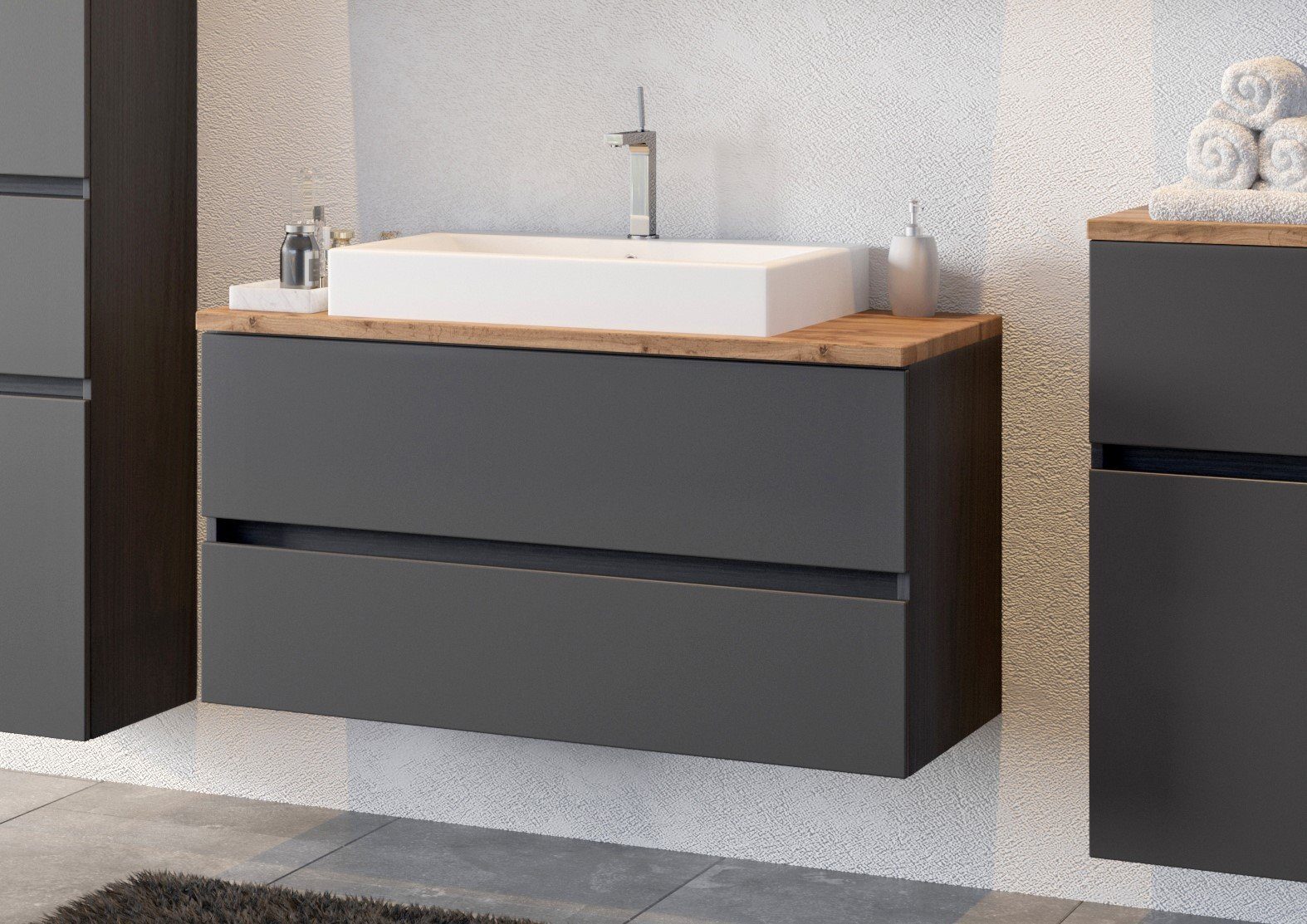 "Pienza II" kommt in Graphitgrau und grau-matt, stilsicher kombiniert mit einer, in Wotan-Eiche gehaltenen, Abdeckplatte. Wotan-Eiche ist ein uriges und lebhaftes Möbeldekor, welches sich mit markanten Rissen und Astlöchern abhebt. Die fehlenden Griffe verleihen dem Waschtisch ein zusätzliches modernes Element. Das Keramikbecken rundet das hochwertige Erscheinungsbild gekonnt ab.
