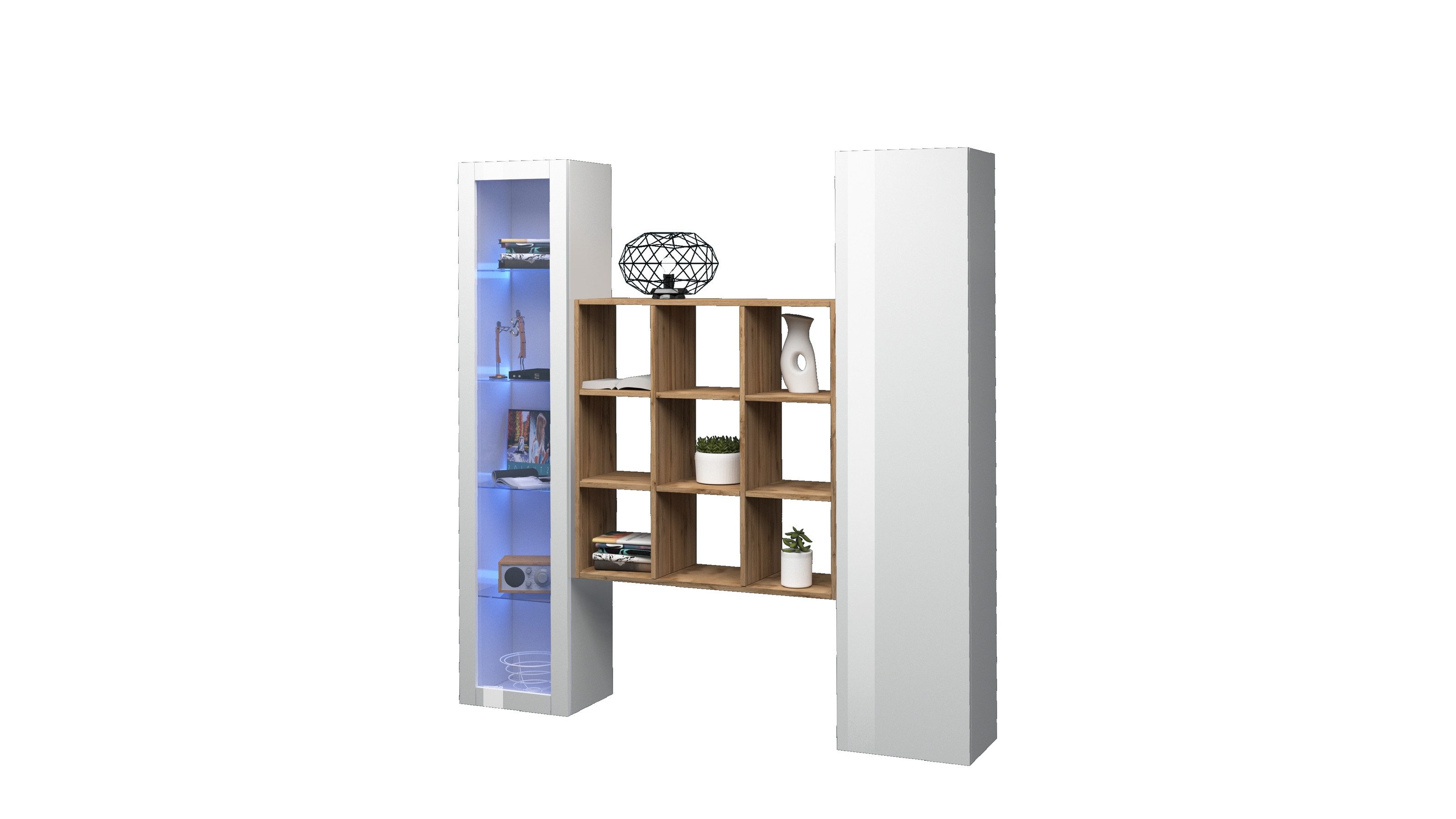 Set beinhaltet | 1 Vitrine, 1 Schrank, 1 Hängeregal |