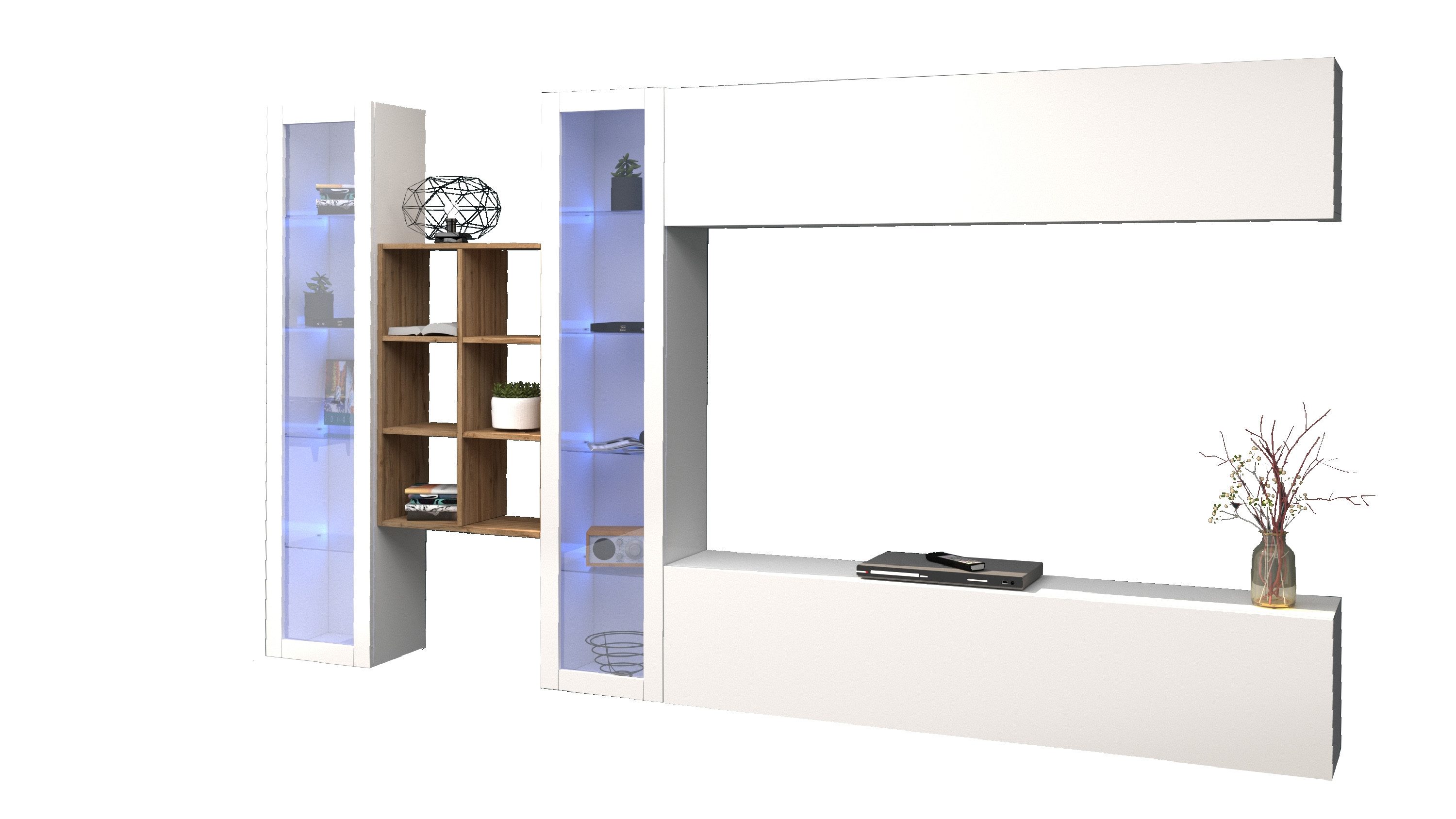 Set beinhaltet | 2 Vitrinen, 1 TV-Lowboard, 1 Klapphängeschrank, 1 Hängeregal |