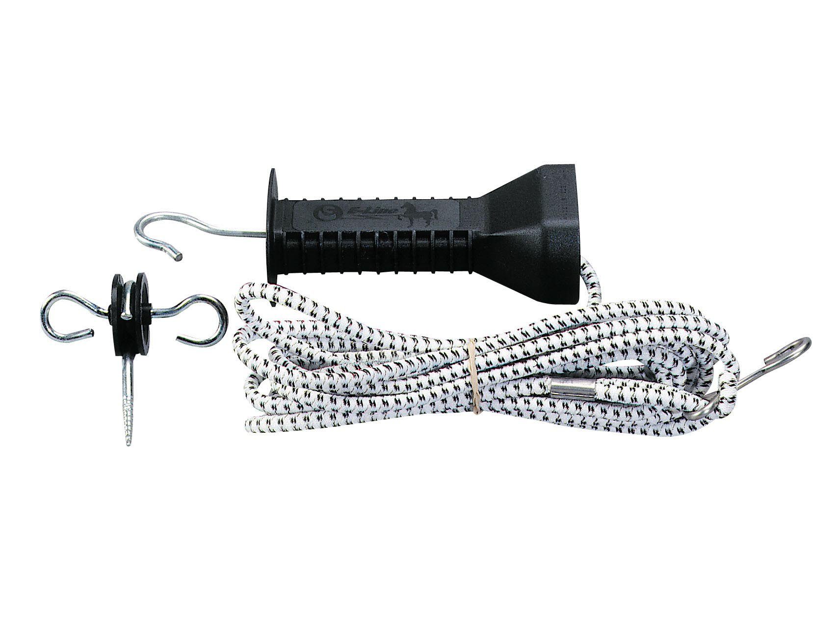 - bestehend aus: elastisches Seil 3,20 m bis auf 6,20 m ausziehbar, Torgriff, Torgriffisolator und Ringisolator