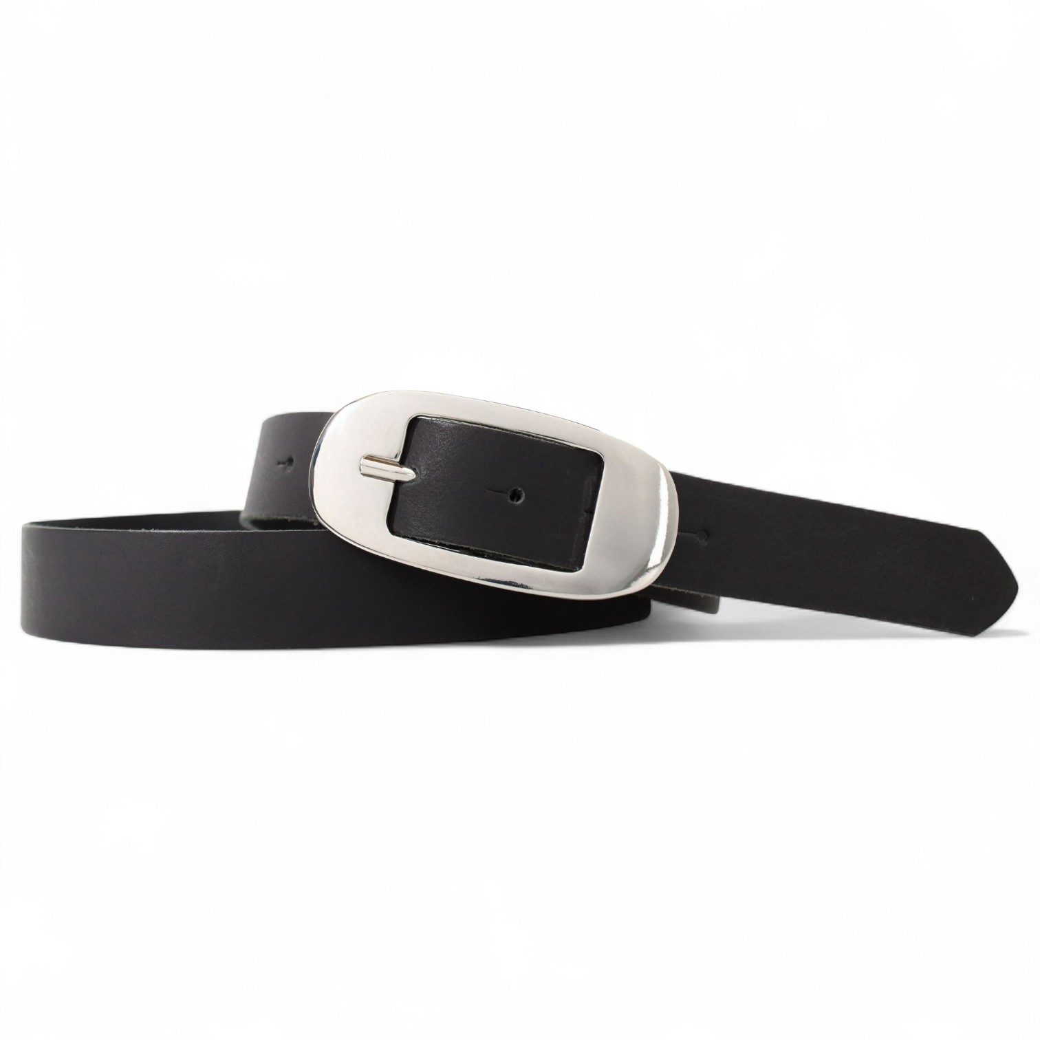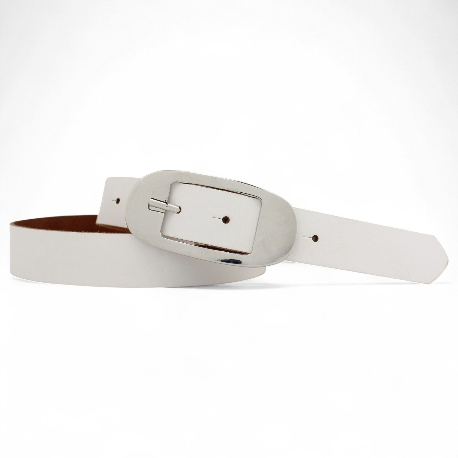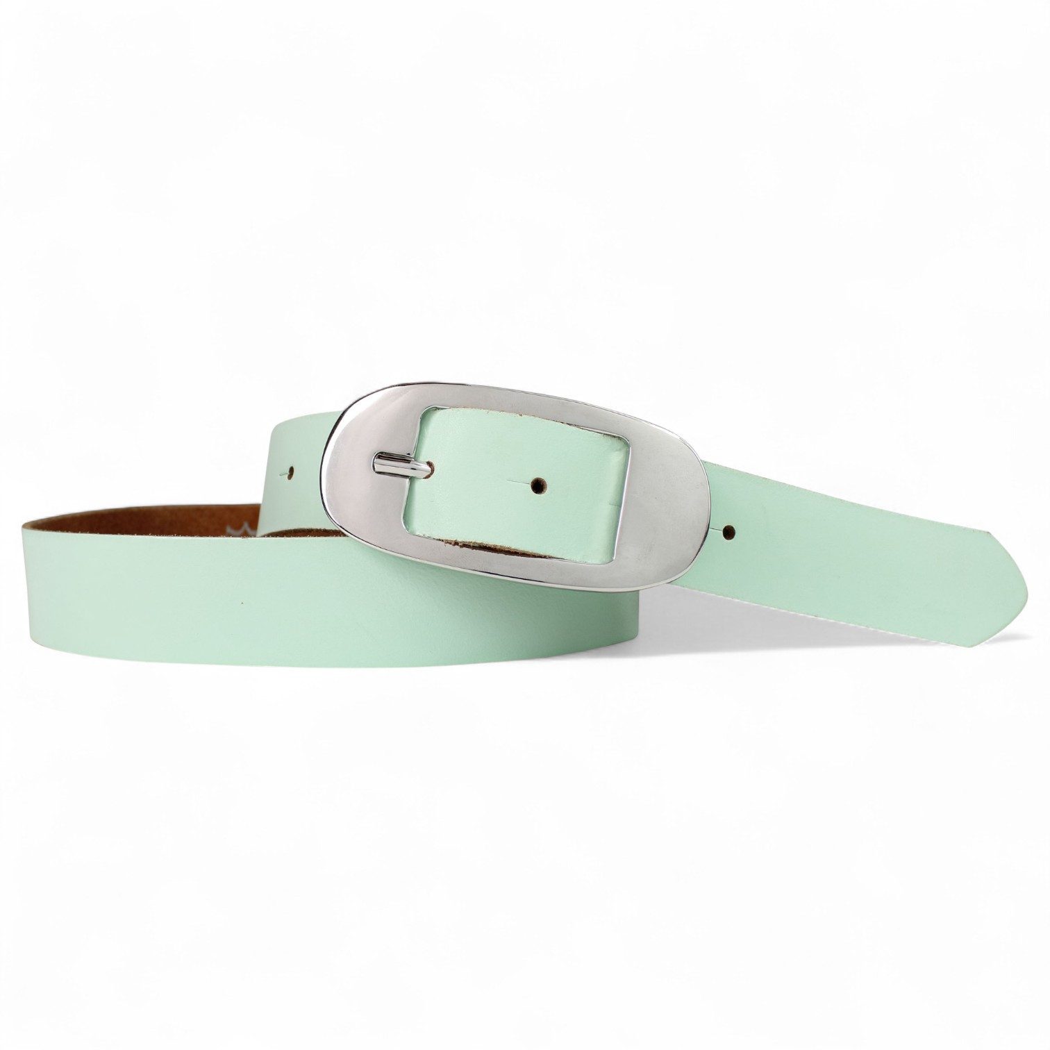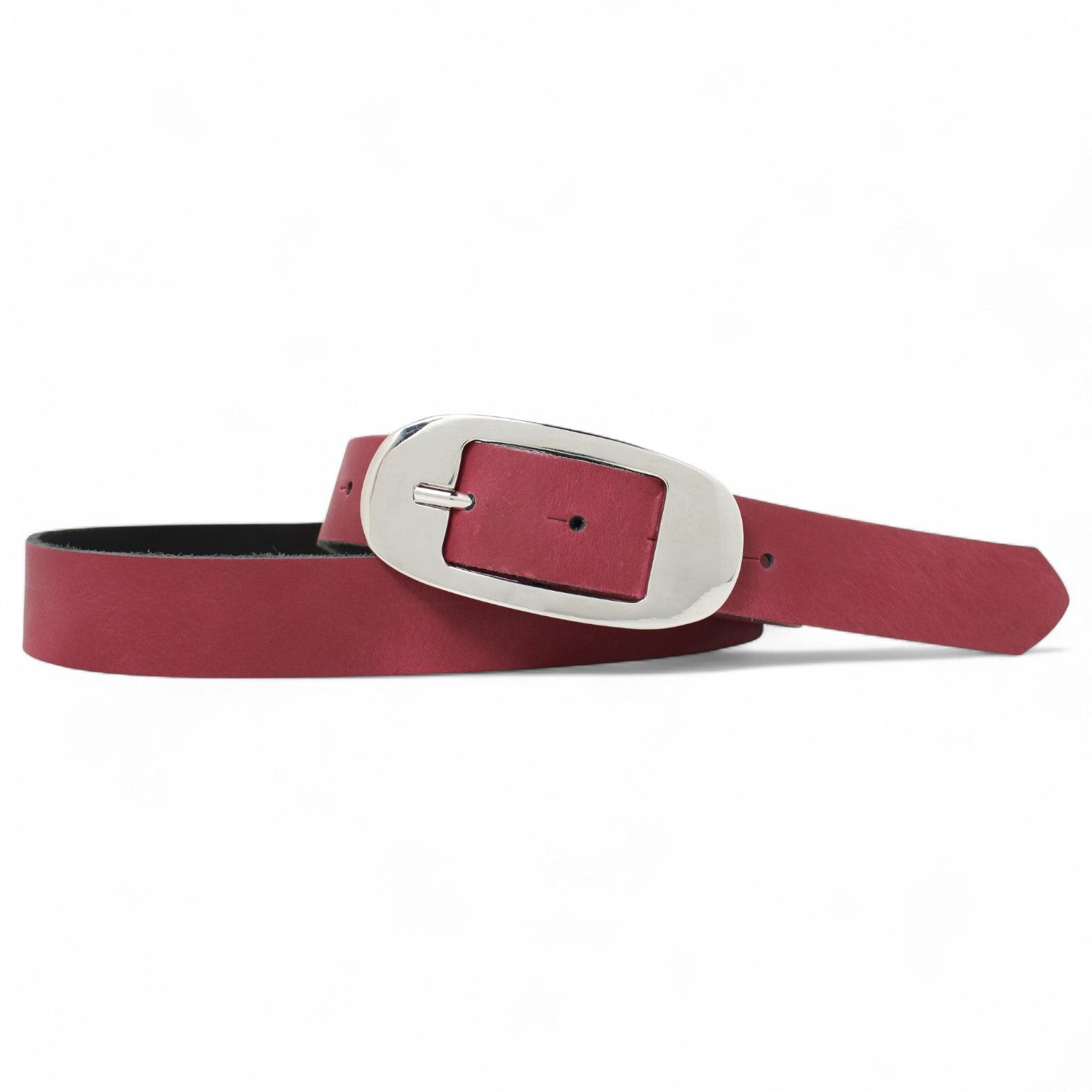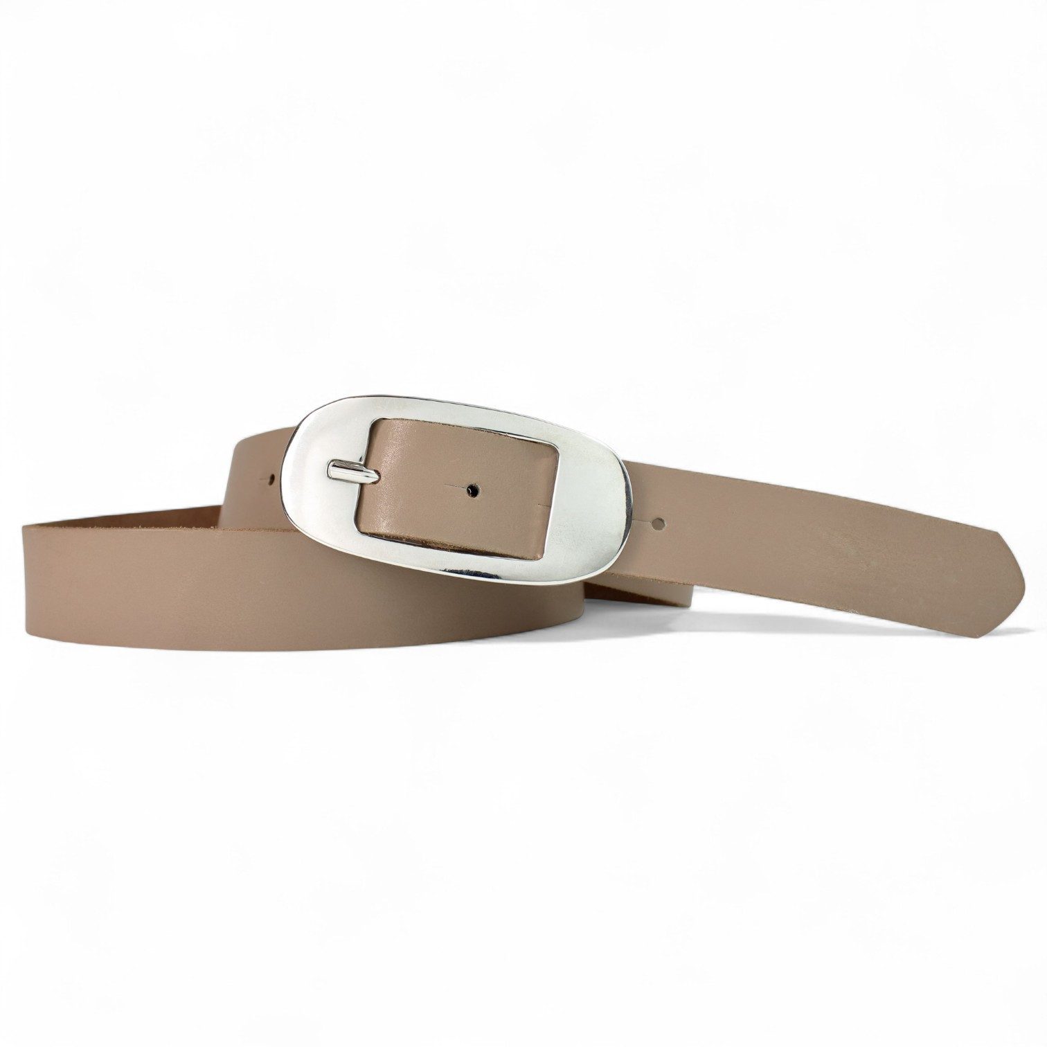 Schöner und vielseitig kombinierbarer Ledergürtel für Damen mit einer glänzenden, ovalen Gürtelschnalle. Der Gürtel ist 3cm breit.