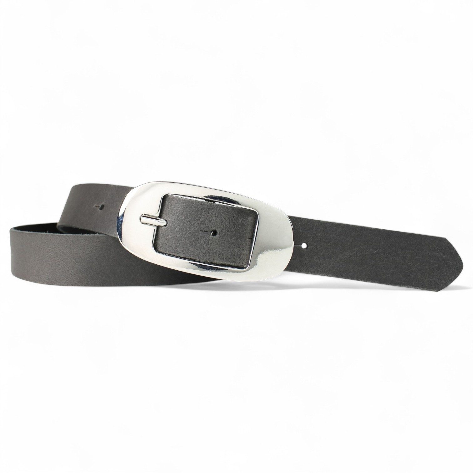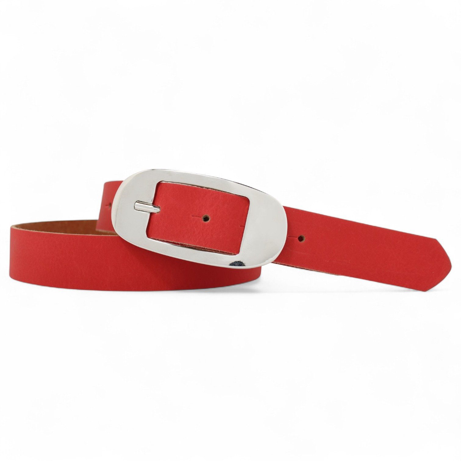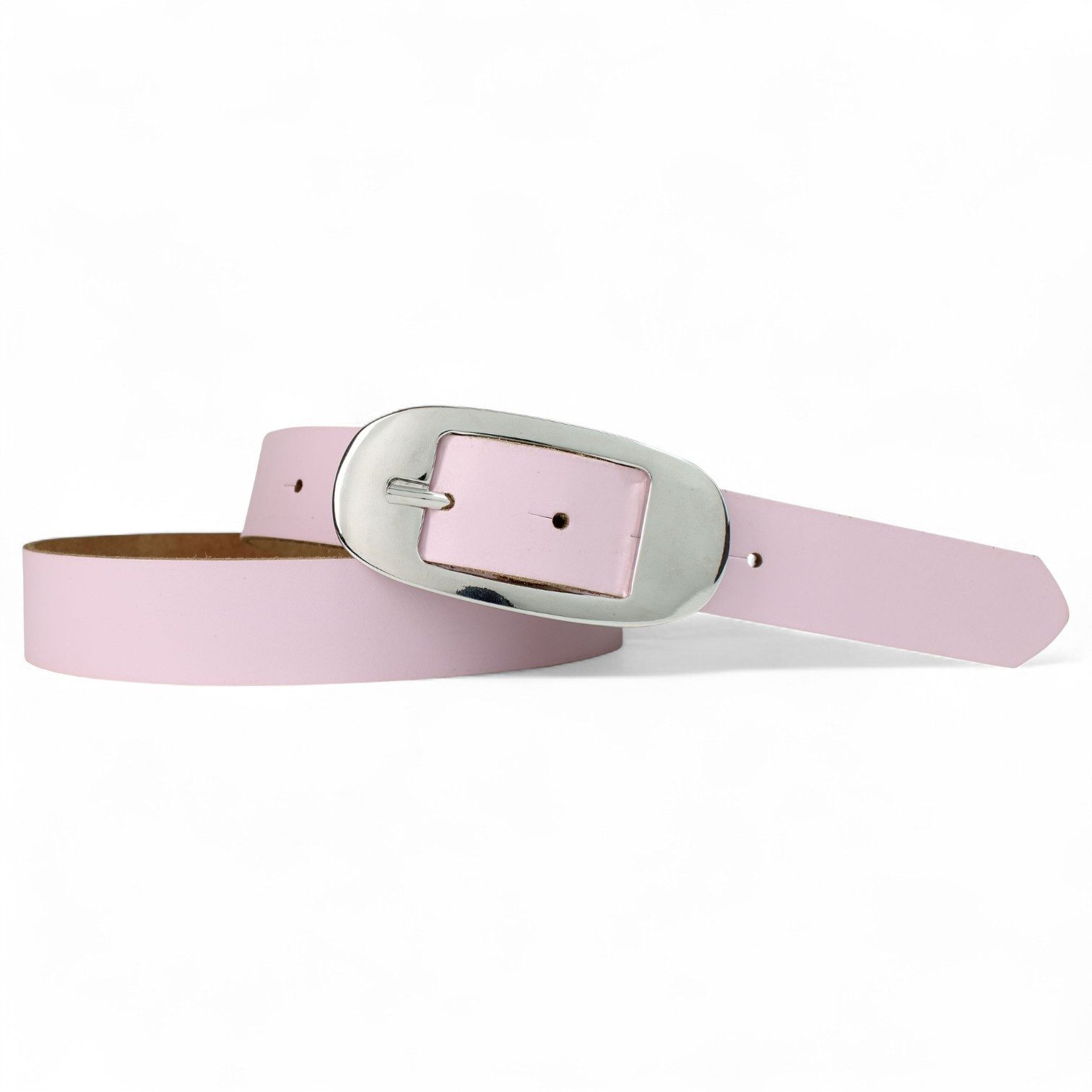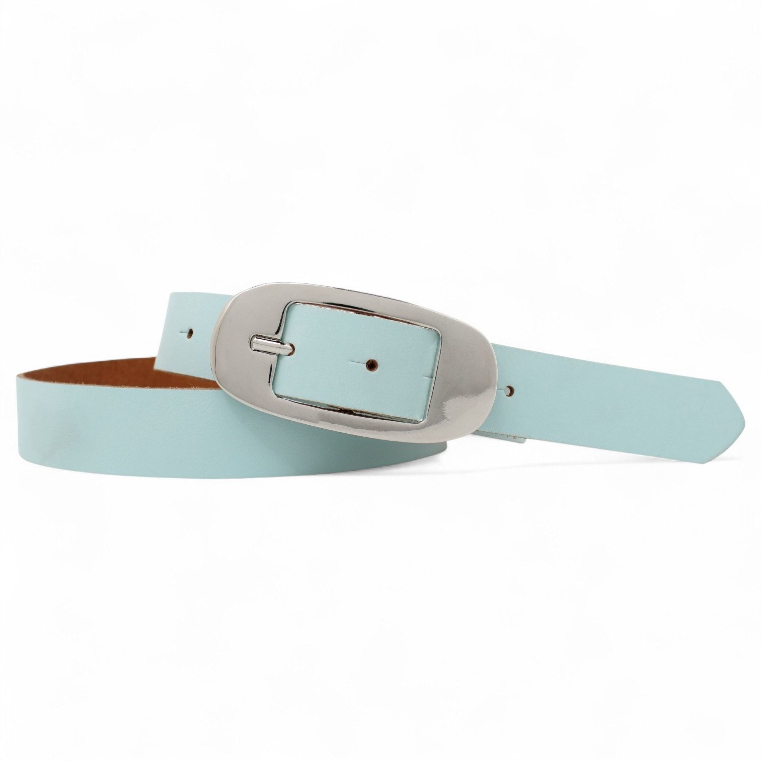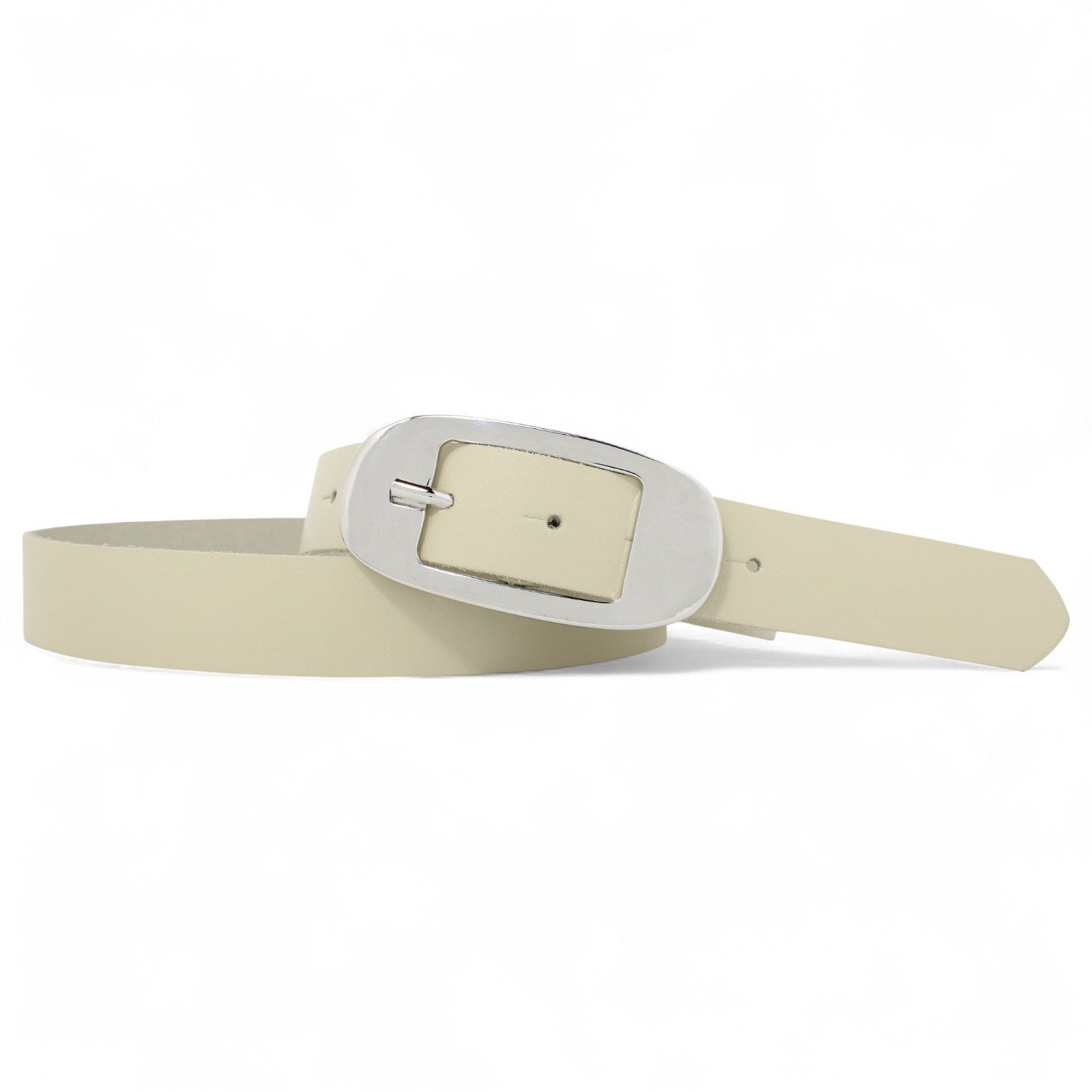 Schöner und vielseitig kombinierbarer Ledergürtel für Damen mit einer glänzenden, ovalen Gürtelschnalle. Der Gürtel ist 3cm breit.