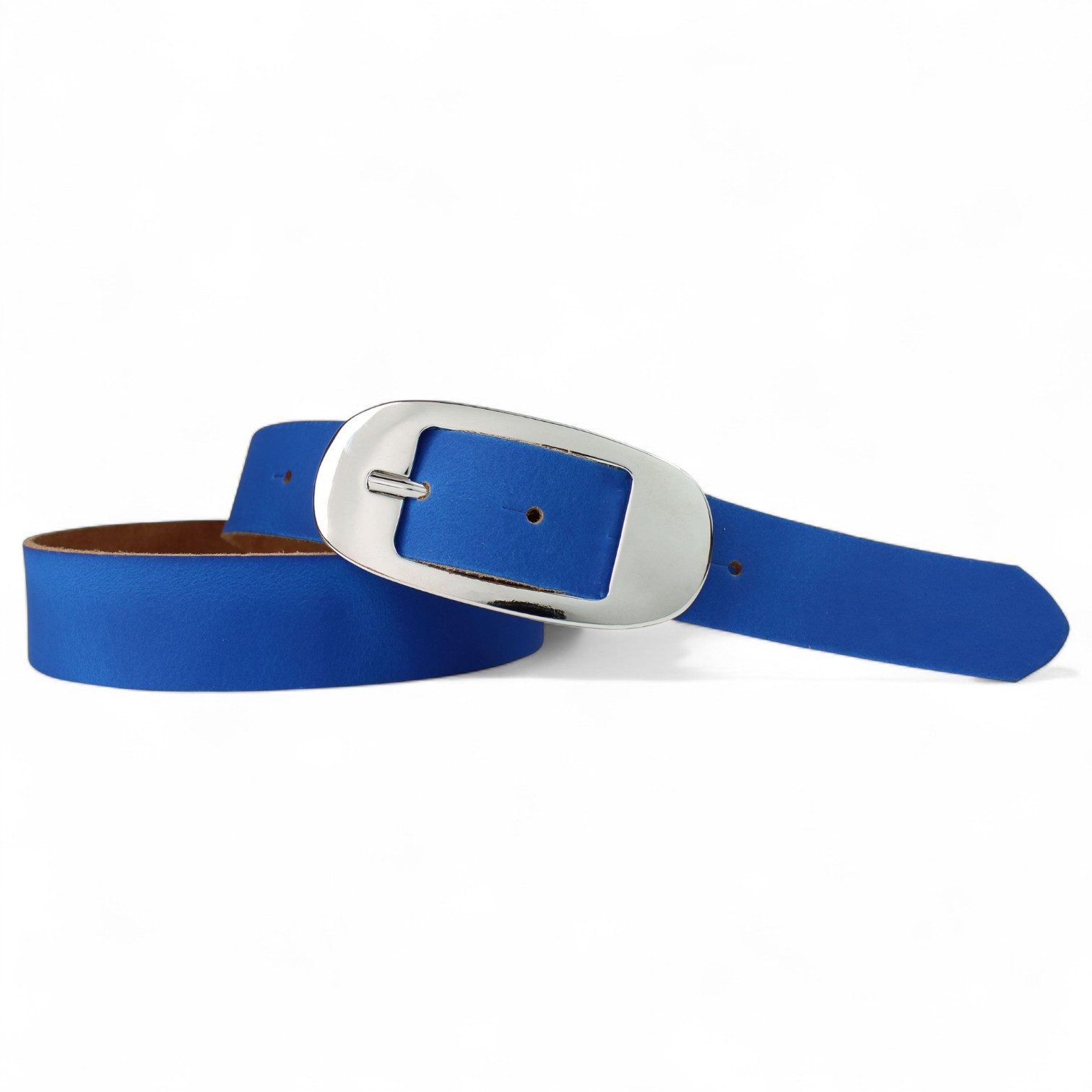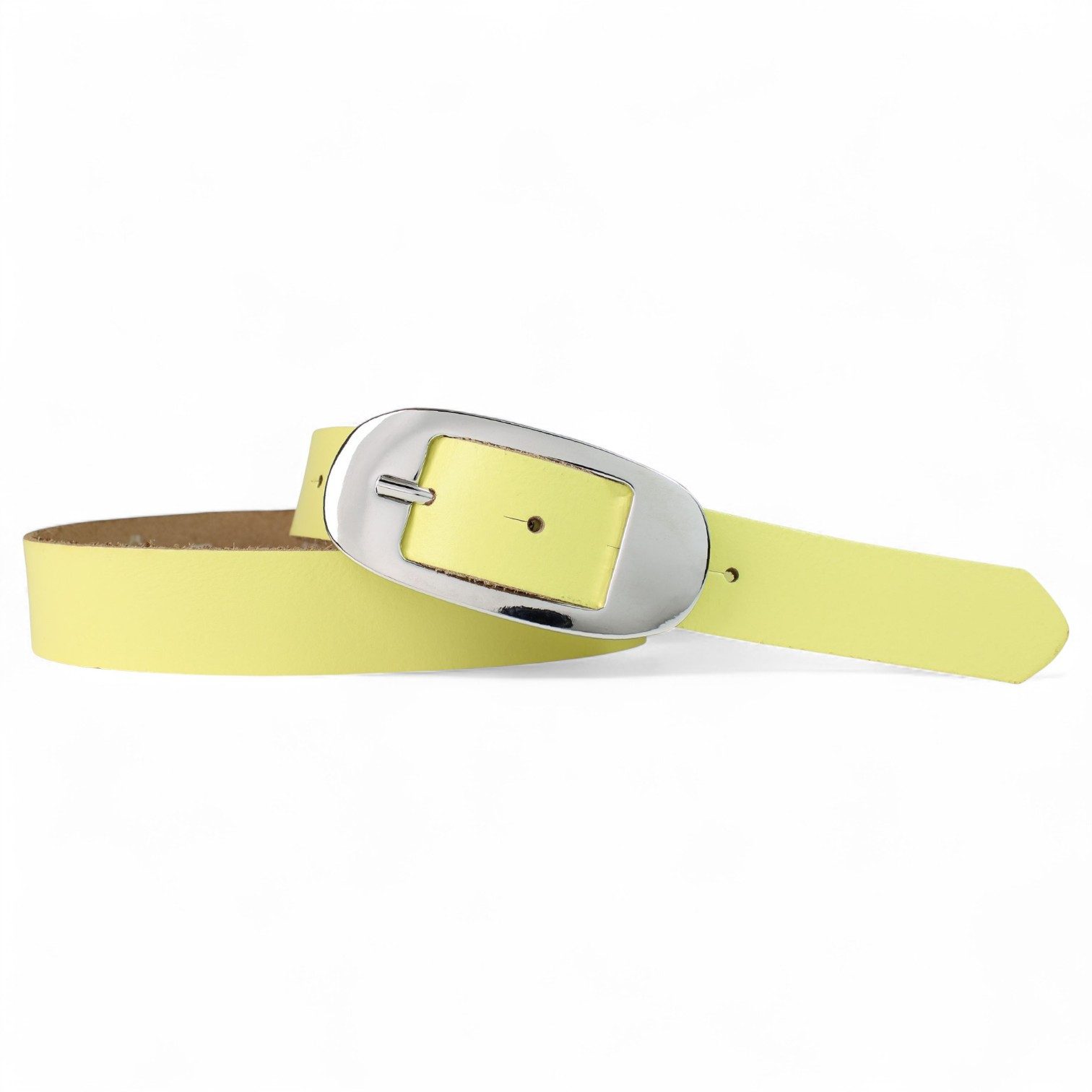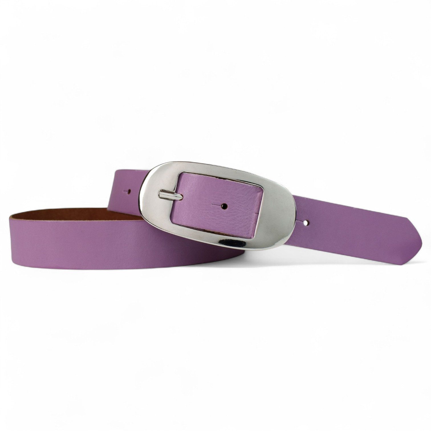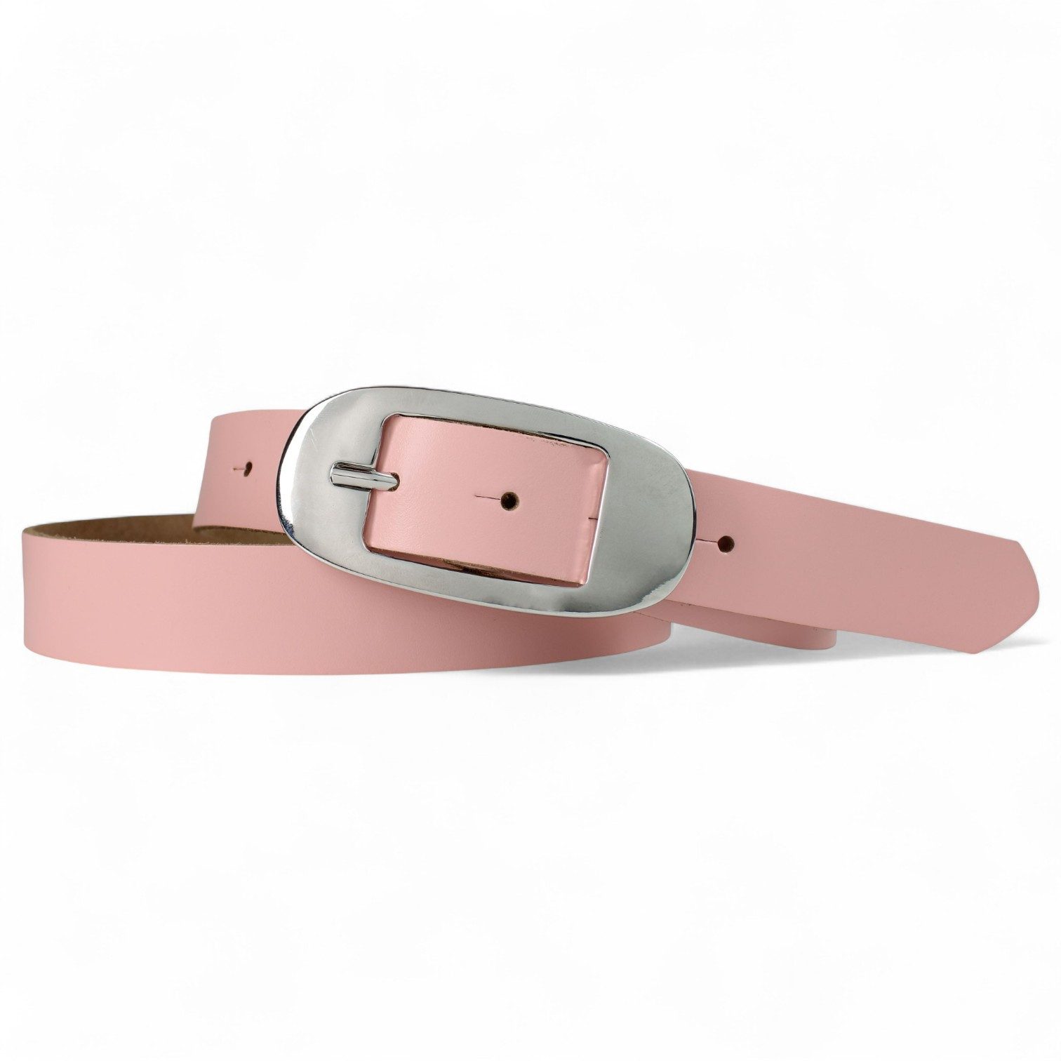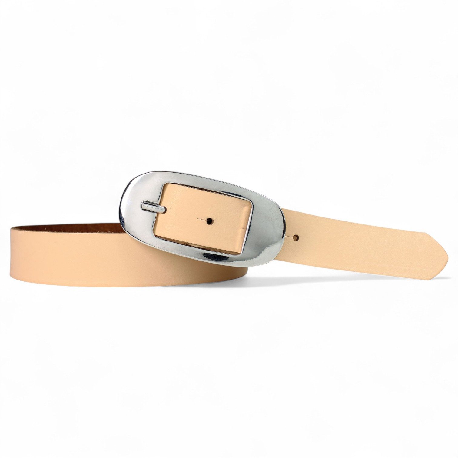 Schöner und vielseitig kombinierbarer Ledergürtel für Damen mit einer glänzenden, ovalen Gürtelschnalle. Der Gürtel ist 3cm breit.