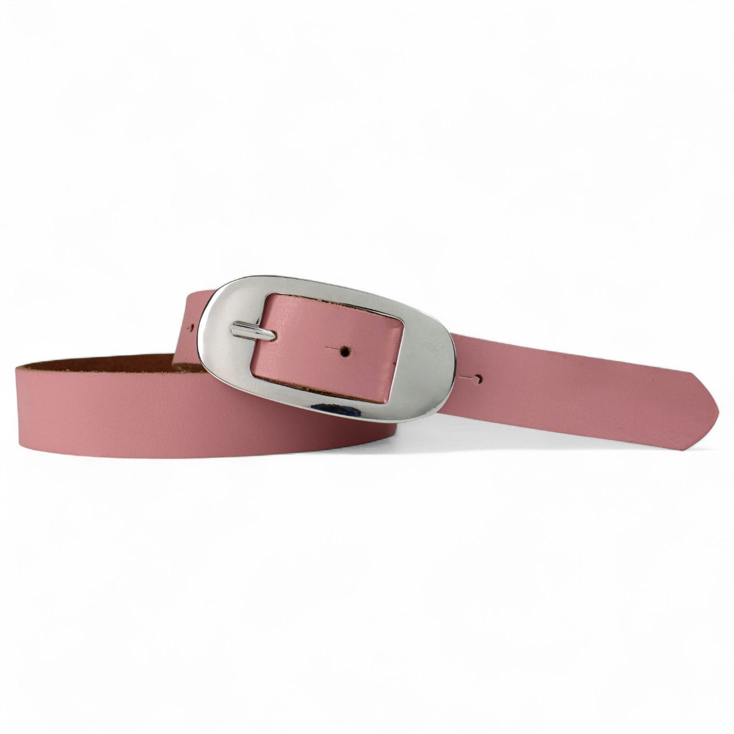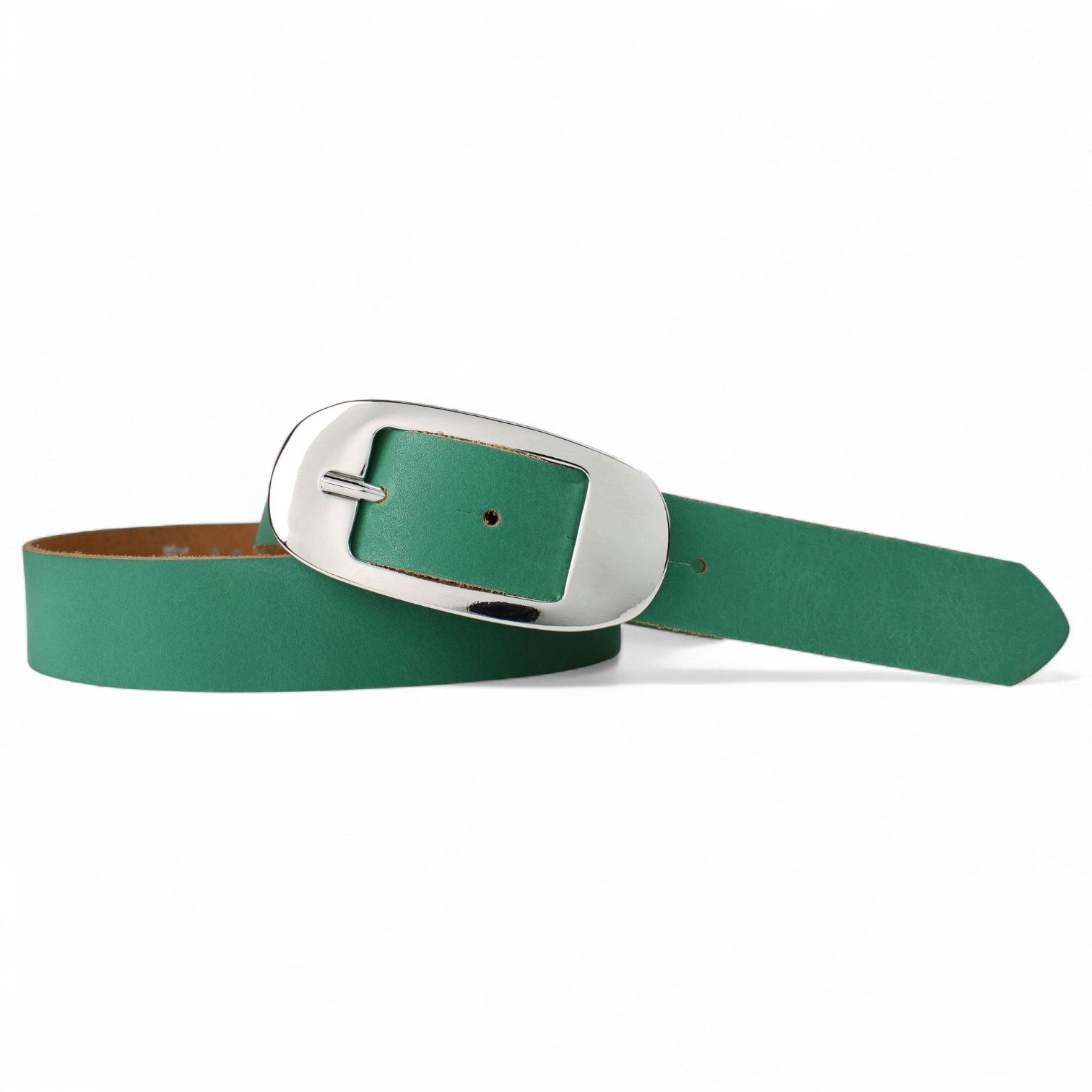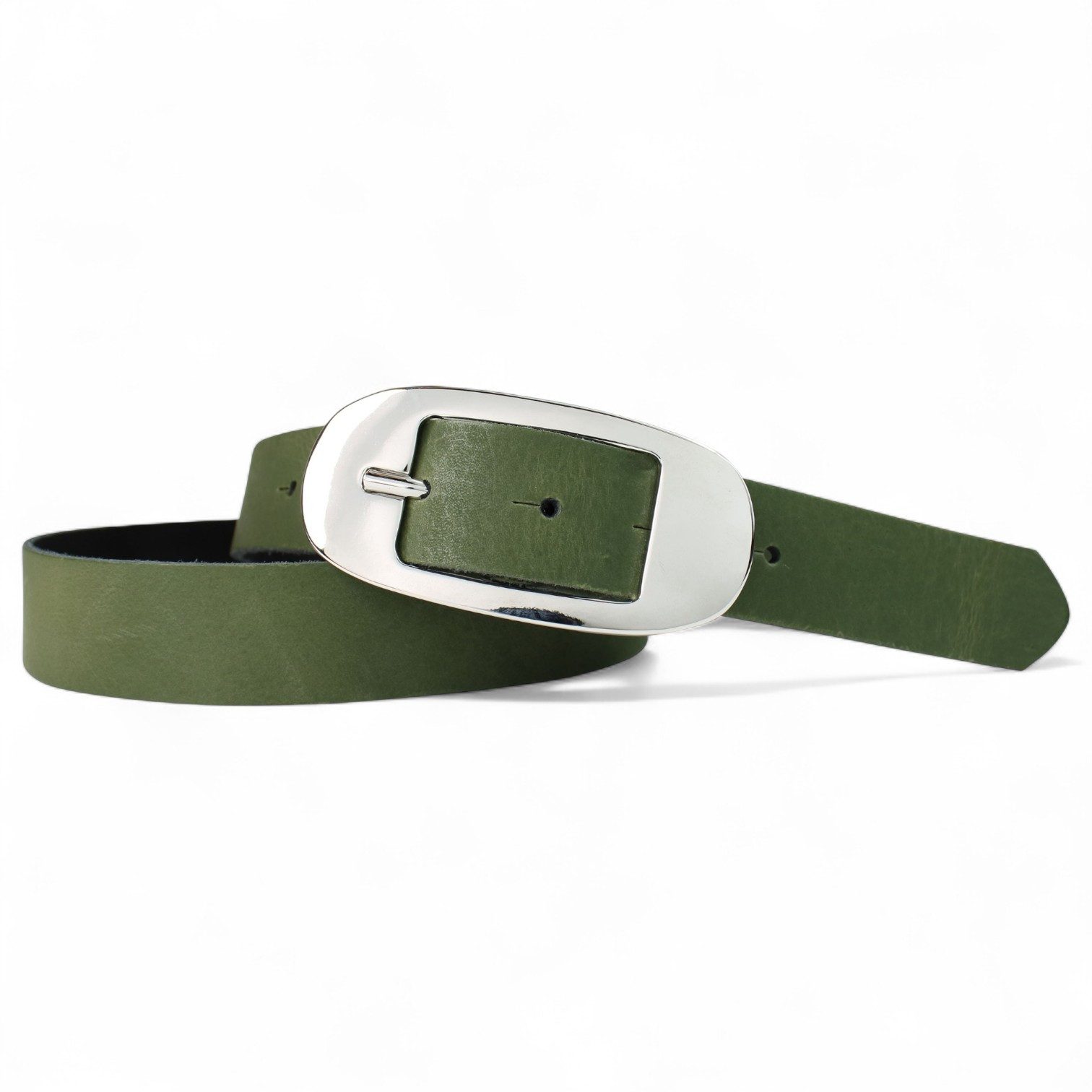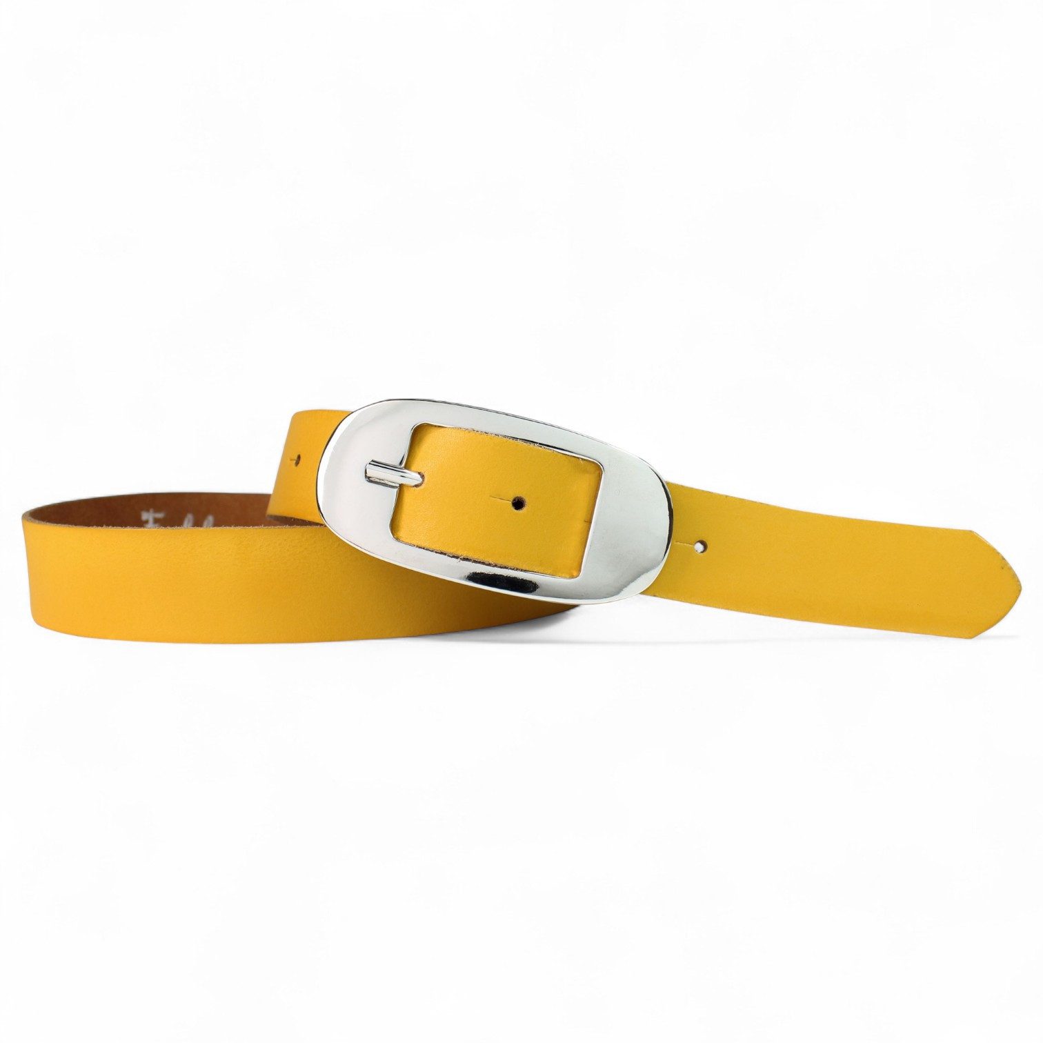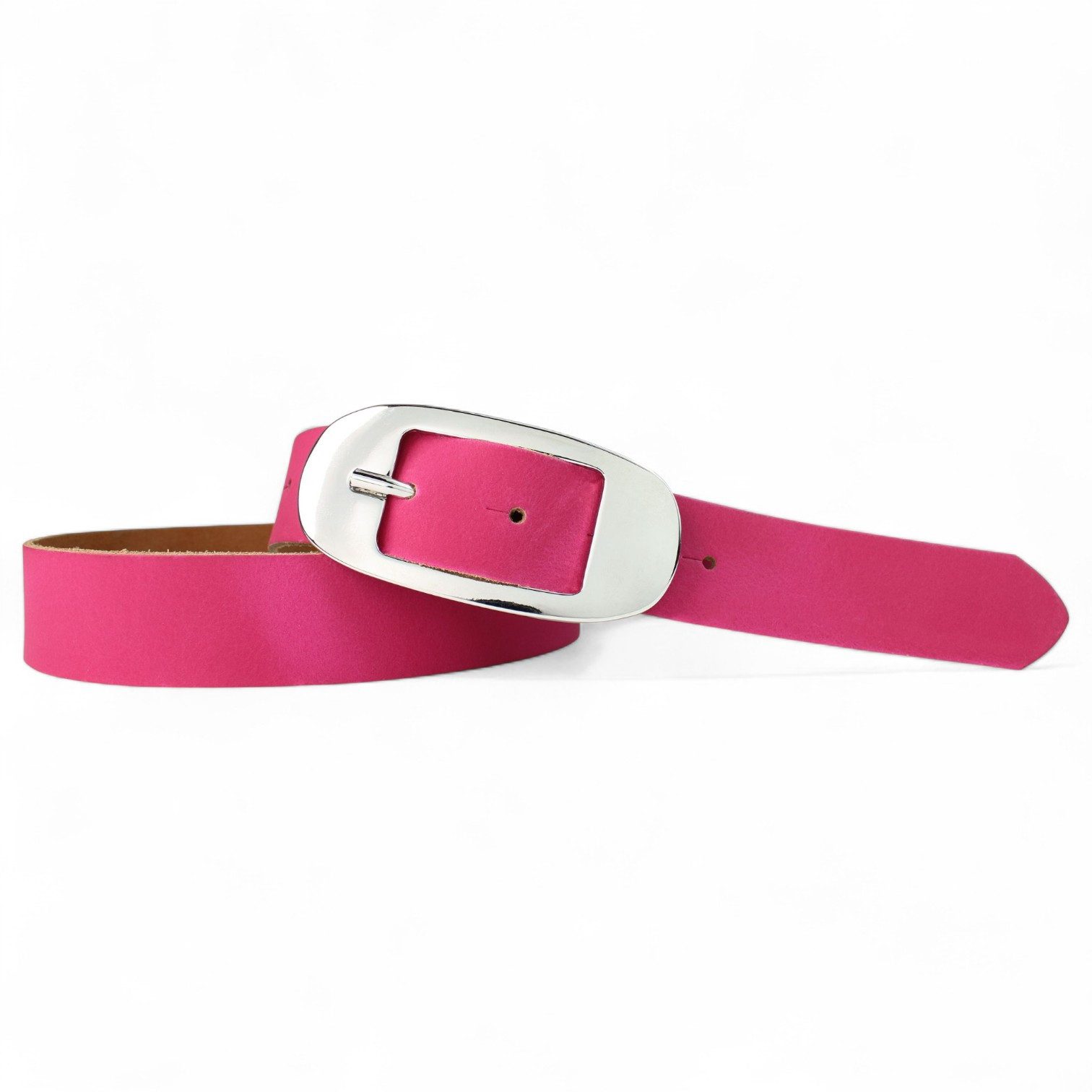 Schöner und vielseitig kombinierbarer Ledergürtel für Damen mit einer glänzenden, ovalen Gürtelschnalle. Der Gürtel ist 3cm breit.