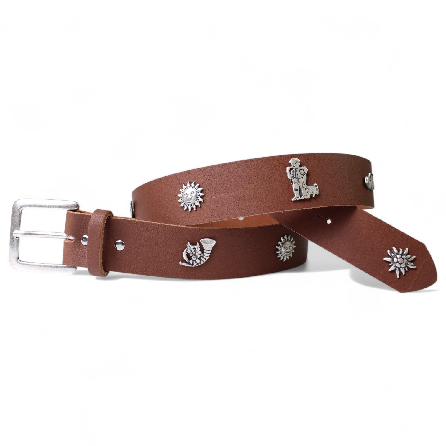 Ausgefallener Trachten- Landhausgürtel mit vielen verschiedenen Zierteilen im Bereich Landhaus. Diese werden abwechselnd am Riemen angebracht. Die schlichte Dornschnalle ist echt versilbert und passt optisch toll zum Gürtel. Als Leder wird hochwertiges Büffelleder verwendet, das ist sehr robust und langlebig. Die Farbe cognac passt zu vielen Trachten Outfits. Wir vernieten die Schnalle fest am Riemen mit bewährten Krampennieten. Gerne fertigen wir Ihnen den Gürtel in anderen Farben oder Größen als Sonderanfertigung.