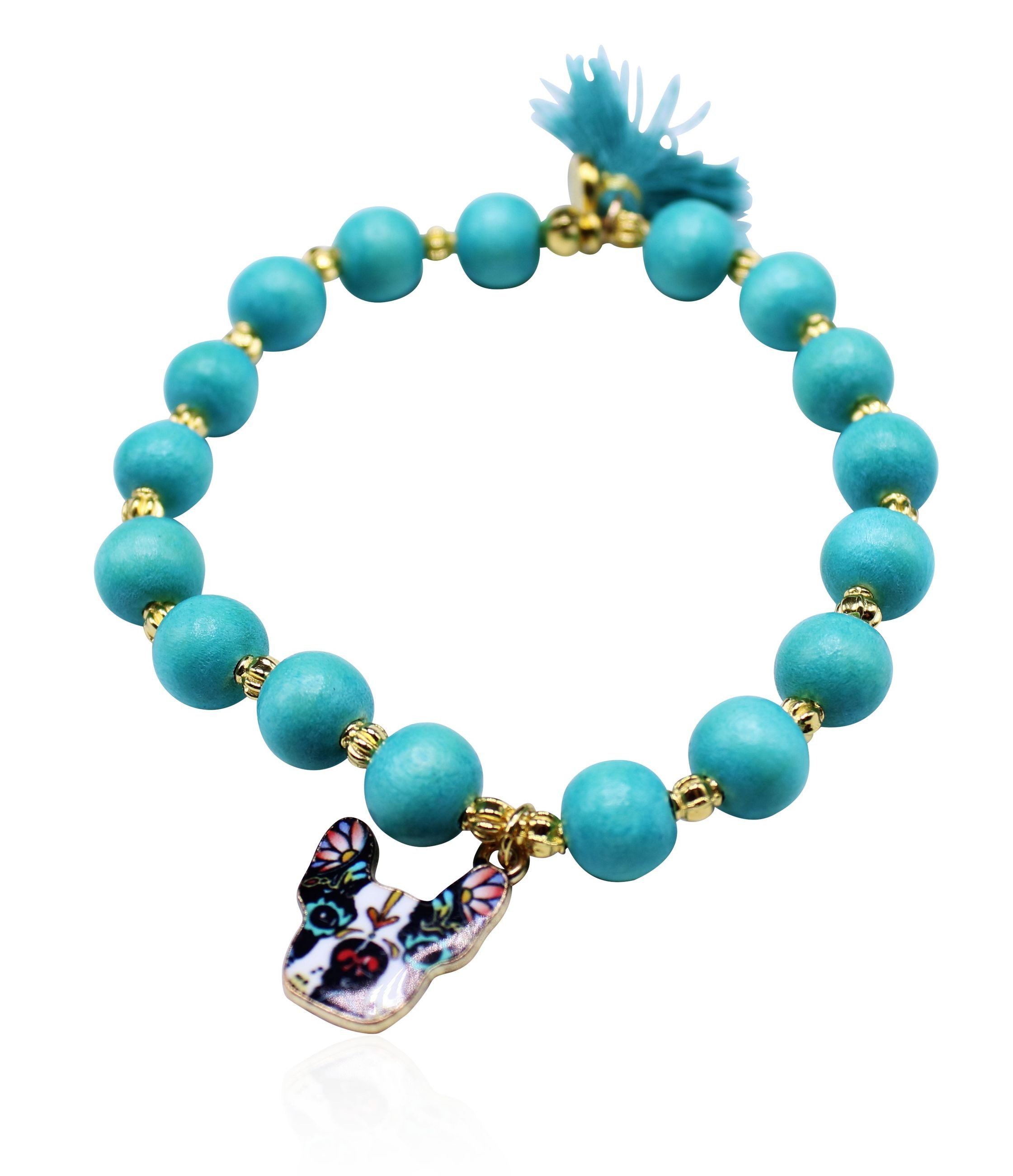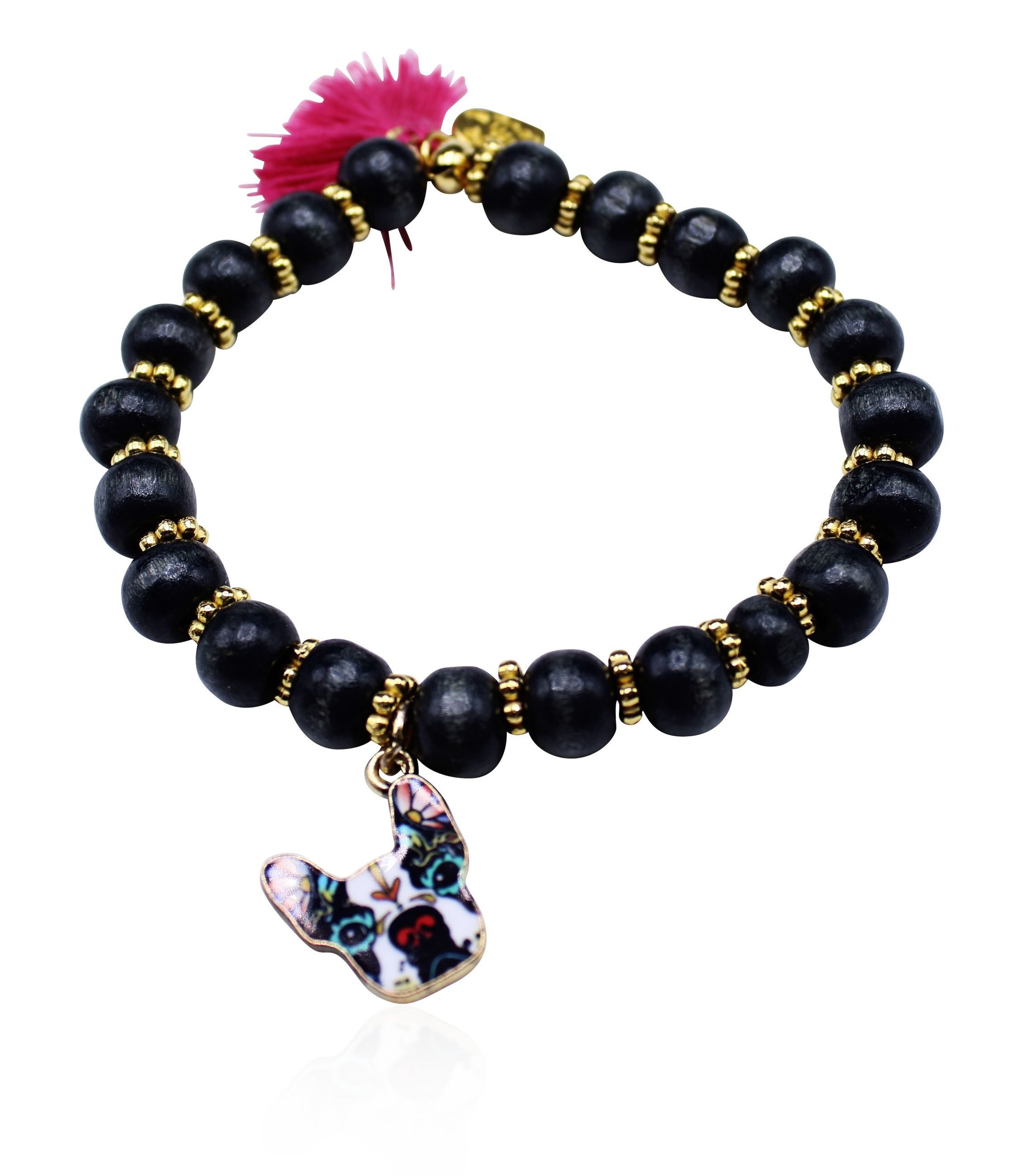 Für alle Besitzer einer französischen Bulldogge ist dieses süße Armband ein Statement. Ein gold gefasster, emaillierter Frenchie Kopf mit hinreißendem Muster ziert das elastische Armband. Eine farblich passende Quaste und goldene, kleine Perlen geben den Glamour zwischen den ca. 10 mm großen Holzperlen.