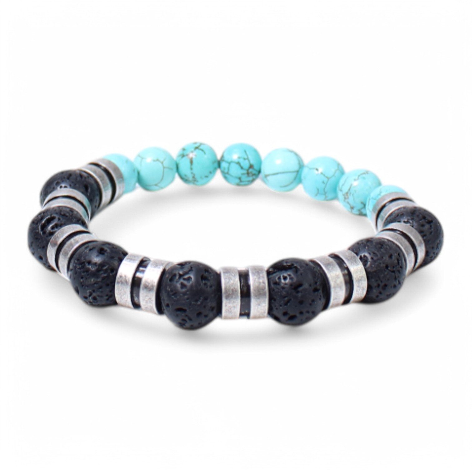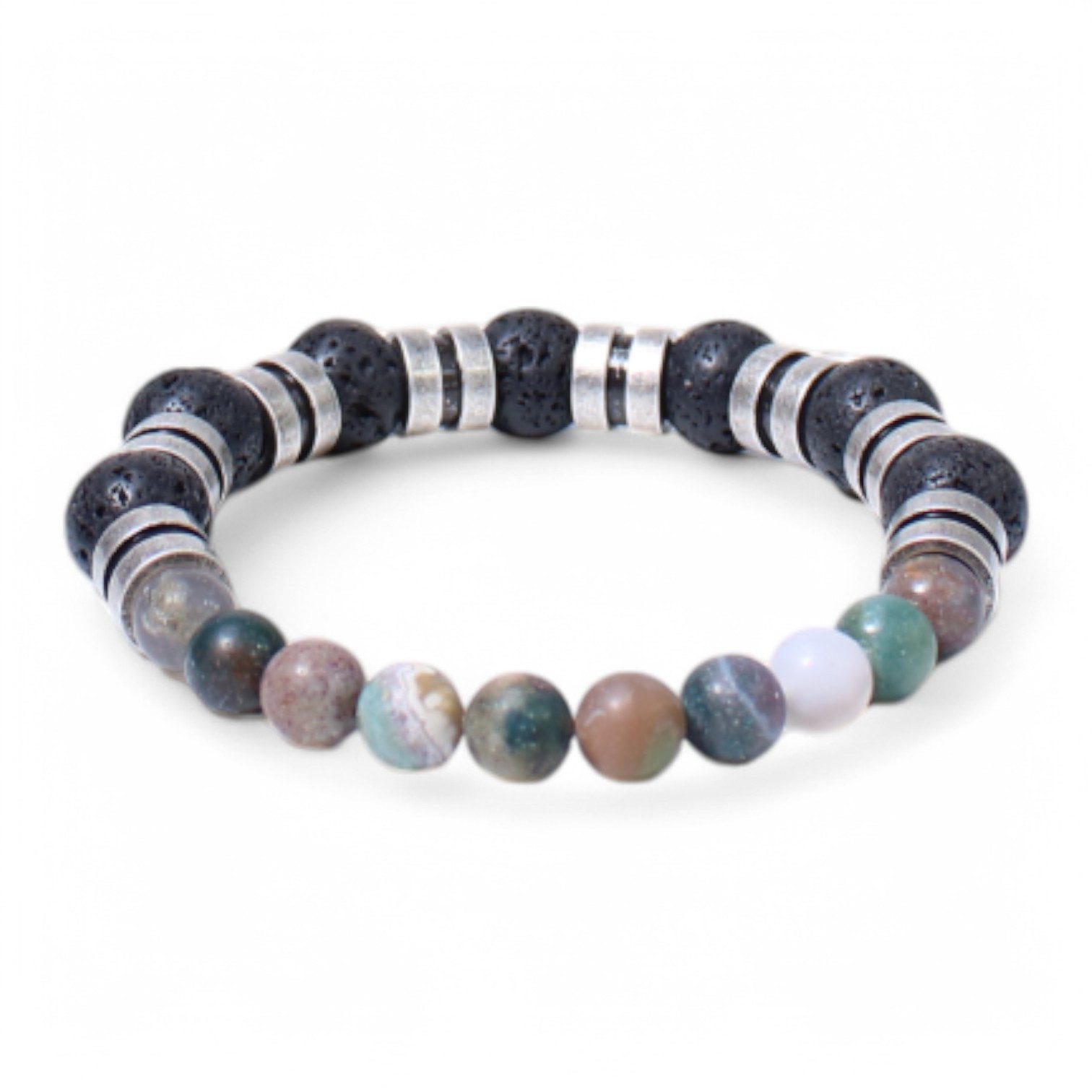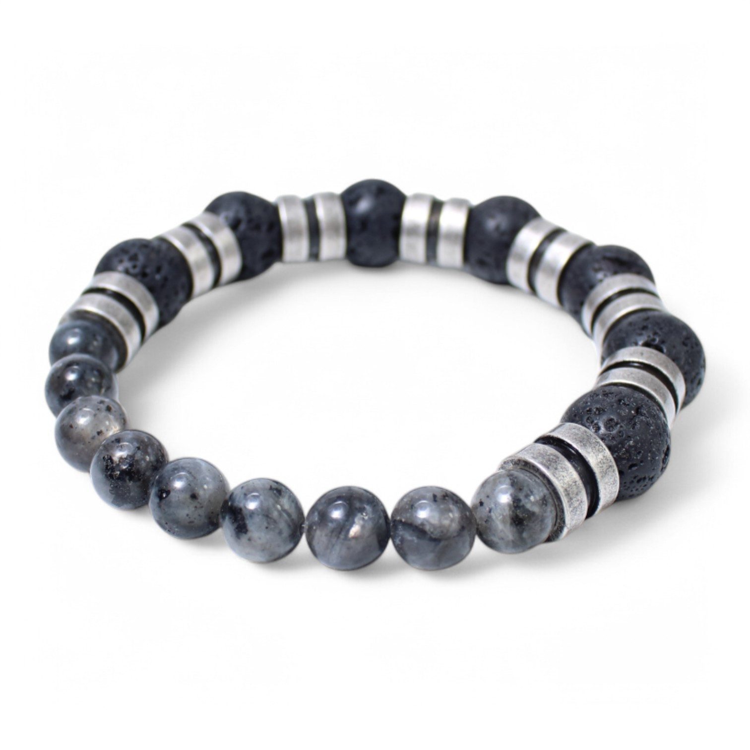 Maskulines Herrenarmband mit unterschiedlichen Arten von Perlen. Zum einen werden schwarze Lavasteinperlen abwechselnd mit einem passenden Metallteil verwendet. Die andere Seite wird mit farblich passenden Natursteinperlen veredelt. Zusammen ergibt es einen stimmigen Look.