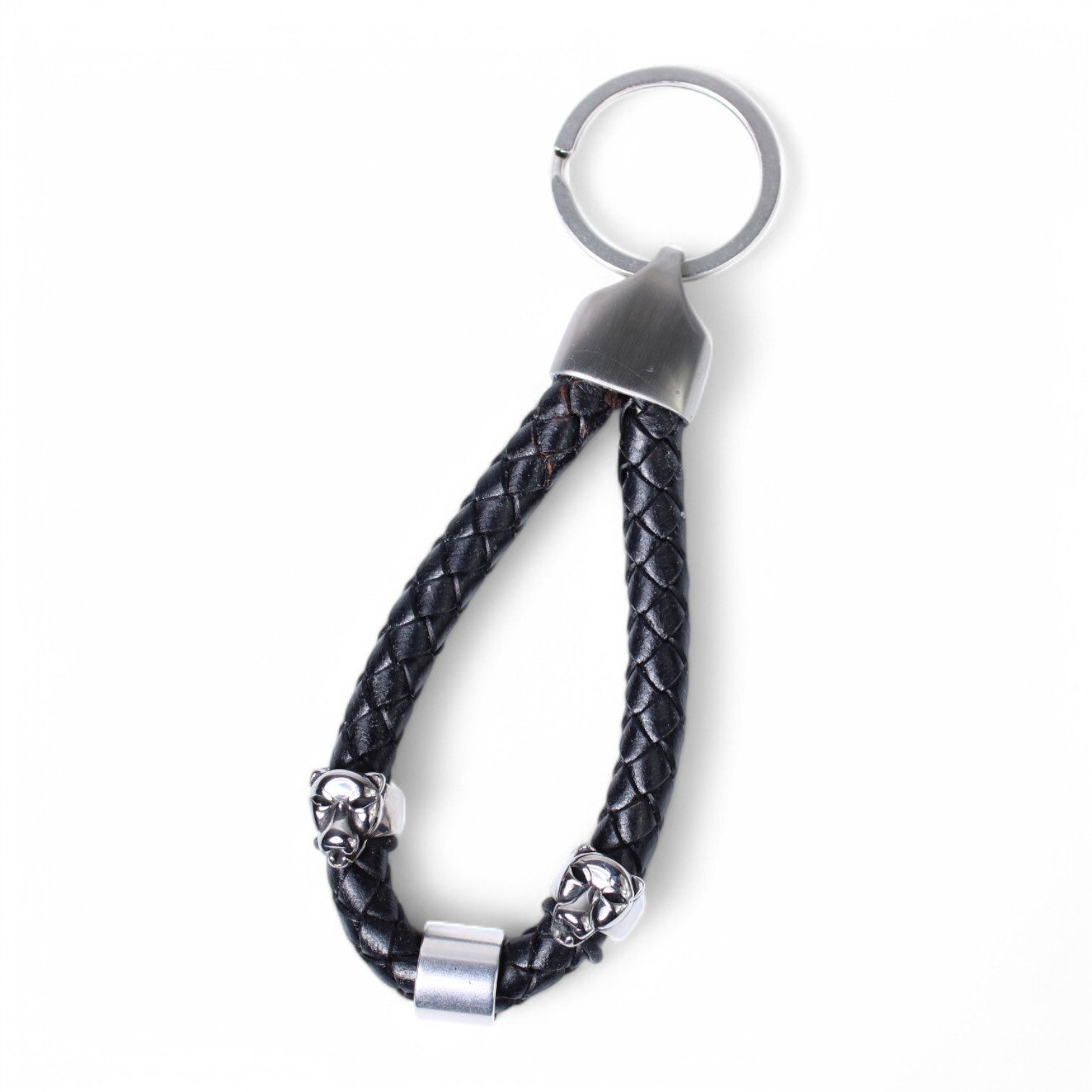 Schlüsselanhänger aus geflochtener, echter Lederkordel mit Geparden Zierteilen. Diese wirken besonders edel durch ihr glänzendes Finish und passen hervorragend zu der Lederkordel. Kappe und Schlüsselring sind aus robustem Edelstahl.