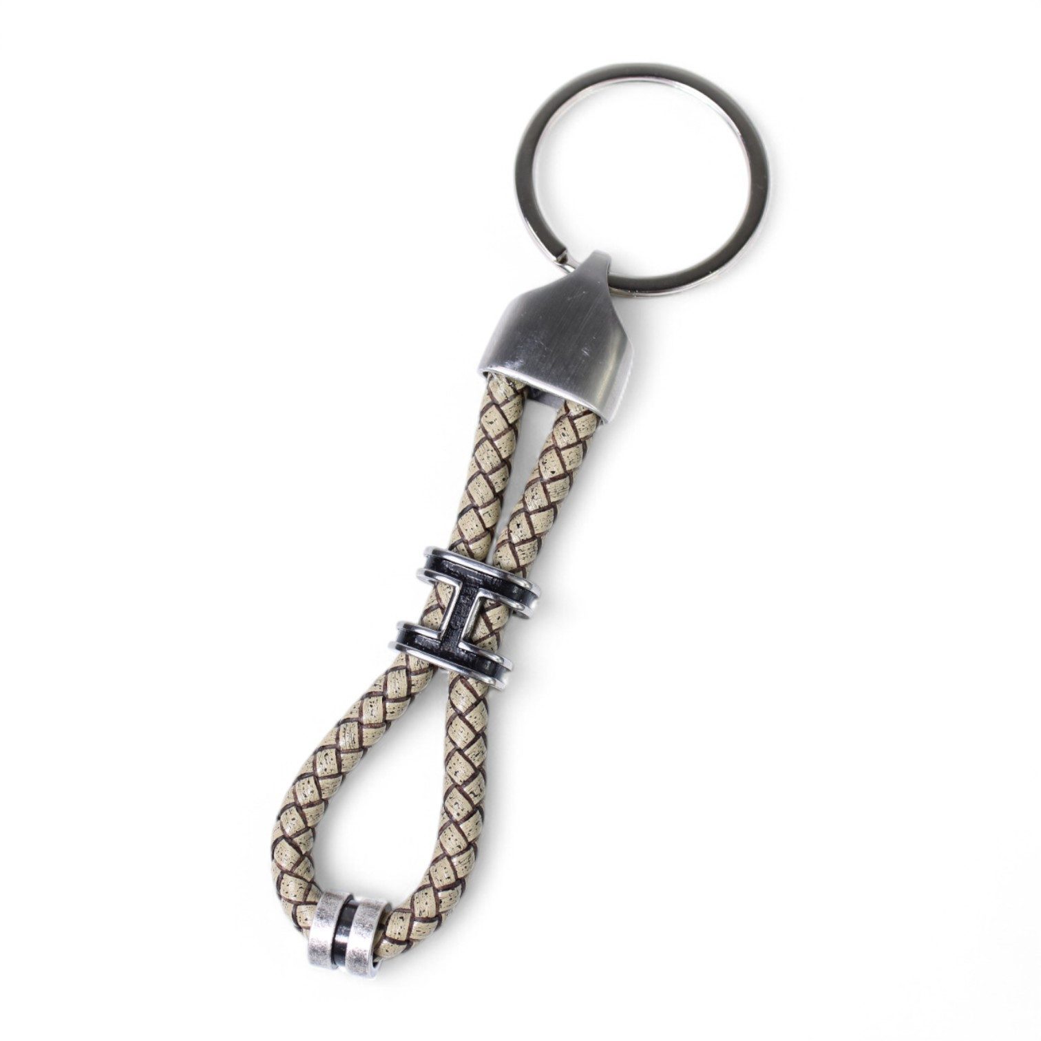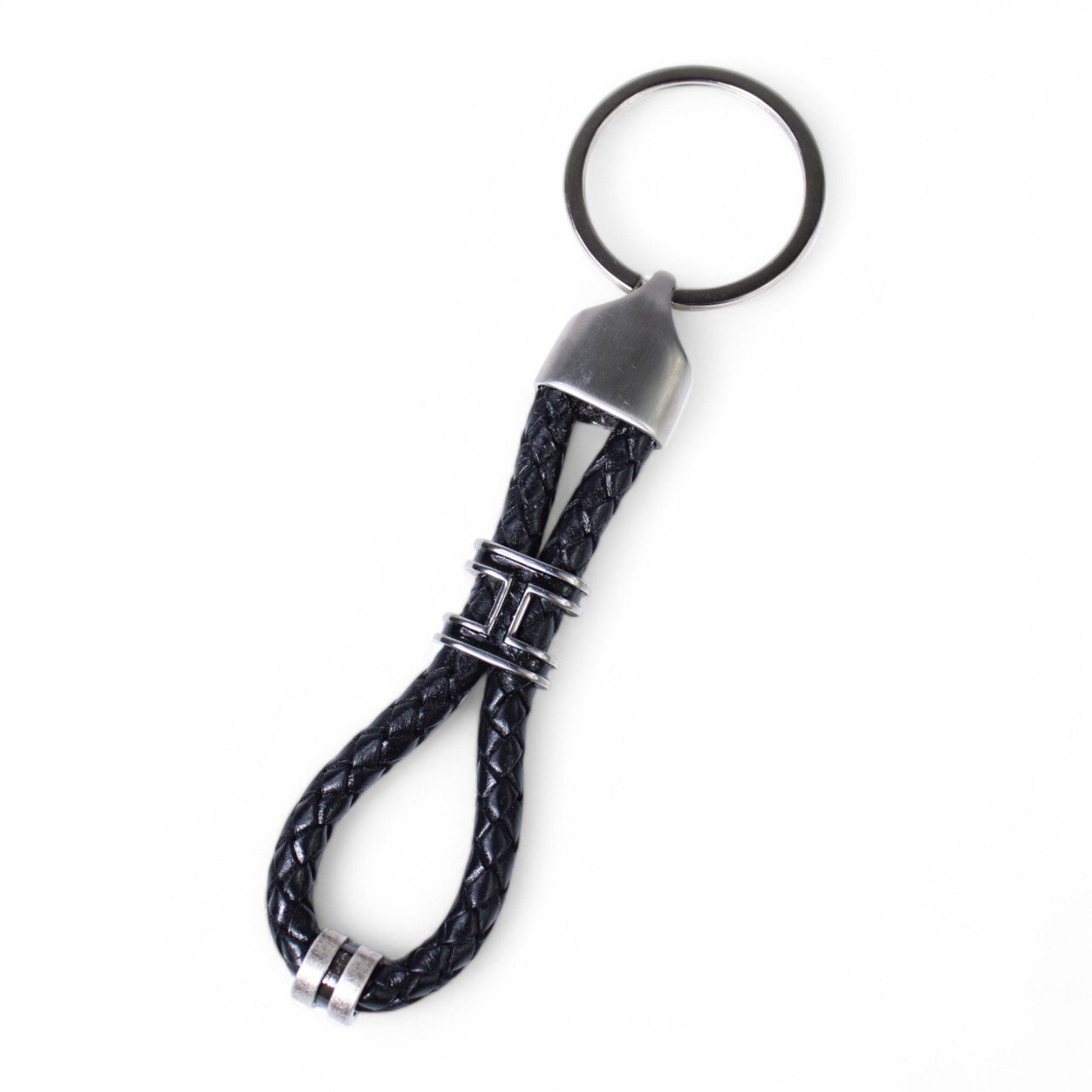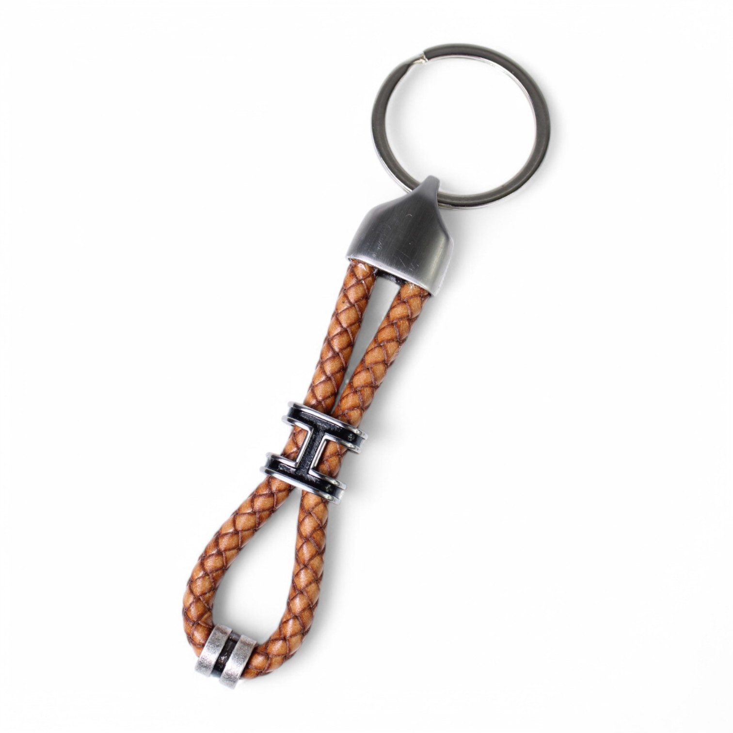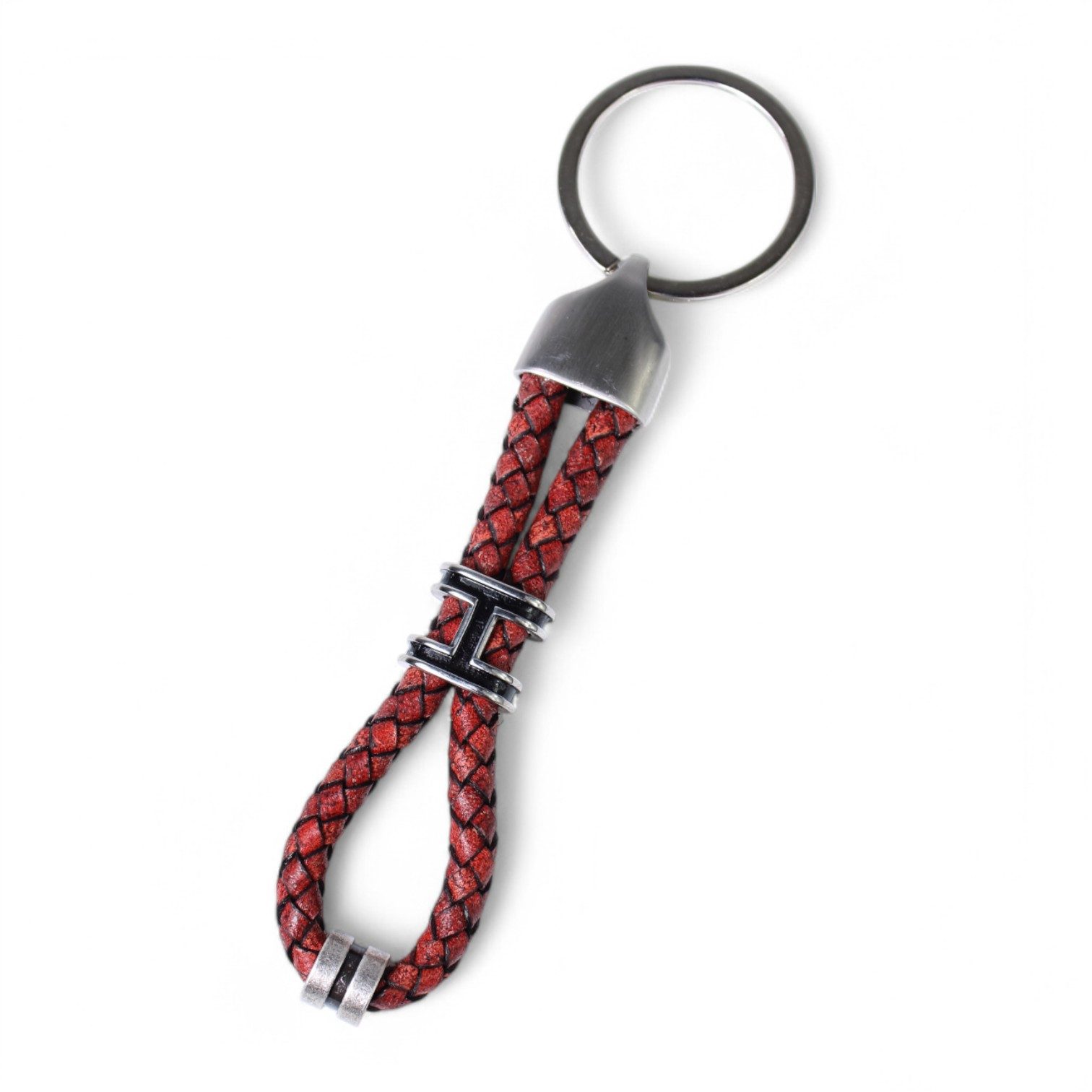 Schlüsselanhänger aus geflochtener, echter Lederkordel mit schönen Zierteilen. Diese wirken besonders edel und passen hervorragend zu der Lederkordel. Kappe und Schlüsselring sind aus robustem Edelstahl.