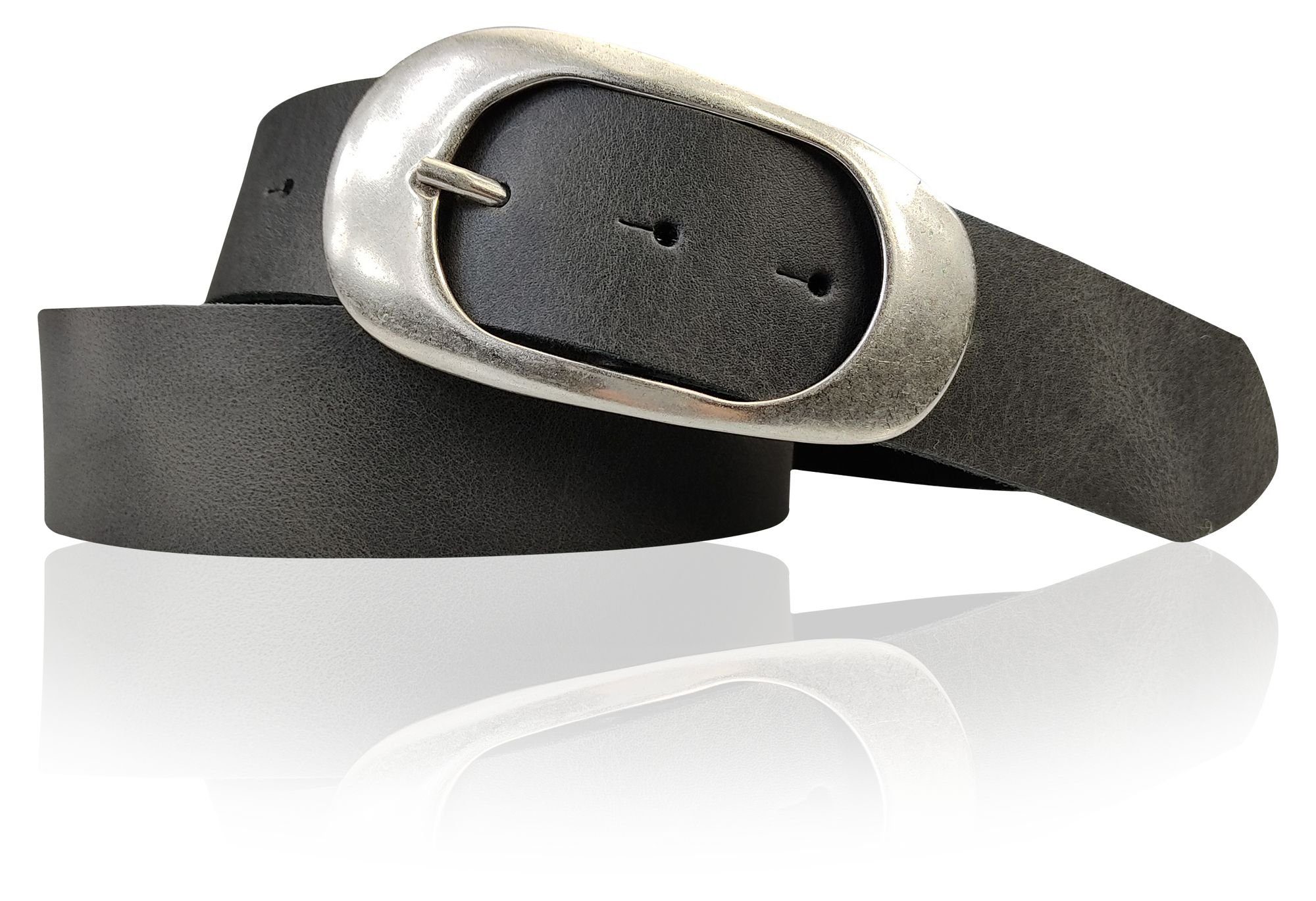 Aktueller Damengürtel mit einer großen Dornschnalle die im Retrostyle gemacht ist. Der Gürtel kann zu Jeans, in der Taille oder als Hüftgürtel getragen werden. Der Gürtelriemen ist aus Echtleder vom Rind und in großer Farbauswahl erhältlich.