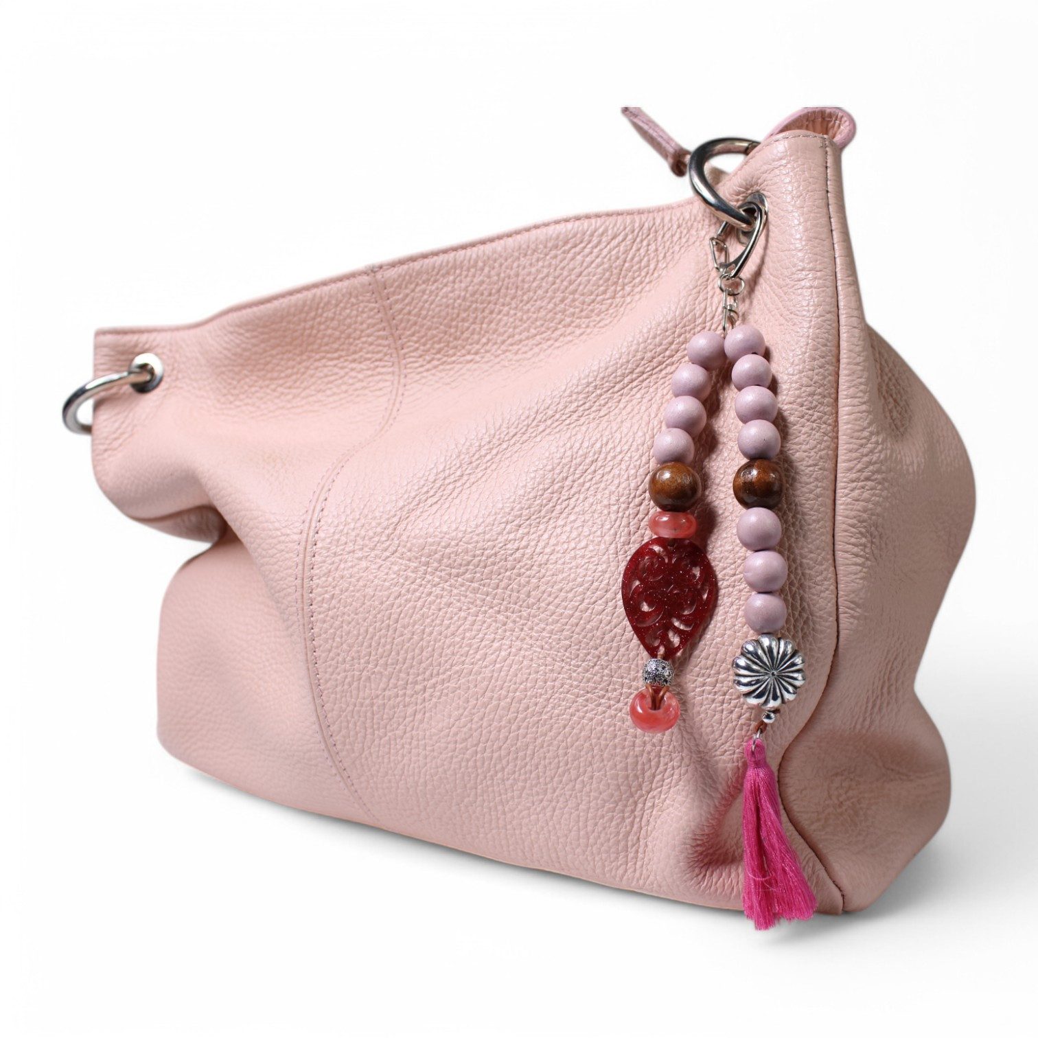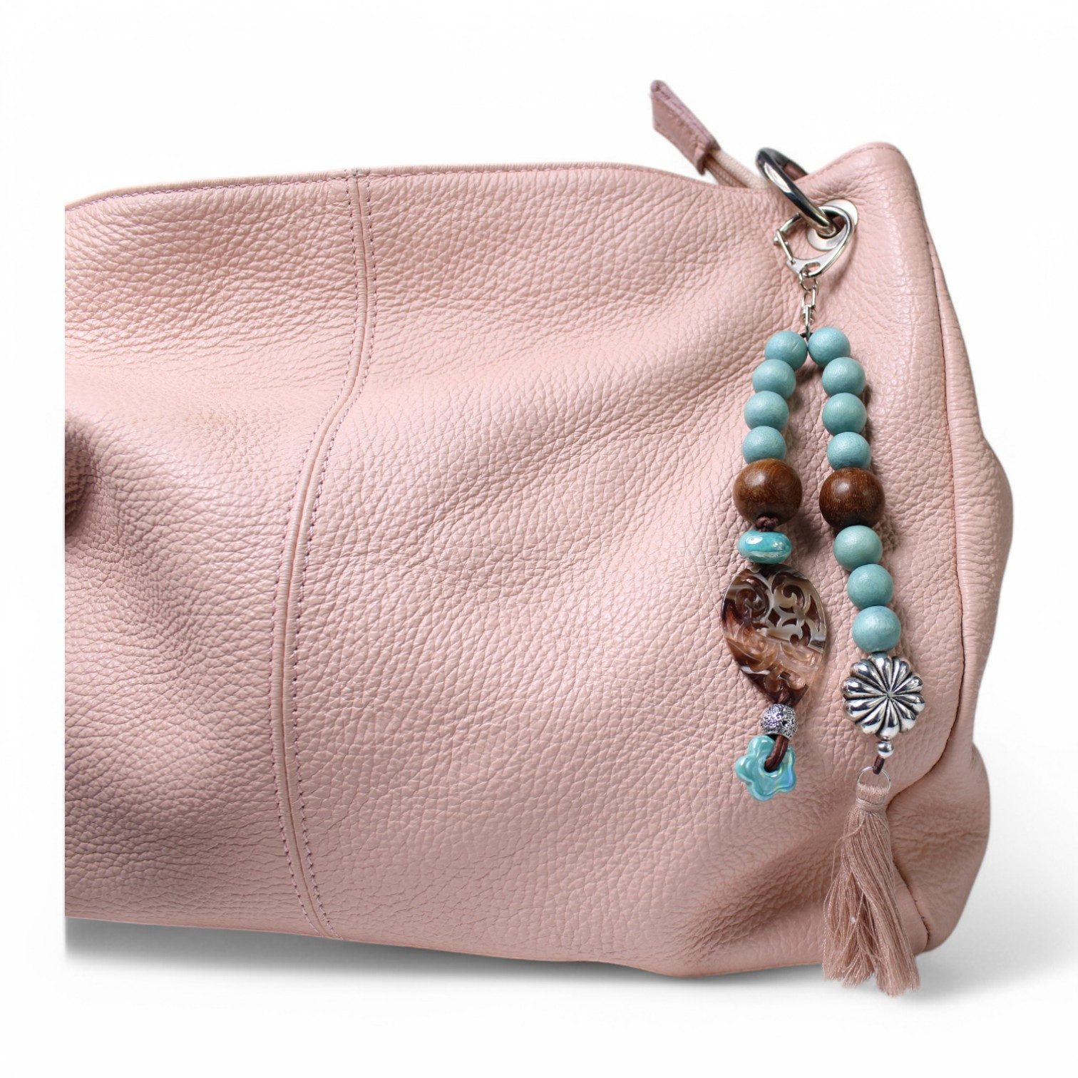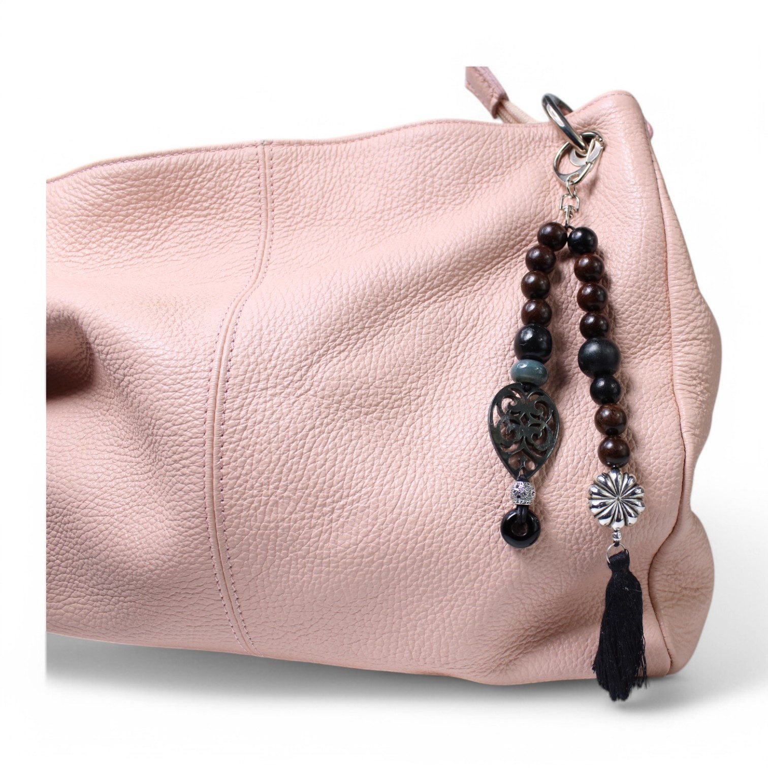 Moderner Taschenanhänger aus hochwertigen Holz-, Metall- und Keramikperlen kombiniert mit einem schönem Acrylanhänger. Mithilfe des Karabinerhakens ist es ein leichtes Anbringen an die Tasche, auch bei dickeren Trägern. Ein echter Hingucker an jeder Tasche.