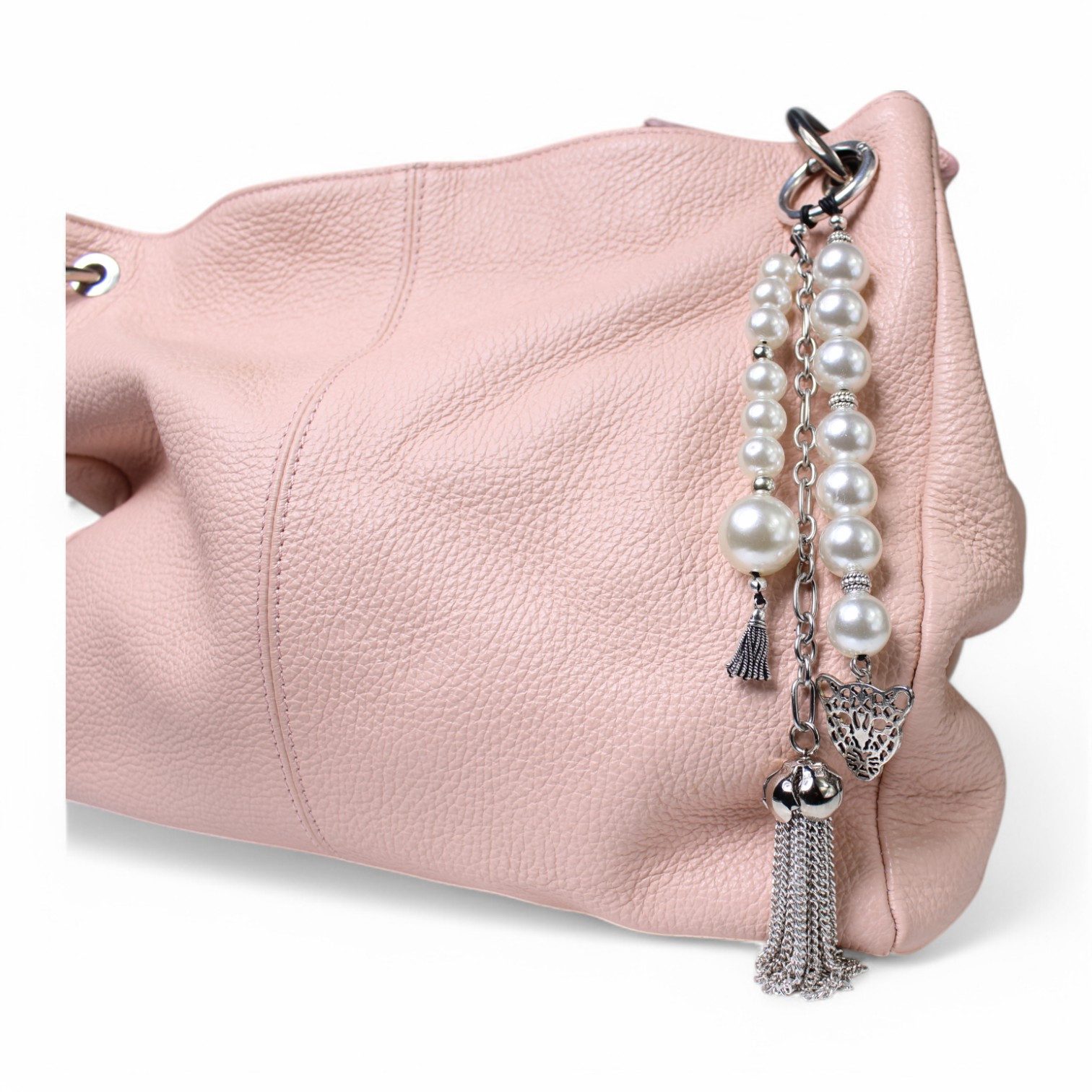 Hochmoderner Taschenanhänger aus hochwertigen Imitationsperlen mit Perlmuttglanz. Die drei verschieden gestalteten Ketten wirken edel und kann zu vielen Outfits kombiniert werden. Eine Metallkette wird von einer Metallquaste (ca. 6 cm lang) geziert. An einer Kette ist ein großer Leopardenkopf aus Metall angebracht. Всеs wirkt sehr harmonisch aufeinander abgestimmt. Mithilfe des Edelstahlrings ist es ein leichtes Anbringen an die Tasche, auch bei dickeren Trägern. Ein echter Hingucker an jeder Tasche.