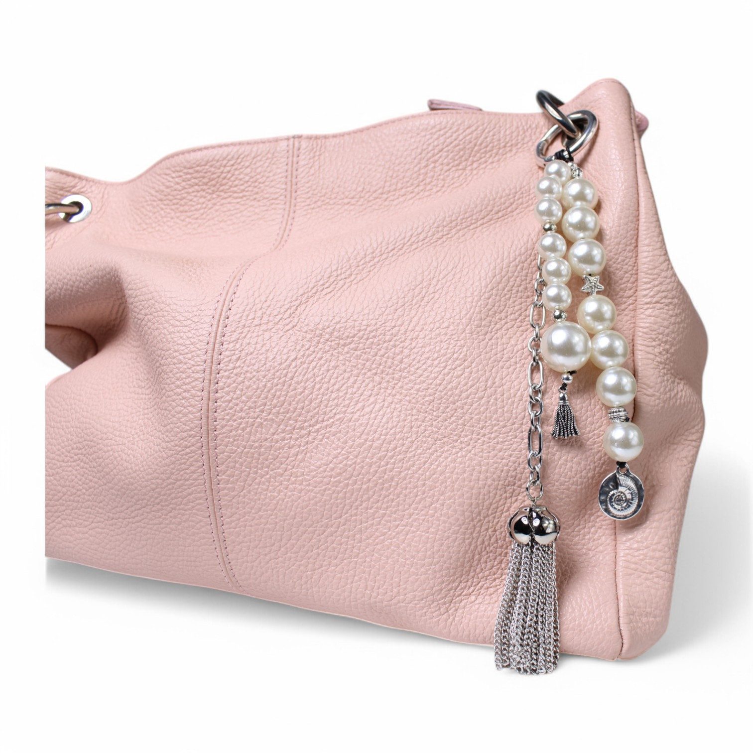 Hochmoderner Taschenanhänger aus hochwertigen Imitationsperlen mit Perlmuttglanz. Die drei verschieden gestalteten Ketten wirken edel und kann zu vielen Outfits kombiniert werden. Eine Metallkette wird von einer Metallquaste (ca. 6 cm lang) geziert. An einer Kette ist ein Muschelanhänger aus Metall angebracht. Всеs wirkt sehr harmonisch aufeinander abgestimmt. Mithilfe des Edelstahlrings ist es ein leichtes Anbringen an die Tasche, auch bei dickeren Trägern. Ein echter Hingucker an jeder Tasche.