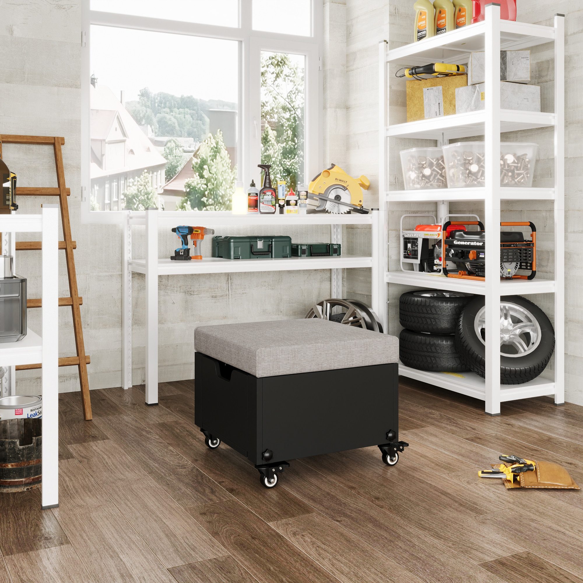 Dieser praktische Rollhocker kombiniert Sitzkomfort mit cleverer Stauraumlösung. Die weiche, mit grauem Stoff bezogene Sitzfläche sorgt für bequemes Sitzen, während die schwarze MDF-Konstruktion robust und langlebig ist. Eine seitlich herausziehbare Schublade mit Griffmulde bietet Platz für Werkzeuge, Utensilien oder Zubehör. Dank der stabilen Eisenkonstruktion und vier feststellbaren Rollen lässt sich der Hocker flexibel bewegen und sicher fixieren. Die Sitzhöhe kann mithilfe von vier handfestziehbaren Sternschrauben individuell angepasst werden – perfekt für Werkstatt, Hobbyraum oder Büro.