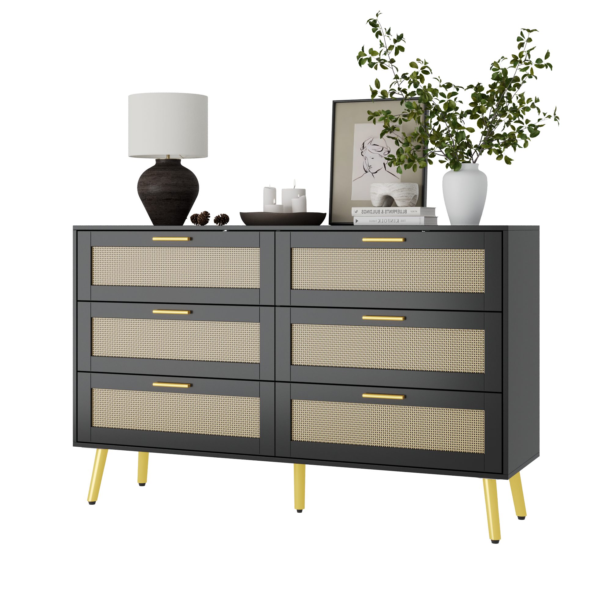 Dieses stilvolle Sideboard vereint modernes Design mit natürlichem Charme. Die sechs Schubladen mit dekorativem Rattangeflecht-Element bieten großzügigen Stauraum für Kleidung, Haushaltsartikel oder persönliche Gegenstände. Schwarze MDF-Oberflächen, elegante goldfarbene Griffe und stabile Beine aus Metall mit goldener Beschichtung verleihen dem Möbelstück eine edle Ausstrahlung. Die untergebauten Metallschienen sorgen für sanftes Öffnen und Спрятать der Schubladen. Ideal für Wohnzimmer, Schlafzimmer oder Flur – dieses Sideboard bringt Ordnung und Eleganz in Ihr Zuhause.