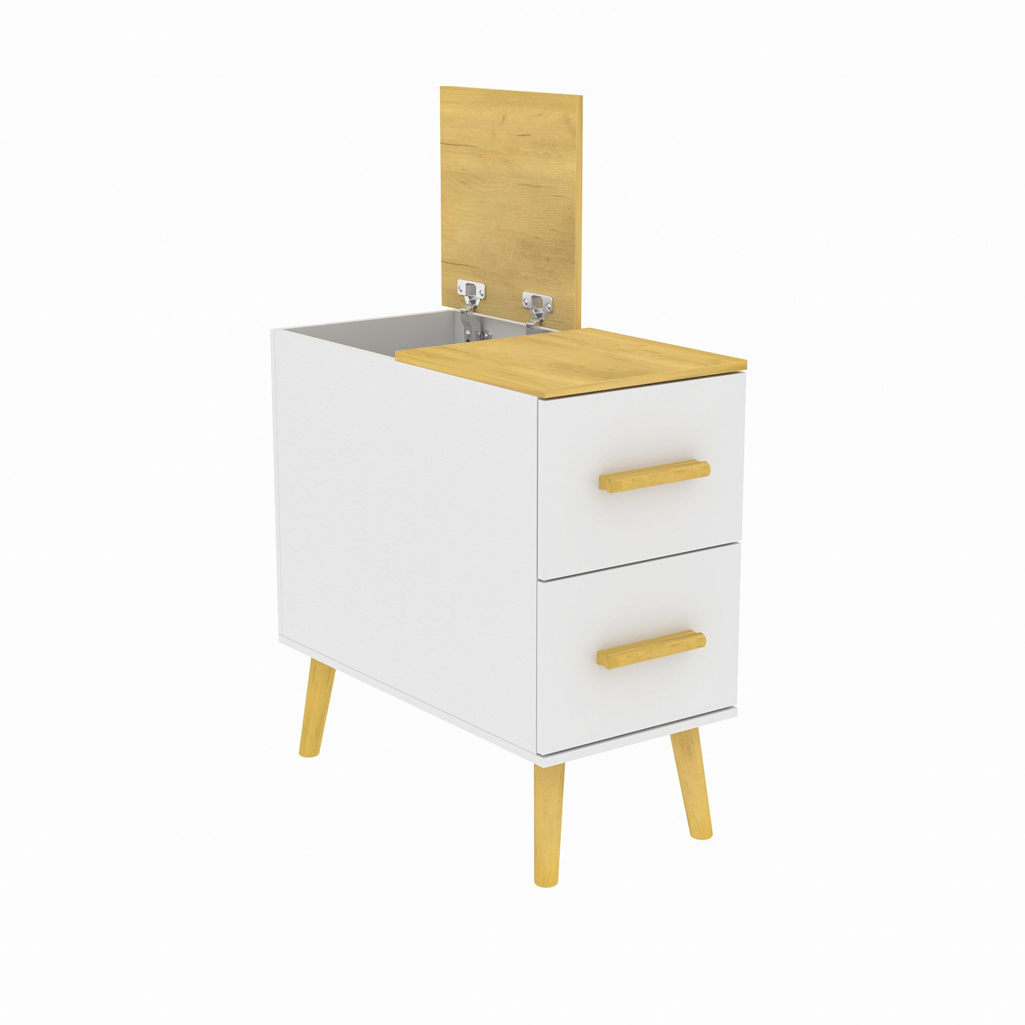 Dieser stilvolle Nachttisch oder Beistellschrank kombiniert minimalistisches Design mit maximaler Funktionalität. Die zwei leichtgängigen Schubladen bieten Platz für Bücher, Notizen oder kleine Alltagsgegenstände, während sich im hinteren, aufklappbaren Fach diskret größere Utensilien verstauen lassen – ideal für Kosmetik, Snacks oder Pflegeprodukte. Dank der kompakten Maße passt das Möbelstück sowohl ins Schlafzimmer als auch neben das Sofa im Wohnzimmer.