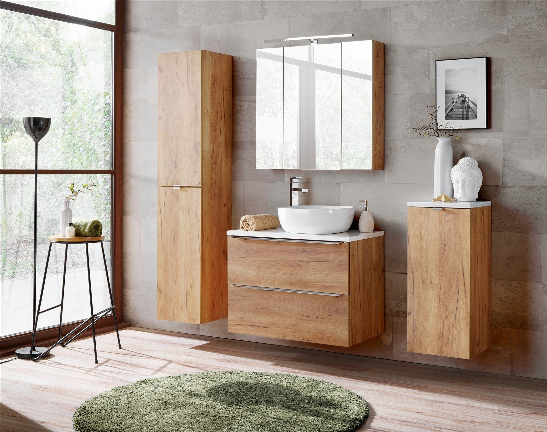 Lieferumfang | 1 x Waschbeckenunterschrank 1 x Hängeschrank groß 1 x Hängeschrank klein 1 x Spiegelschrank inkl. LED |