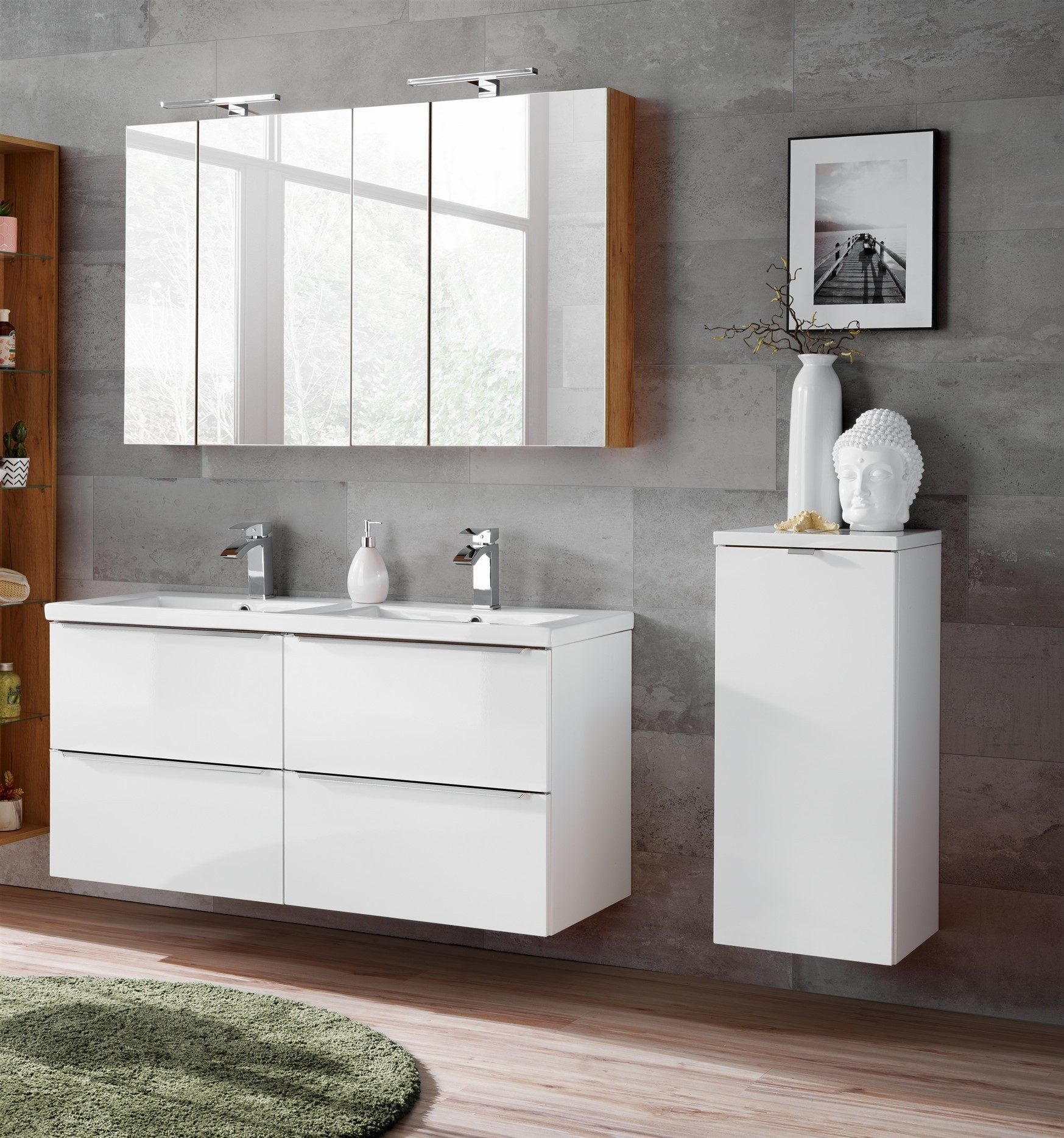 Lieferumfang | 2 x Waschbeckenunterschrank 1 x Hängeschrank 2 x Spiegelschrank inkl. LED 1 x Waschbecken |