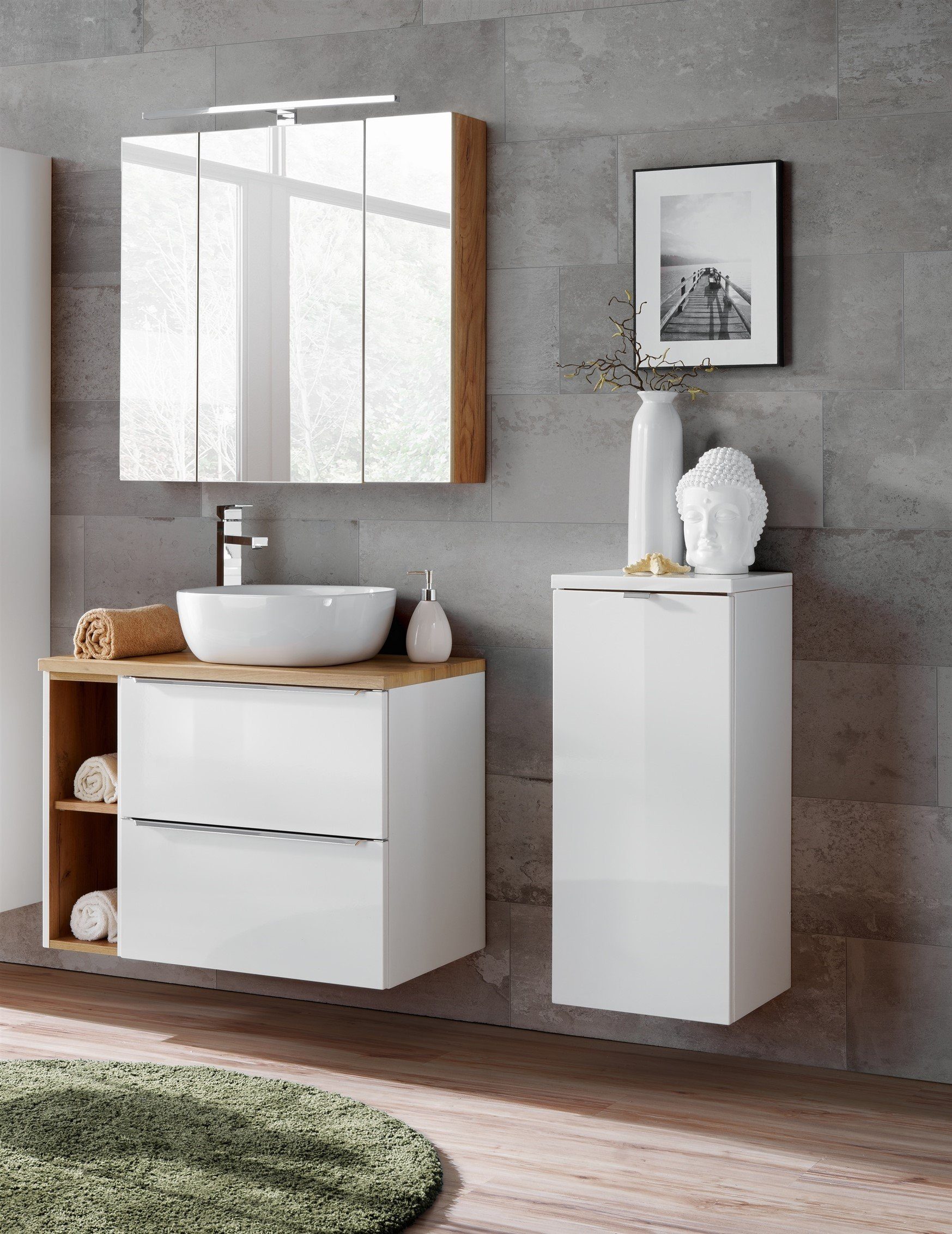 Lieferumfang | 1 x Waschbeckenunterschrank 1 x Hängeschrank 1 x Spiegelschrank inkl. LED 1 x Waschbecken wählbar 1 x Abdeckplatte Waschtisch |