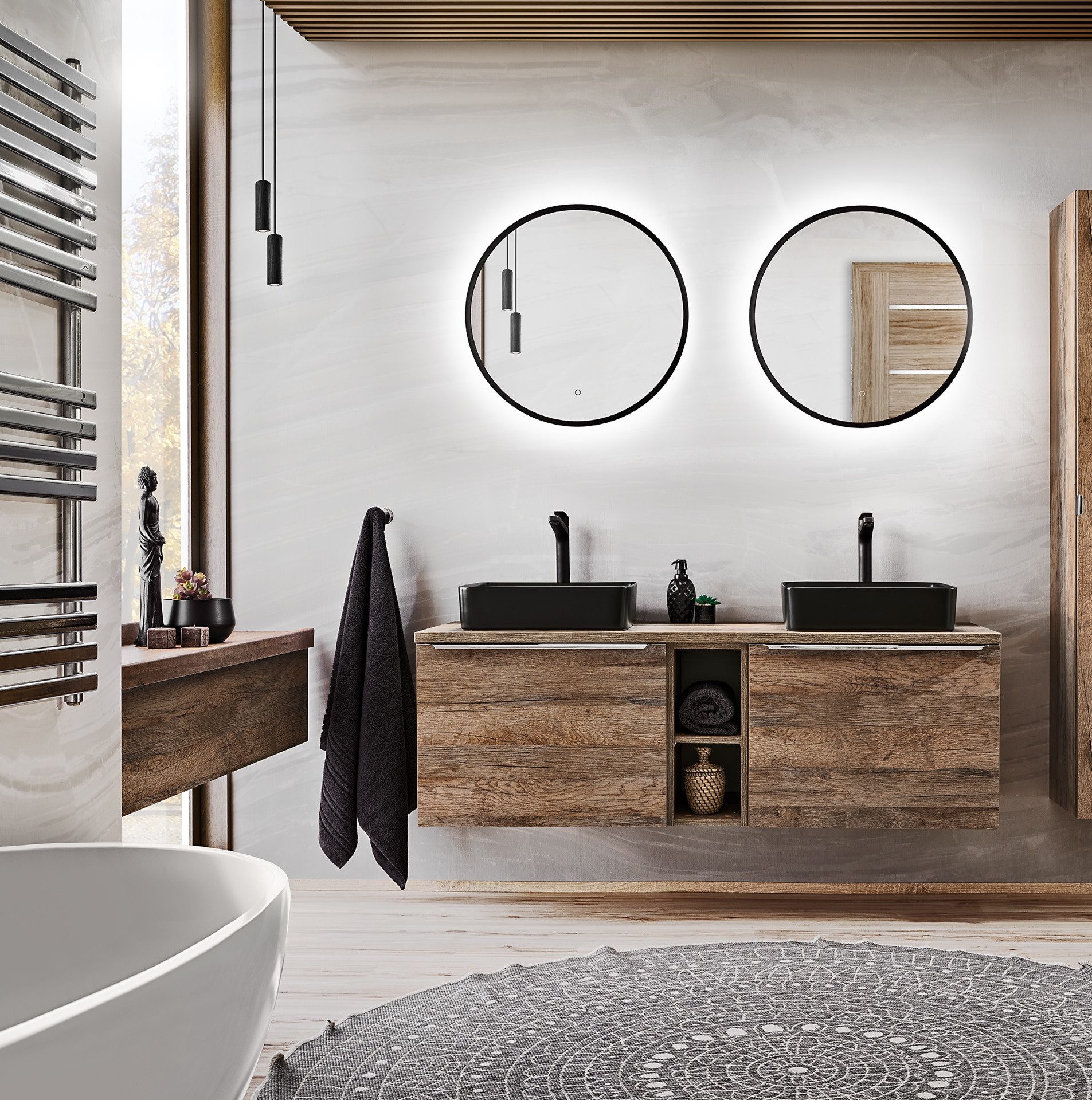 Set beinhaltet | Waschbeckenunterschränke, LED-Spiegel |