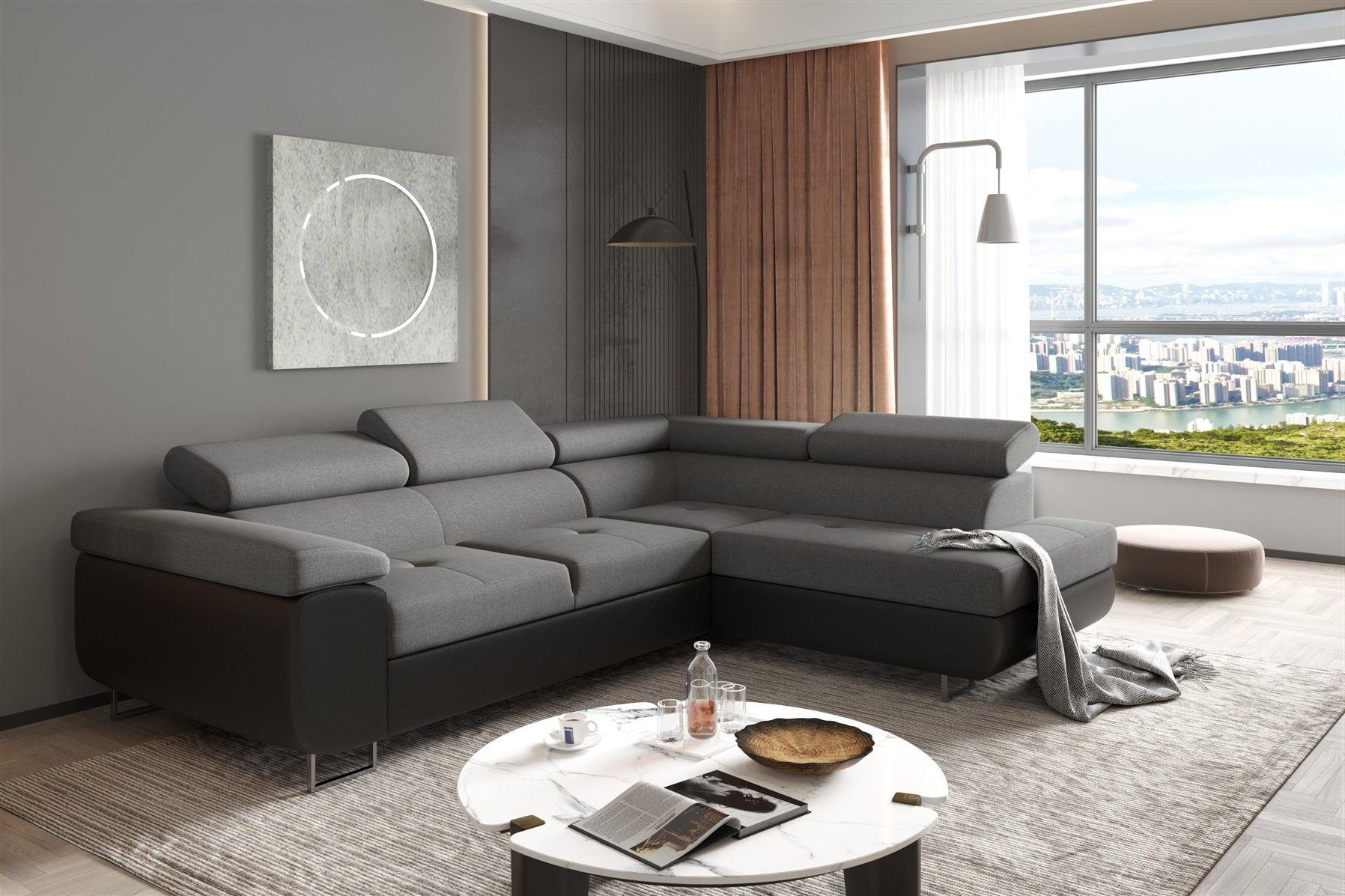 Ausführung | Couchgarnitur JADE Schwarz-Grau mit Schlaffunktion Ottomane Rechts |