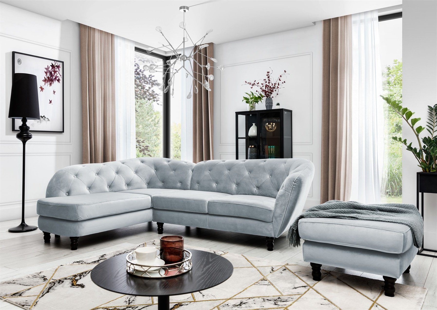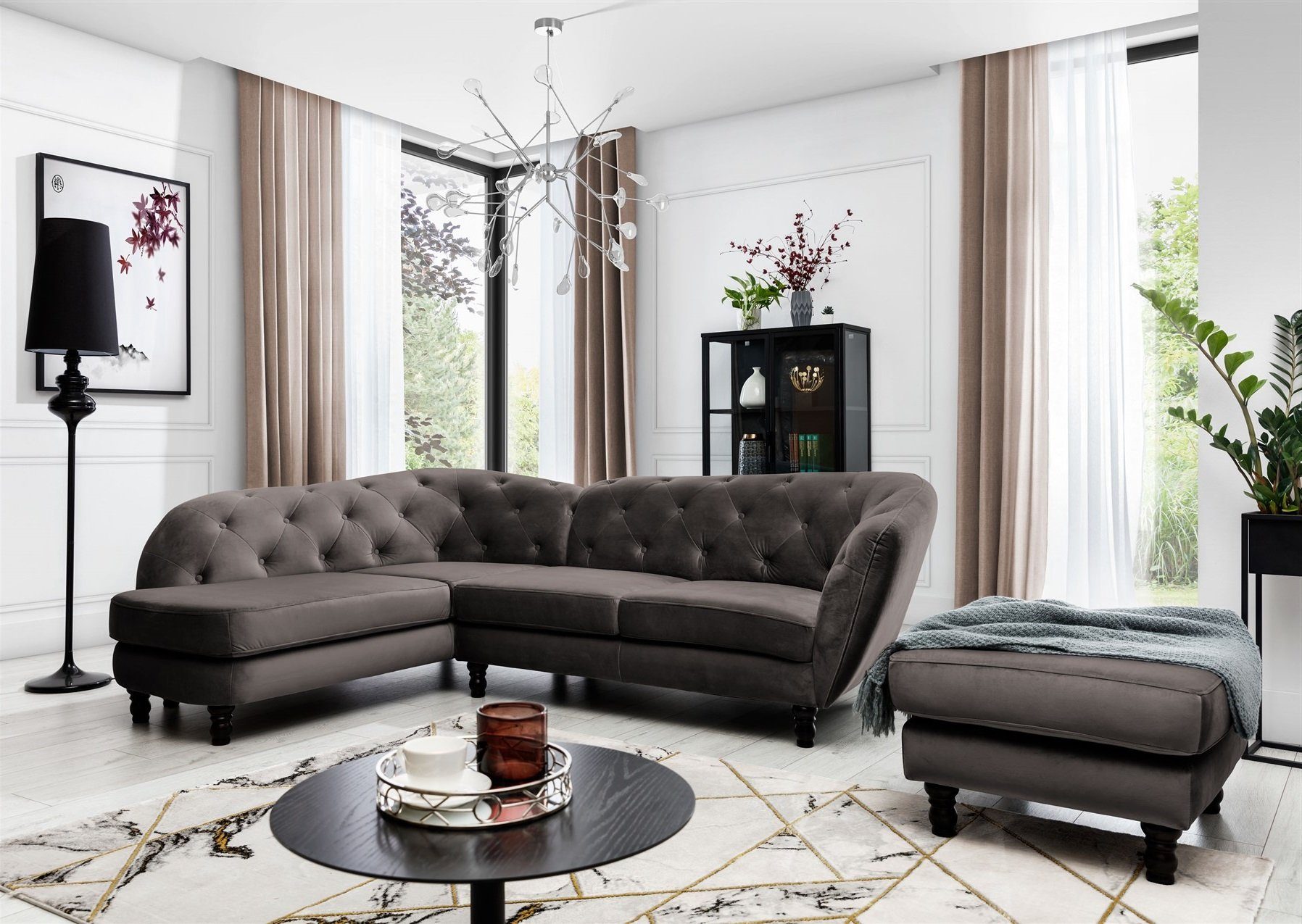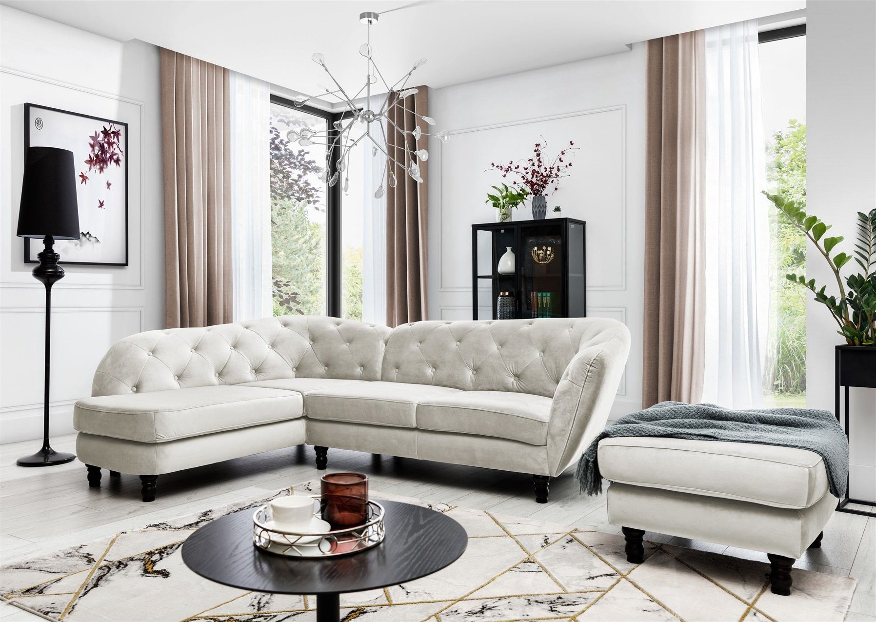 Modellbezeichnung | Ecksofa CHARLOTTE incl. Hocker in Stoff Matt Velvet Ottomane Li/Re |