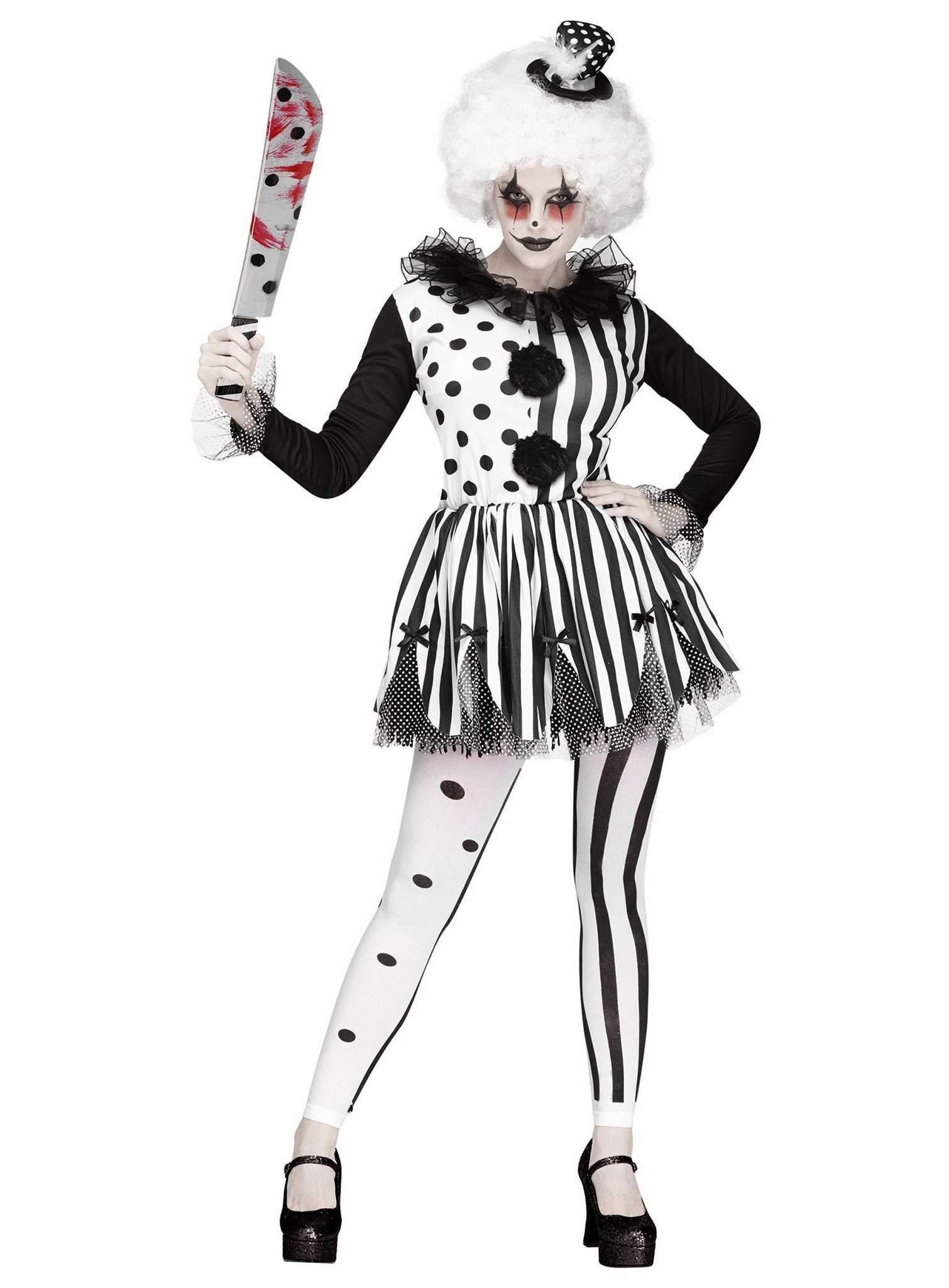 Ausstattung | - Psycho Pantomimin Kostüm dreiteilig- Kleid mit angenähtem Organza-Rock und Kragen- Mini-Hut mit Haarspange- mit Leggings- ohne Perücke und Machete |