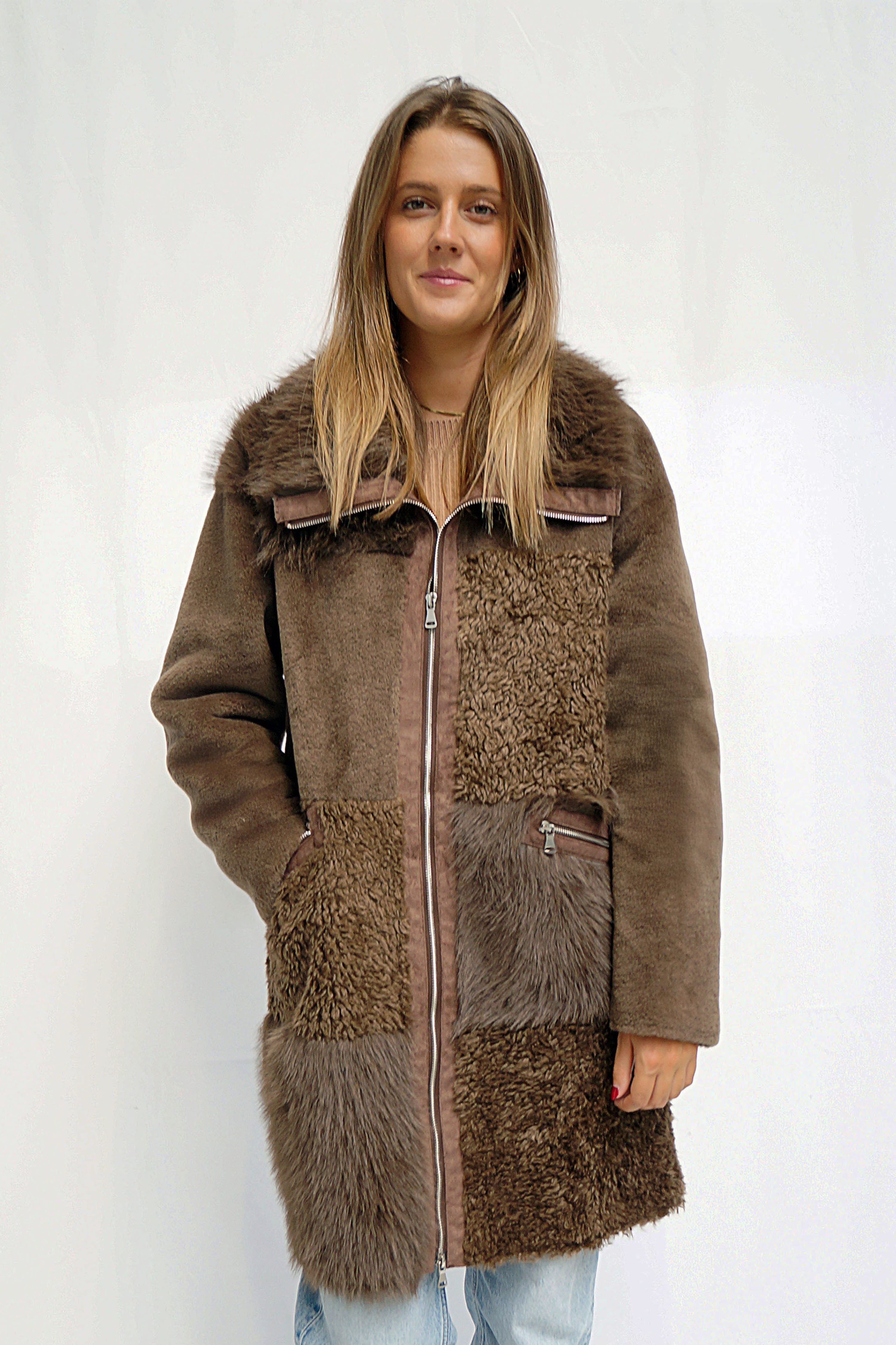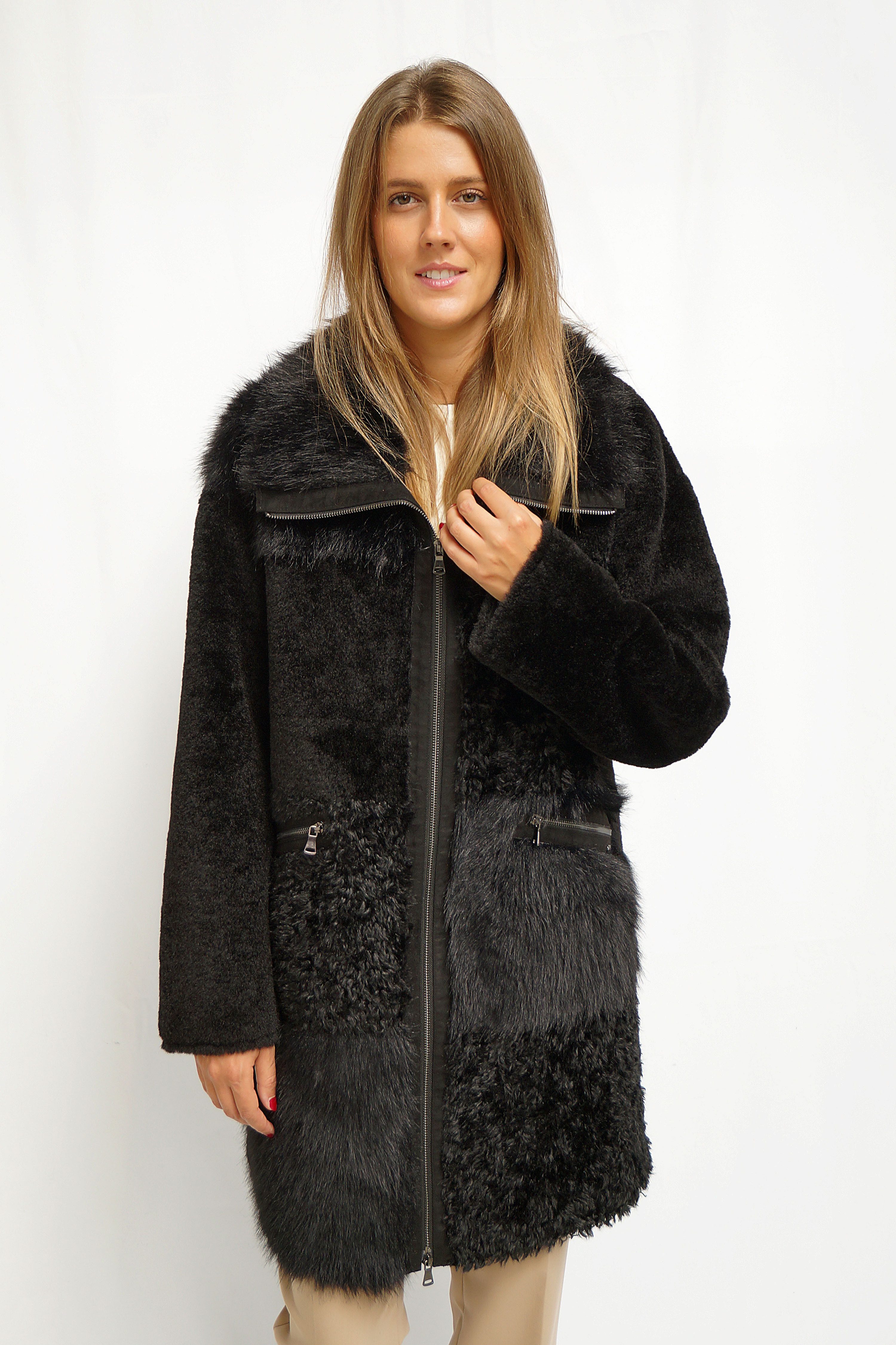 Dieser hochwertige Damenmantel aus Lammfellimitat ist ein echtes Fashion-Statement und verbindet luxuriösen Look mit raffinierten Materialien. Das absolute Highlight: Das Vorderteil besteht aus unterschiedlich strukturierten Fake-Fur-Stücken, die dem Mantel eine einzigartige, stilvolle Optik verleihen. Der auffällige Umlegekragen aus langhaarigem Fake-Fuchsfell wirkt voluminös und weich zugleich – ein echter Eyecatcher mit Wohlfühlfaktor. Die Ärmel und das Rückenteil setzen bewusst einen ruhigen Kontrast: Sie sind aus clean gearbeitetem, kurz geschorenem Kunstfell gefertigt, was dem Mantel eine klare, moderne Silhouette verleiht. Der moderne 2-Wege-Reißverschluss mit Lederumrandung betont das exklusive Design, während die großen Reißverschlusstaschen mit Kunstlederbesatz nicht nur stylisch, sondern auch praktisch sind. Mit einer Rückenlänge von ca. 89 cm bei Размер 38 bietet dieser Mantel angenehme Wärme an kalten Tagen und lässt sich ideal zu urbanen Looks oder eleganten Winter-Outfits kombinieren.