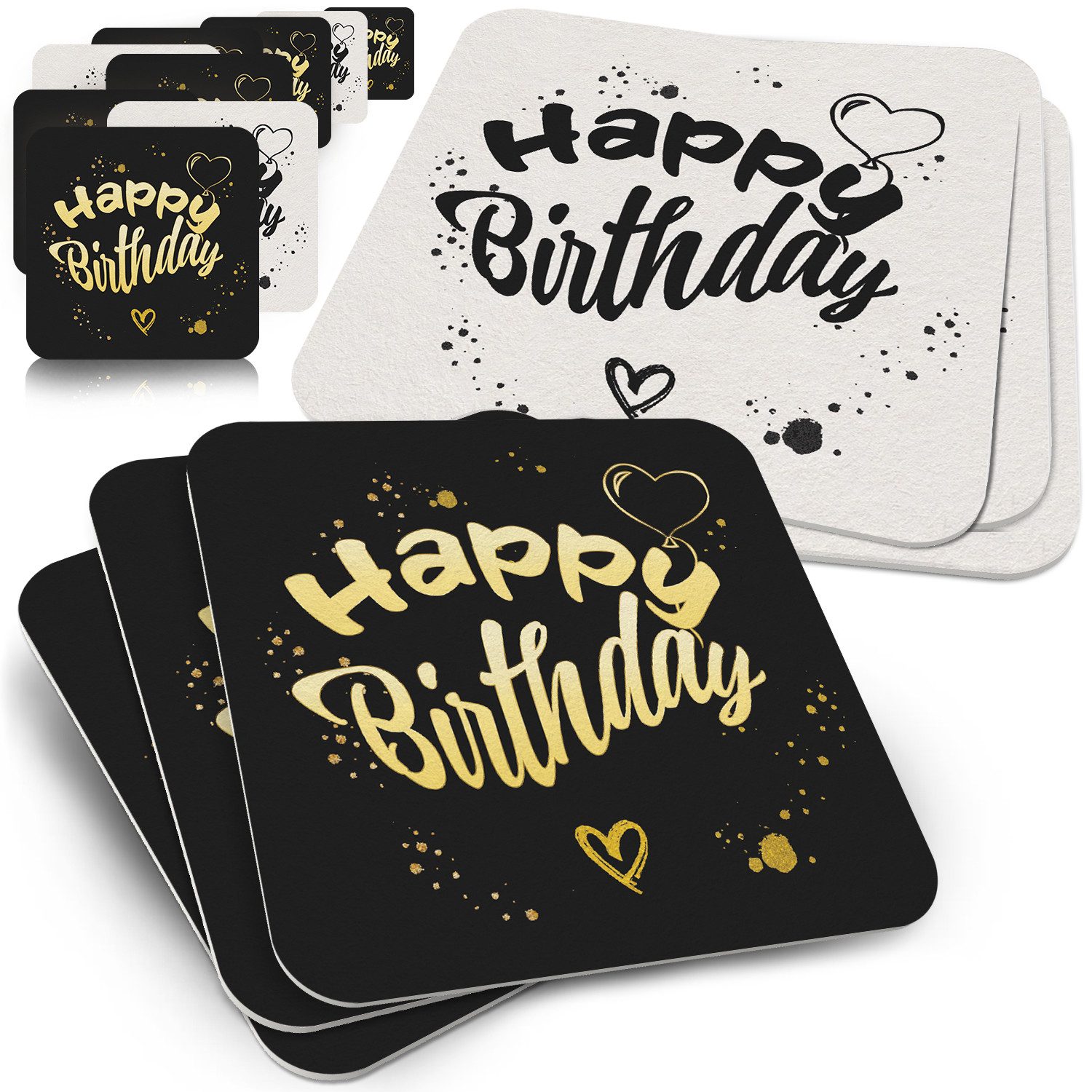 Elegante Feierlichkeit: Schwarz-goldene Bierdeckel mit "Happy Birthday"-Schriftzug, die jedem Geburtstag Glanz verleihen.