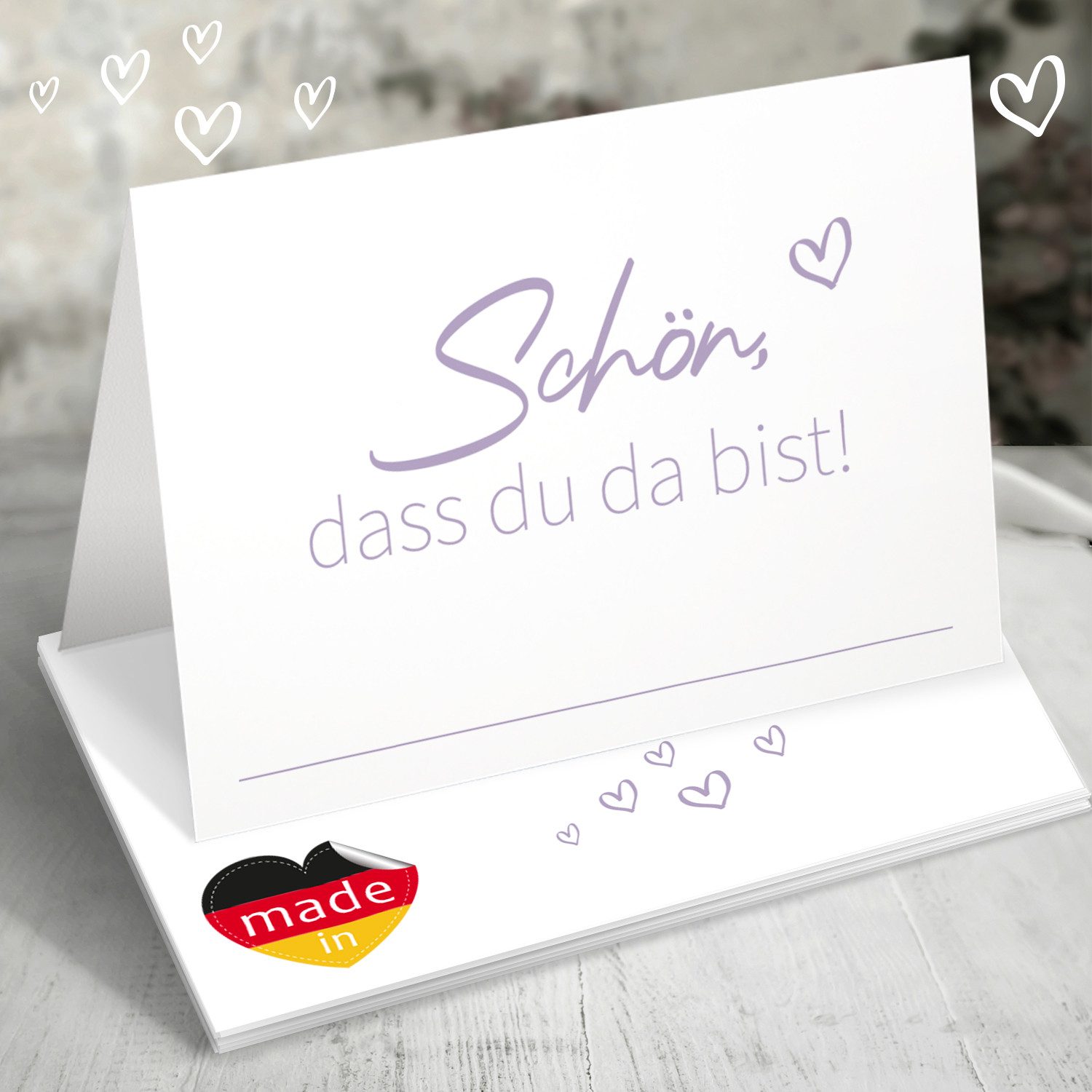 Die eleganten Funke & Brand 50 Tischkarten für Hochzeiten und Geburtstage sind die perfekte Ergänzung für jede festliche Tafel. Mit den Abmessungen von 85x55mm bieten sie ausreichend Platz für eine persönliche Beschriftung, um Ihre Gäste stilvoll willkommen zu heißen. Das ansprechende Design in Lila, kombiniert mit dem herzlichen Schriftzug "Schön, dass du da bist", macht diese Tischkarten zu einem Highlight jeder Tischdeko.