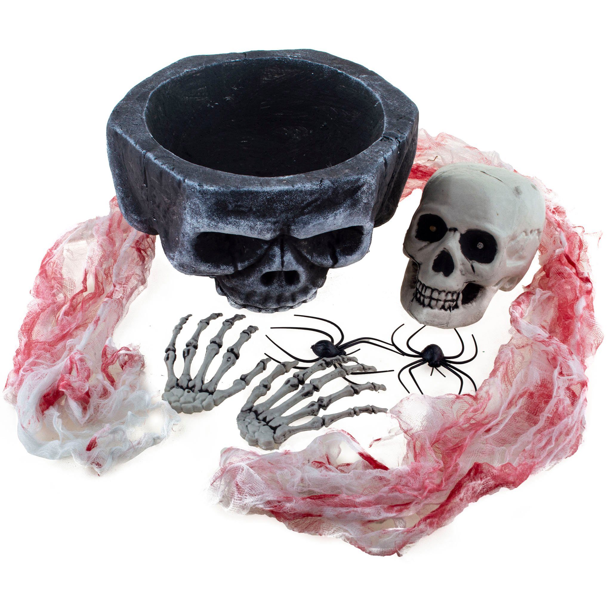 Lieferumfang | Totenkopf Schüssel, Totenkopf mit leuchtenden Augen, zwei Skeletthände, zwei Spinnen und ein blutiger Stofffetzen (inkl. 3xLR44) |