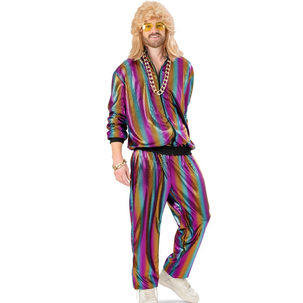 Lass die 80er Jahre in schillernden Regenbogenfarben wieder aufleben! Mit dem Jogginganzug Regenbogen Randy für Herren bist du bereit, auf jeder Party im Mittelpunkt zu stehen. Egal ob Fasching, CSD, 80er-/90er-Jahre-Mottoparty oder einfach ein witziger Abend mit Freunden – dieser schrille Anzug bringt Farbe und Spaß in jede Veranstaltung!