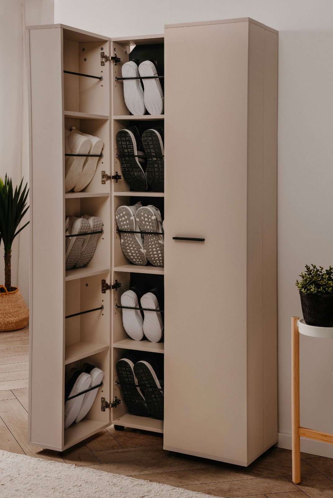 erleben Sie den Schuhschrank "Logu" von Furn.Design - das perfekte Möbel für die Schuhaufbewahrung Ihrer Familie! Mit seinem sandfarbenen Dekor und den eleganten schwarzen Griffleisten ist der Schrank nicht nur praktisch, sondern auch ein echter Blickfang in Ihrem Flur. Die ABS-Kante sorgt für eine robuste und langlebige Konstruktion, während die zwei Türen mit Rollen einen bequemen Zugang zu den 15 Fächern bieten. Platzieren Sie bis zu 30 Paar Schuhe und Stiefel ordentlich und platzsparend in diesem 74 x 182 x 34 cm großen Schrank Logu.