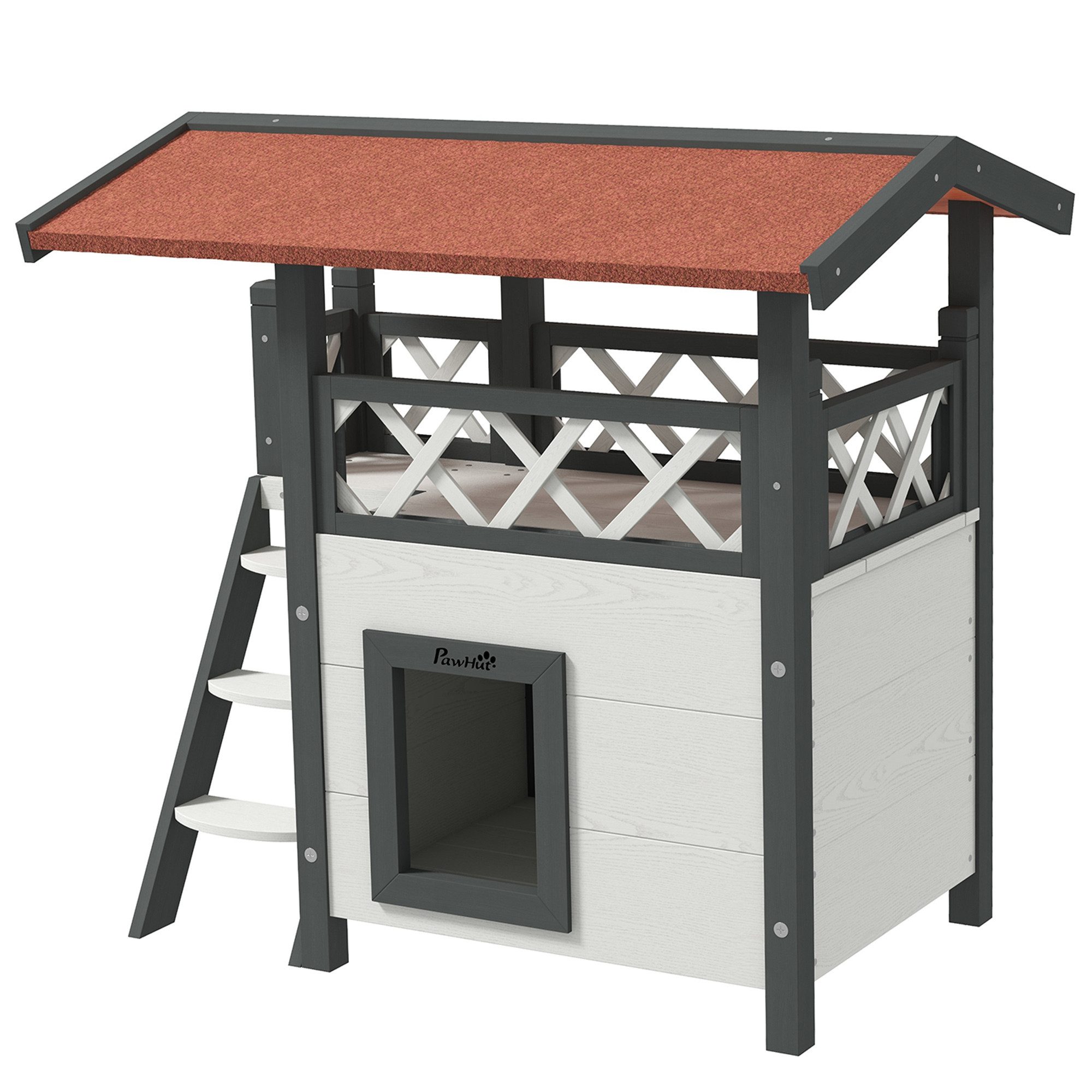 Unser zweistöckiges Katzenhaus ist ideal für kleine Samtpfoten. Das Katzenhaus hat ein Asphaltdach und einen wasserfesten Anstrich, sodass es wasser- und wetterfest ist. Das Haus hat drei Katzenhöhlen, Sprungbretter, Türen und einen lustigen Eingang für Ihre Katze. In der untersten Höhle kann ein Katzenklo aufgestellt werden. Dieses Katzenhaus ist ein wunderbares Zuhause für Ihre Katze.
