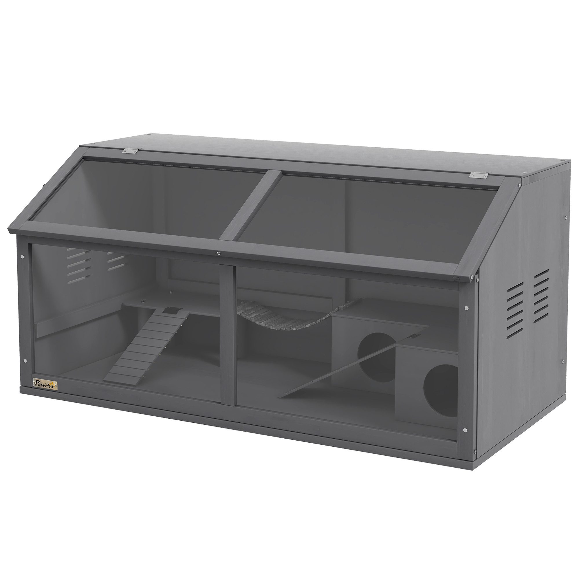 Schaffen Sie Ihrem Haustier mit unserem Hamsterheine spannende Lebenswelt! Das geräumige Design bietet Platz für ausreichend Holzspäne, damit Ihr pelziger Freund darin wühlen und spielen kann. Der Kleintierstall ist mit einer Hängebrücke, einem Häuschen, Leitern und einer Plattform ausgestattet. Er bietet endlosen Spaß und Erkundungsmöglichkeiten. Einfacher Zugang und Platz für Utensilien bietet der Stauraum, mit aufklappbarer Tür, an der Oberseite.