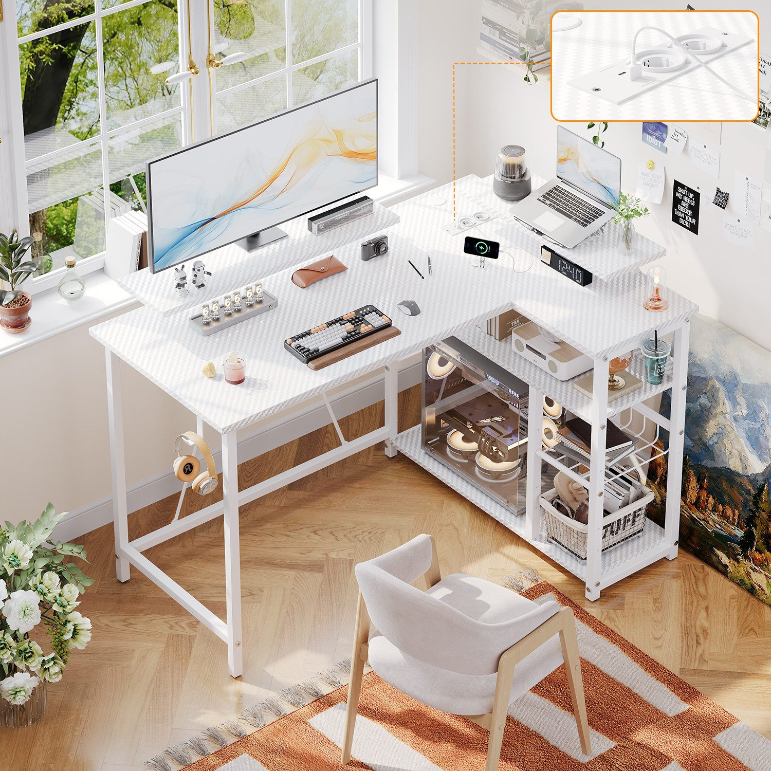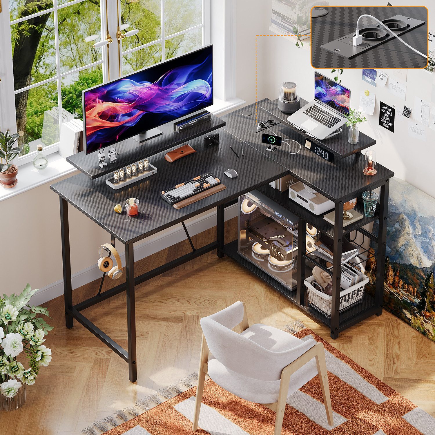 Flexibles Layout für Vielseitigkeit: Das einzigartige Eckdesign spart Platz und bietet gleichzeitig eine größere Nutzfläche. Tischplatten in verschiedenen Größen und Regalkombinationen bieten mühelos Platz für zwei Monitore, Figuren, Bücher und andere Gegenstände.