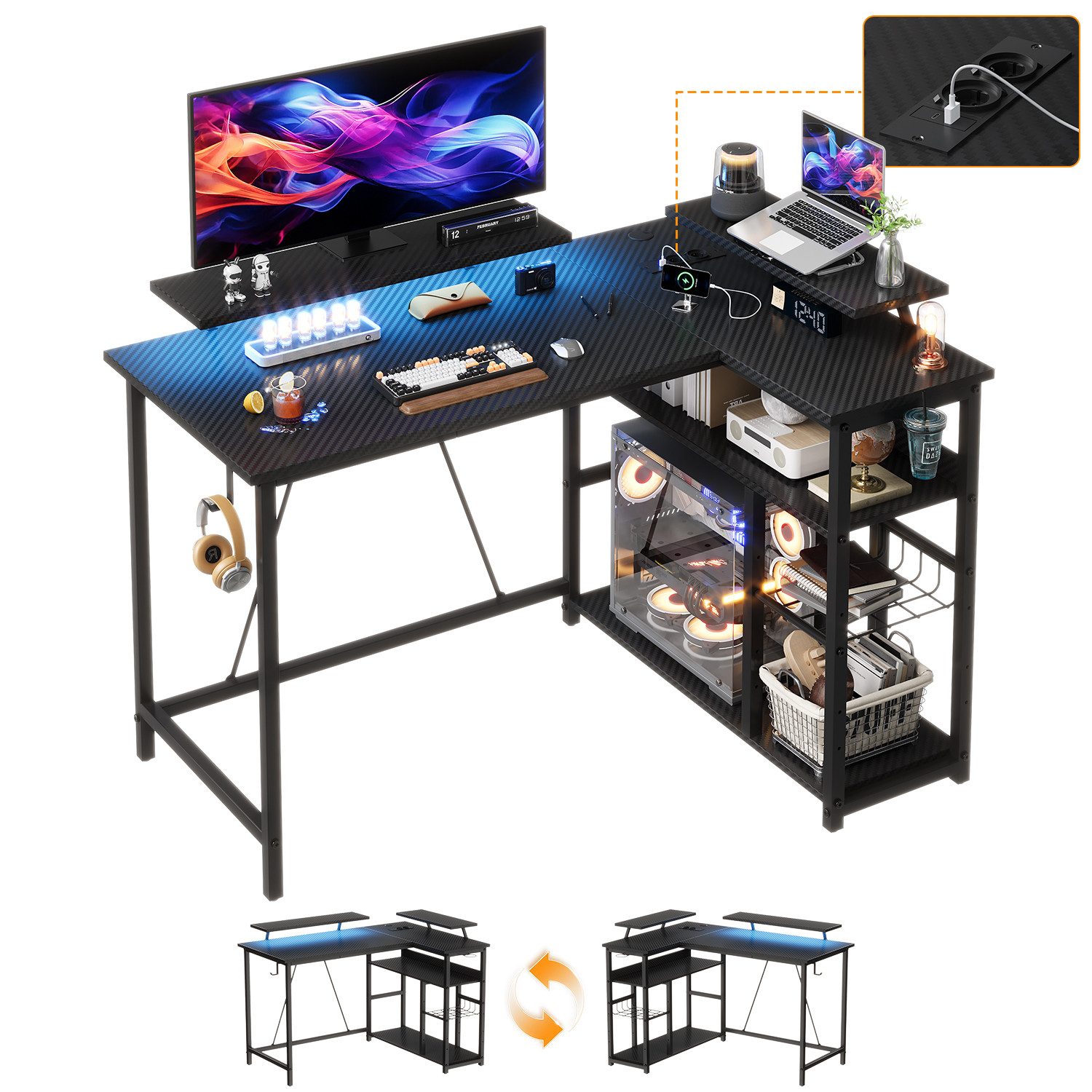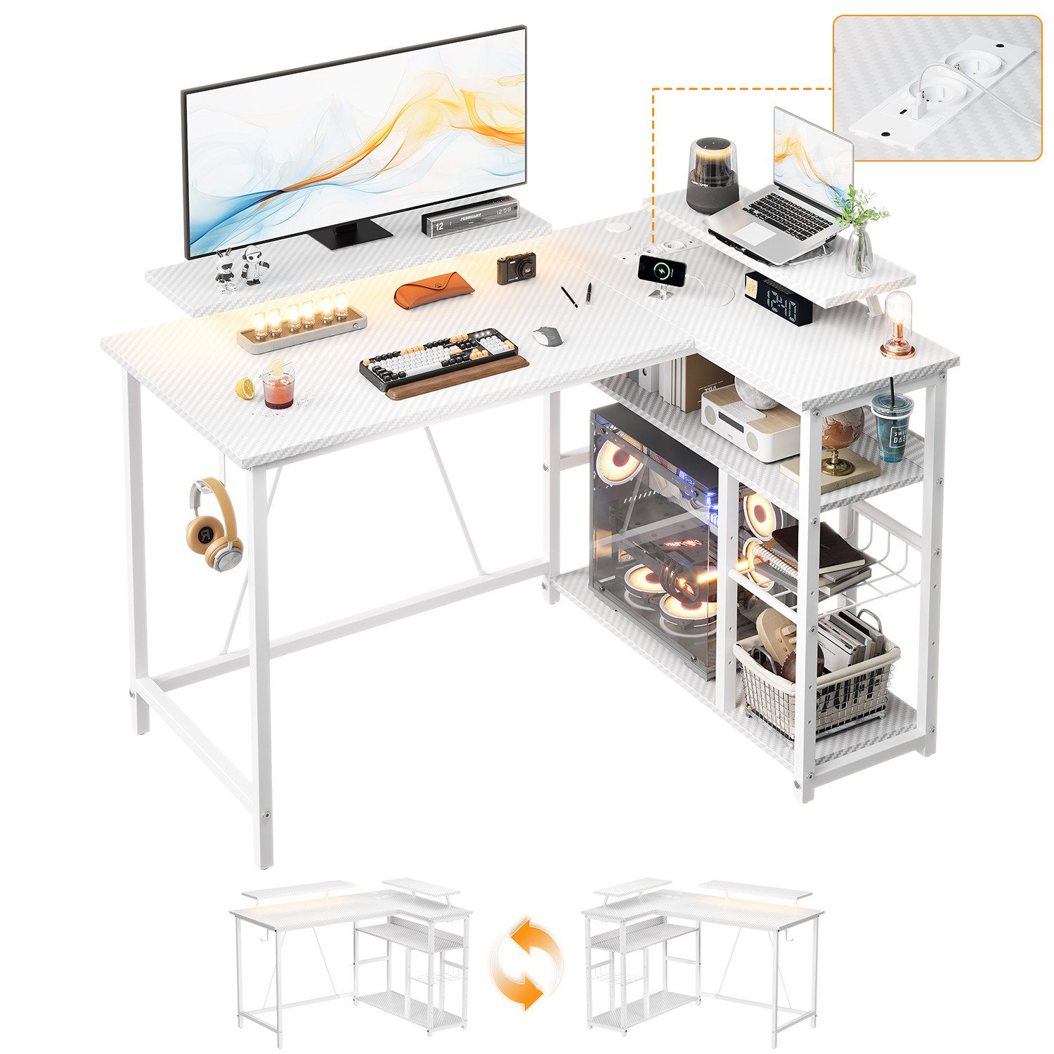 Flexibles Layout für Vielseitigkeit: Das einzigartige Eckdesign spart Platz und bietet gleichzeitig eine größere Nutzfläche. Tischplatten in verschiedenen Größen und Regalkombinationen bieten mühelos Platz für zwei Monitore, Figuren, Bücher und andere Gegenstände.