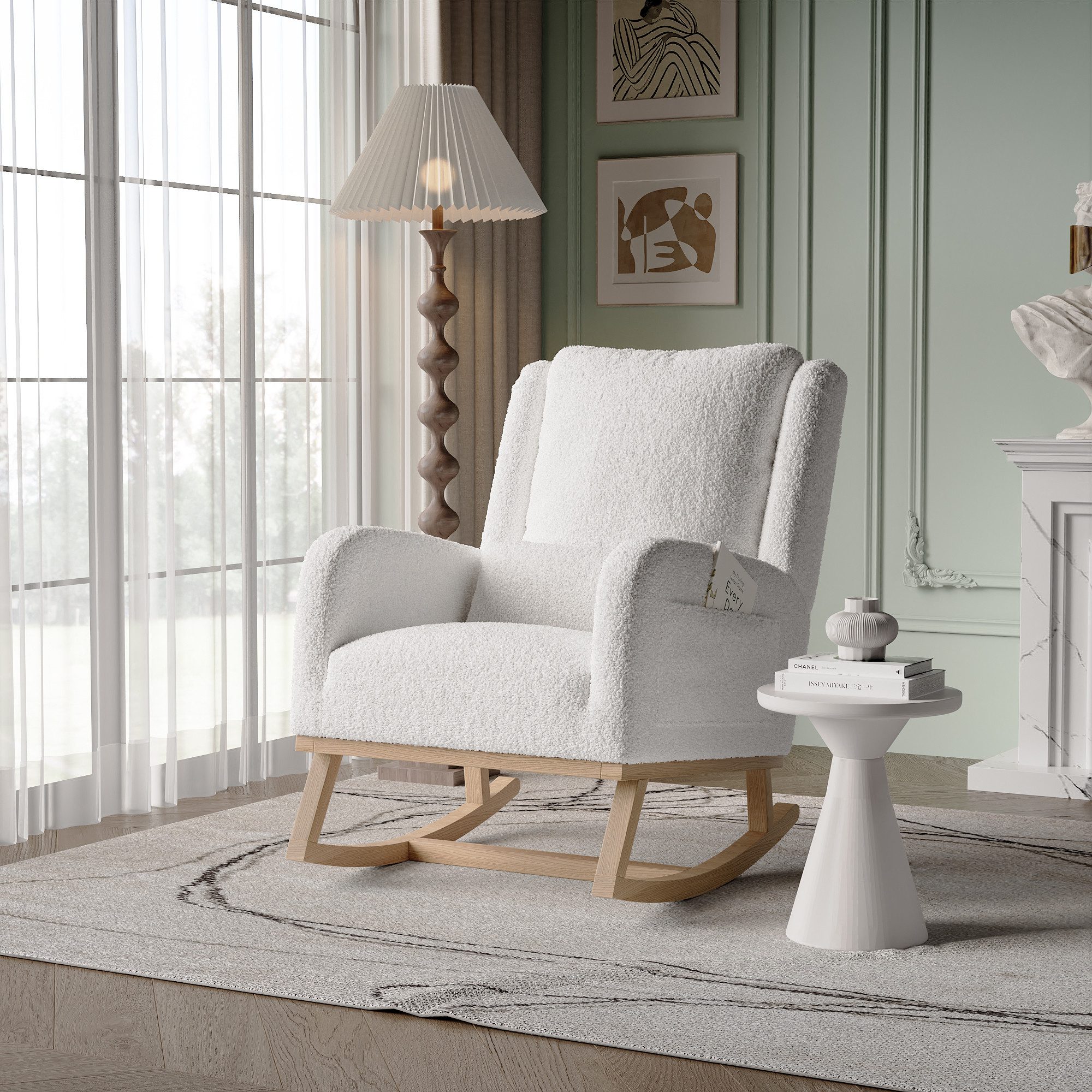 Beige Schaukelstuhl aus Berbervlies mit Buchenholzgestell, 120 kg Tragkraft, Komfortable Polsterung und Ergonomisches Design für Wohnzimmer oder Terrasse