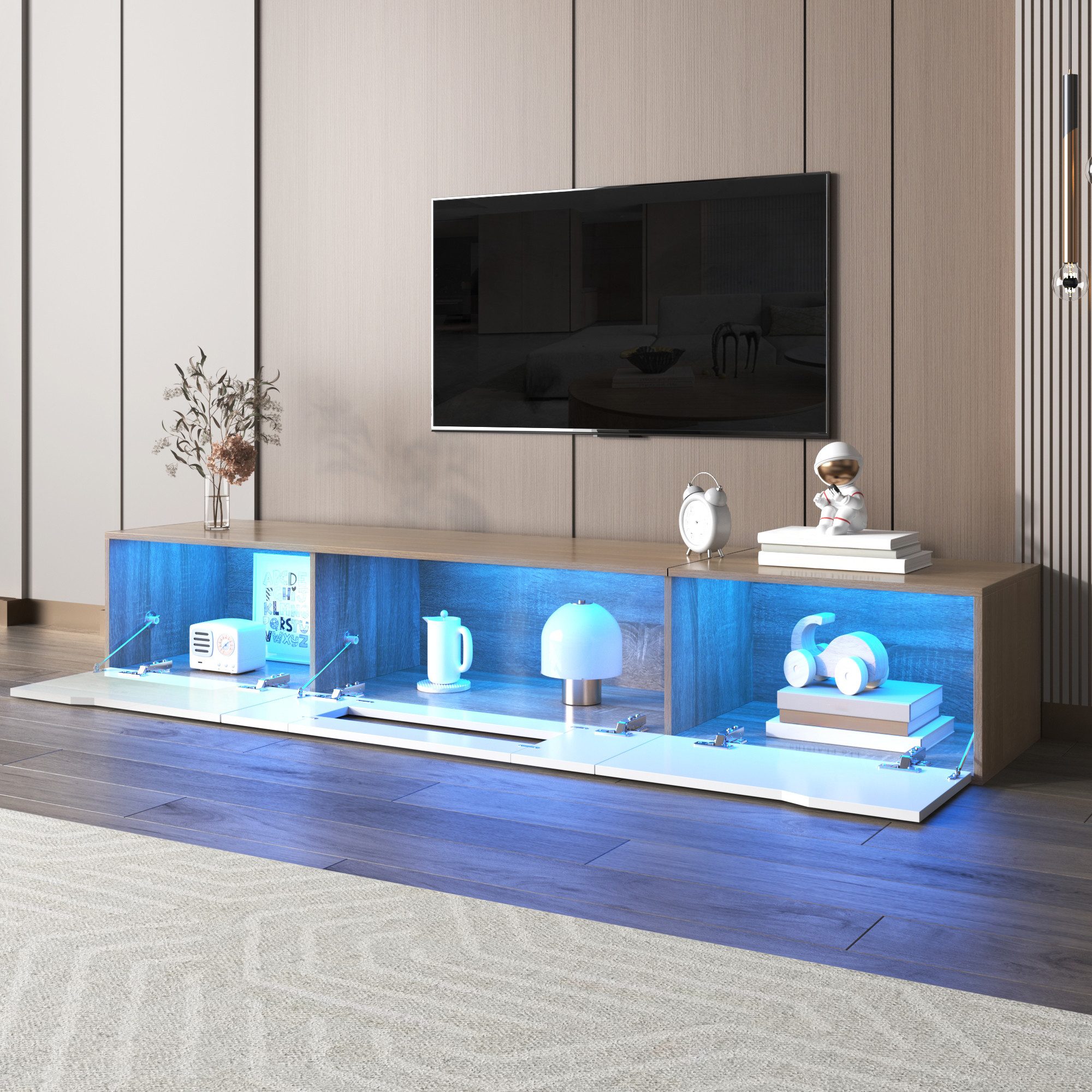 Modernes Design: Dieser TV-Schrank (180 x 35 x 30 cm) vereint Funktionalität mit ästhetischem Stil. Die Kombination aus weißer Hochglanzlackierung und Türverkleidungen aus Naturholz sorgt für ein zeitloses Aussehen und passt perfekt in jedes moderne Zuhause.