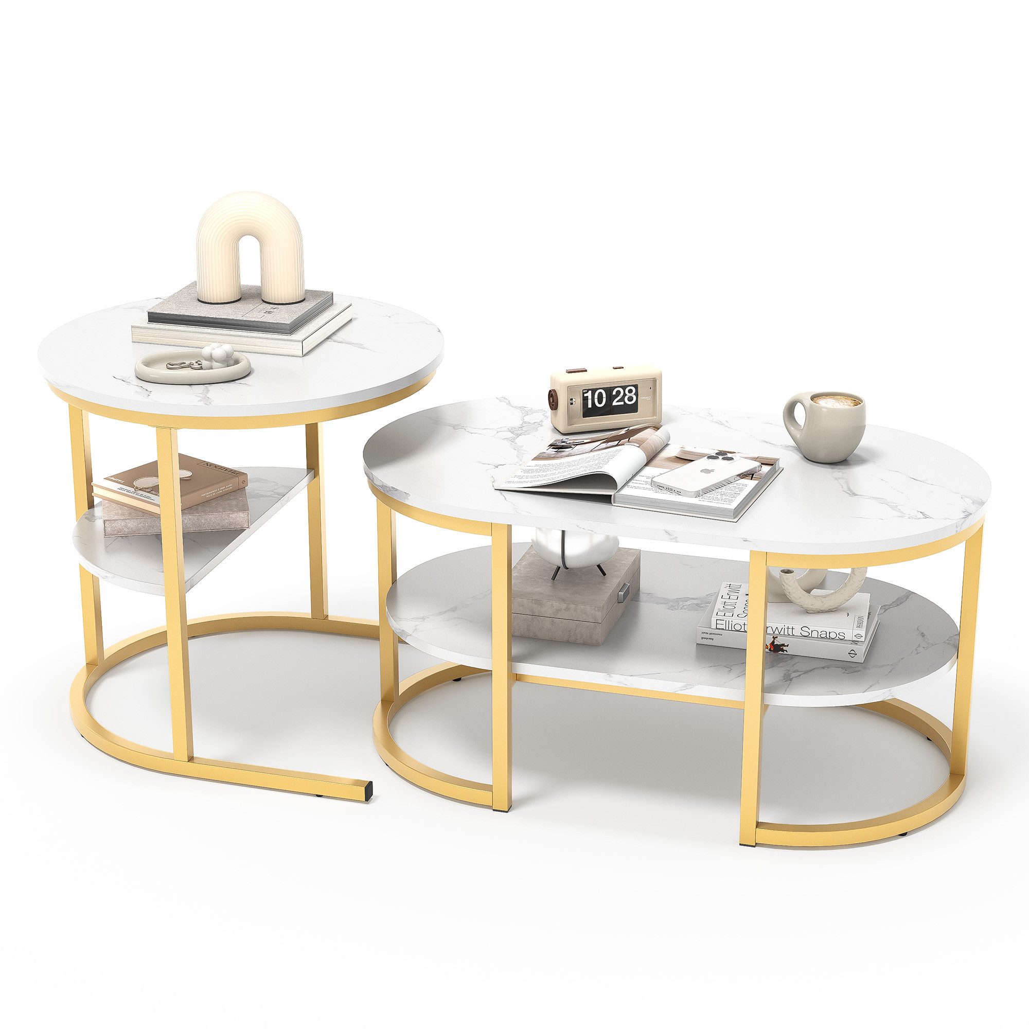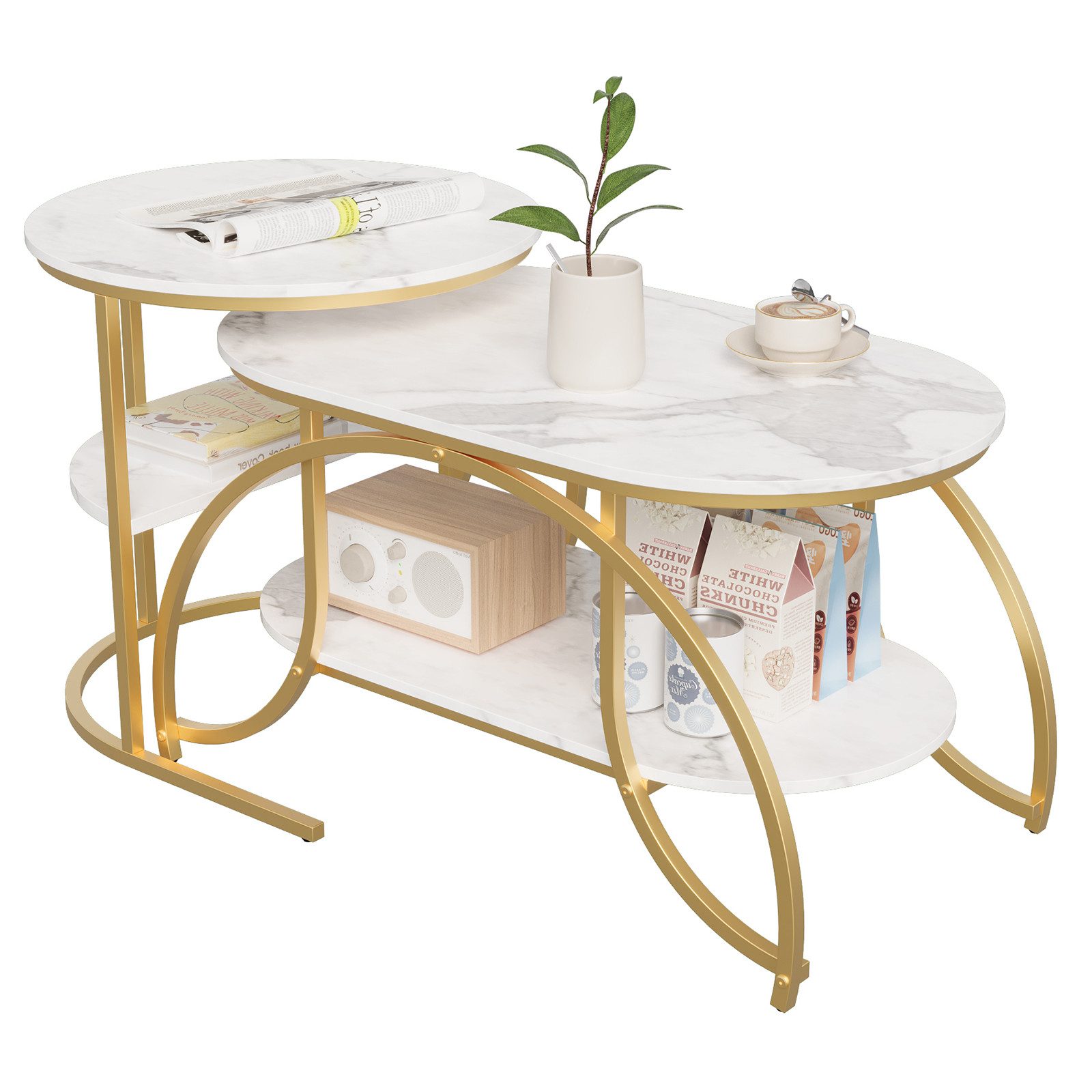 Einzigartiges Marmormuster mit sanften ovalen Kurven und goldenen Metallbeinen bilden einen eleganten Couchtisch.