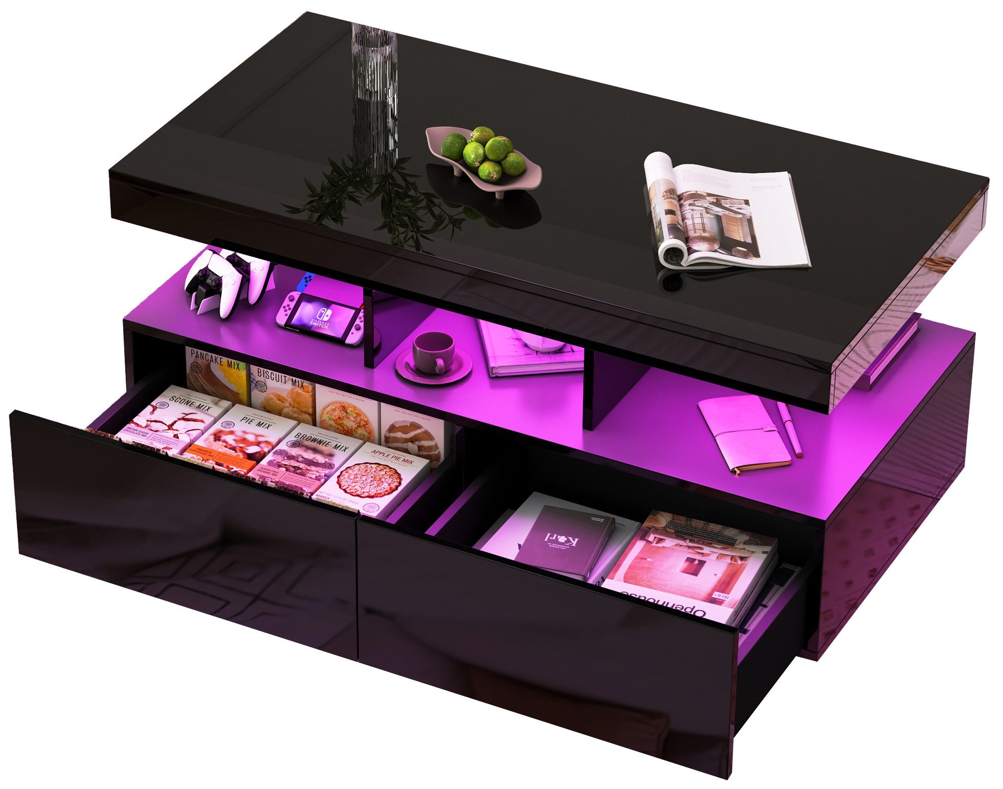 Dieser Couchtisch ist durchdacht gestaltet und verfügt über zwei geräumige Schubladen und sechs praktische Ablagefächer. Ob Fernbedienung, Zeitschriften oder Snacks – hier finden Sie alles bequem unter und sorgen für Ordnung im Wohnzimmer.