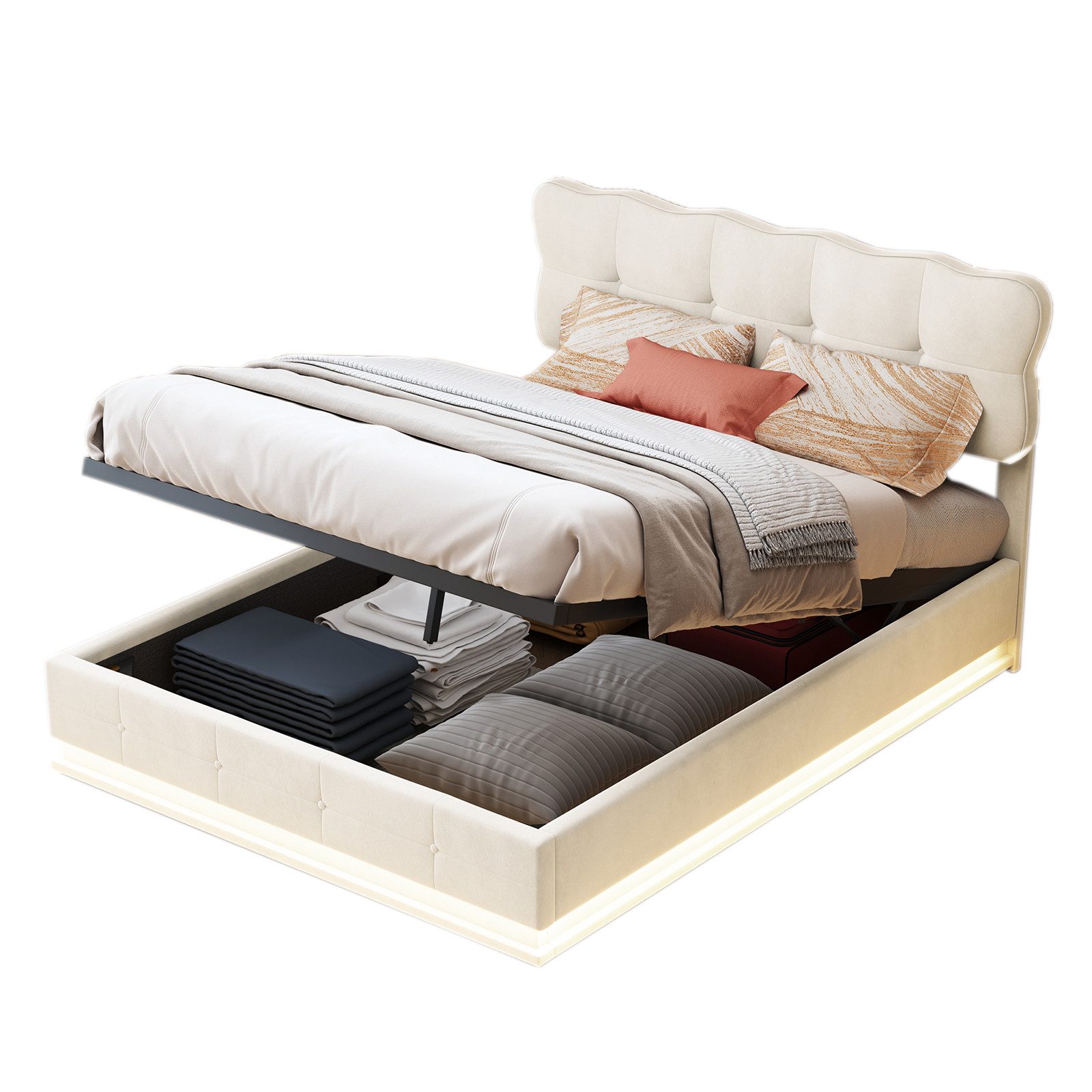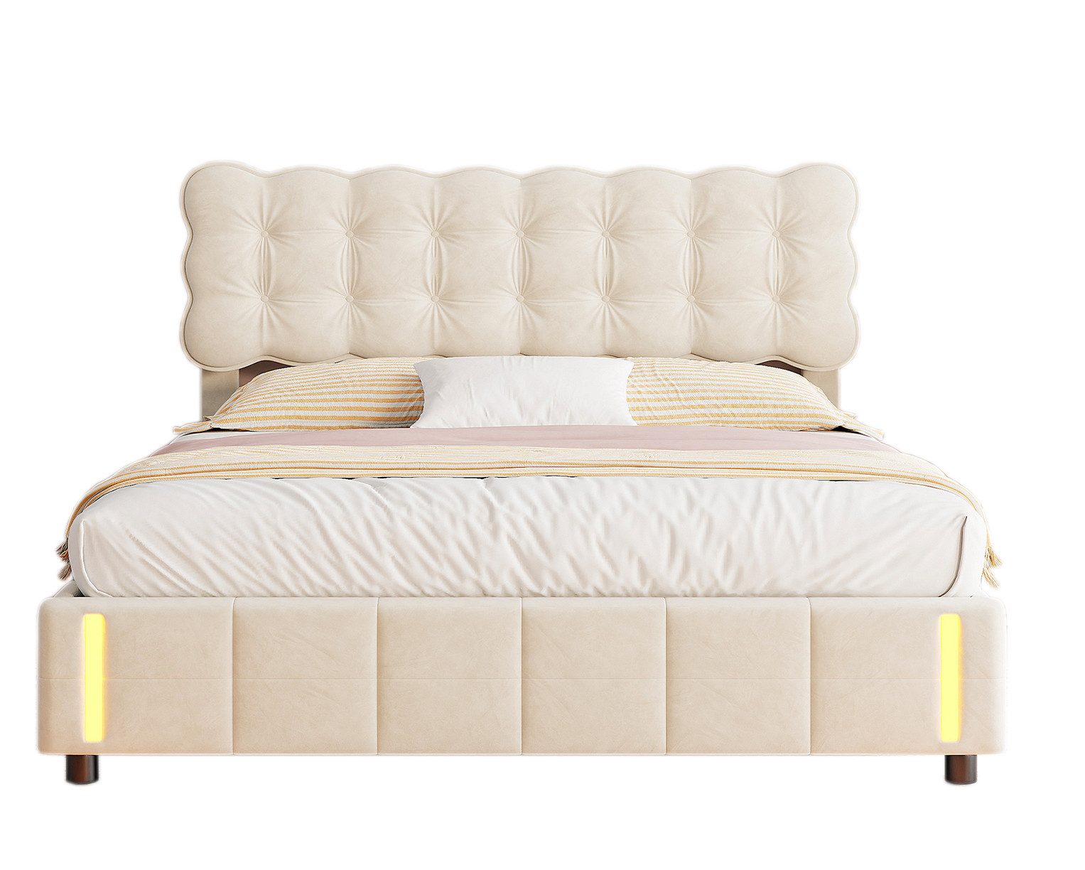 Dieses Polsterbett eignet sich perfekt für das Hauptschlafzimmer oder Gästezimmer. Der großzügige Stauraum unter dem Bettrahmen ermöglicht die Aufbewahrung von Bettwäsche, Decken, Kissen und vielem mehr und sorgt so für Ordnung im Zimmer. Das Bett mit hydraulischem Stauraum ist von LED-Leuchten umgeben und sorgt für eine romantische und komfortable Nachtruhe.